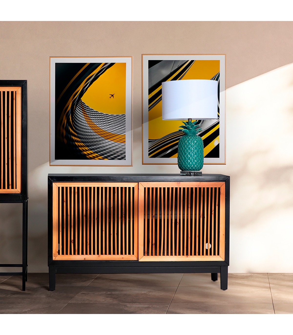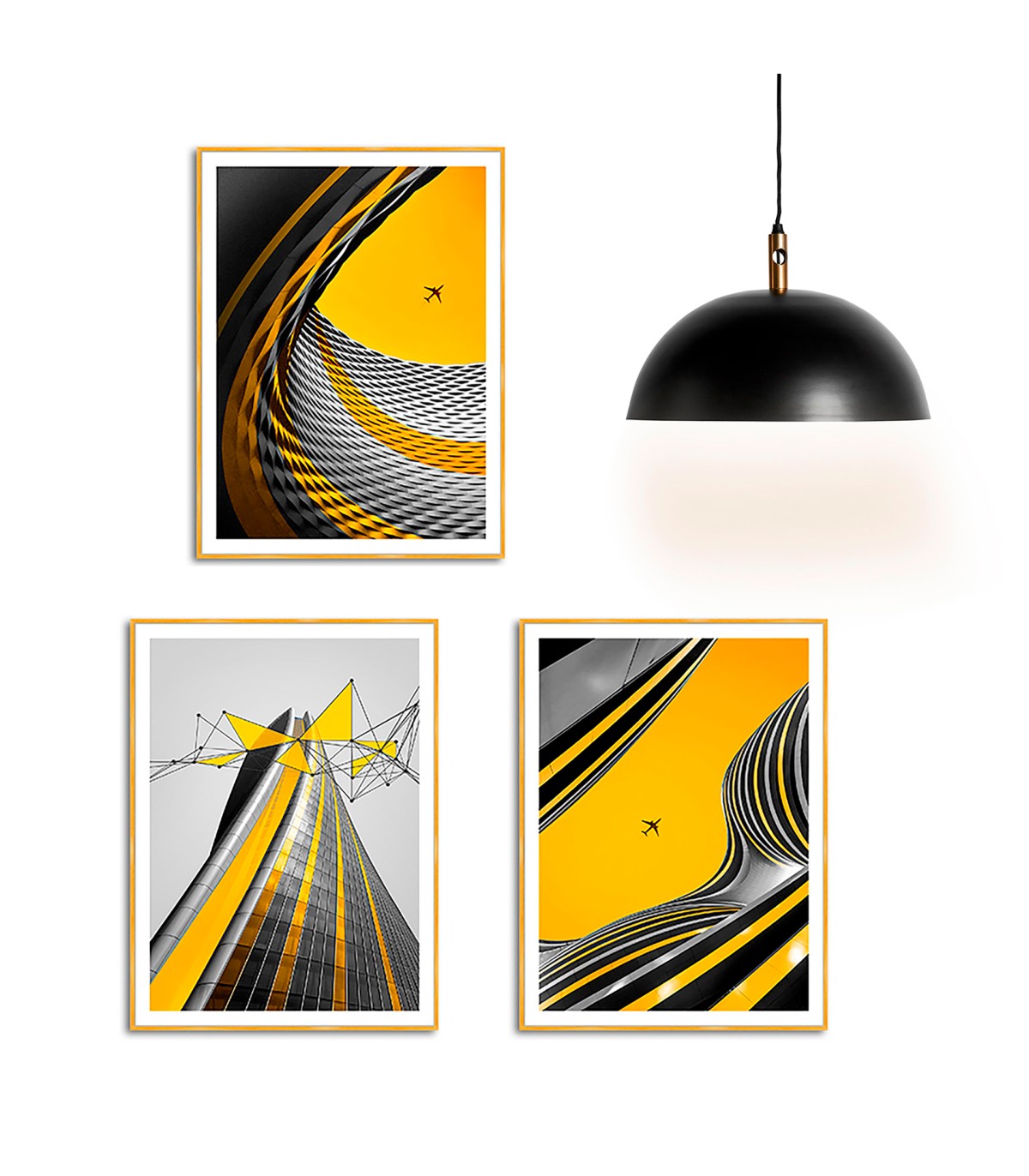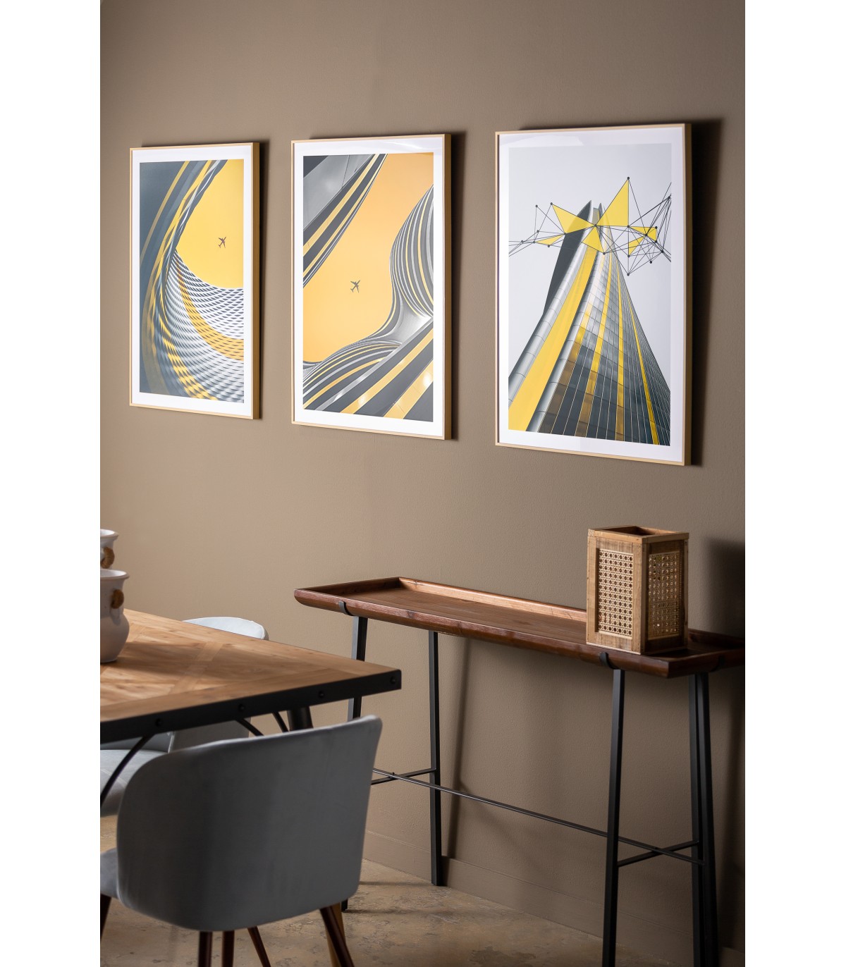 Cuadro j/3 janah, en color amarillo impreso, de estilo contemporáneo. Fabricado en metacrilato, combinado con madera dm.