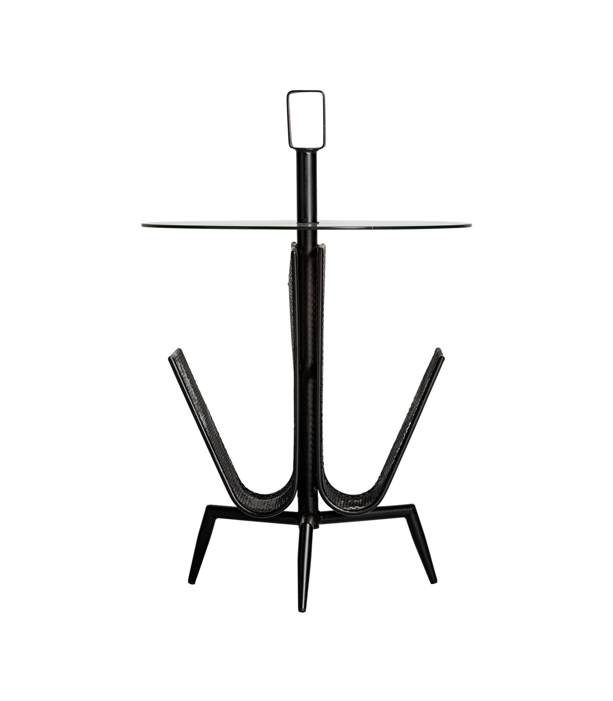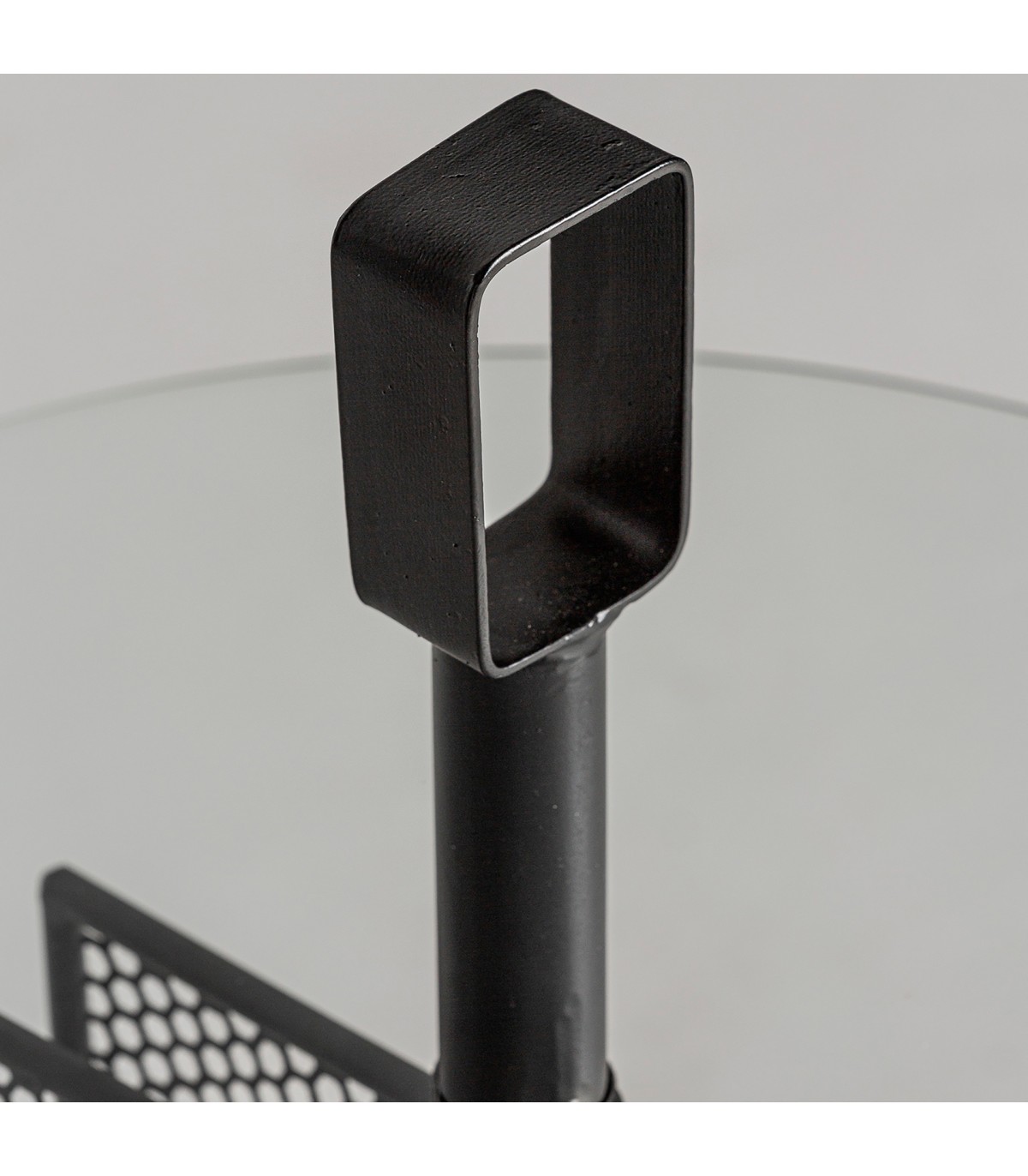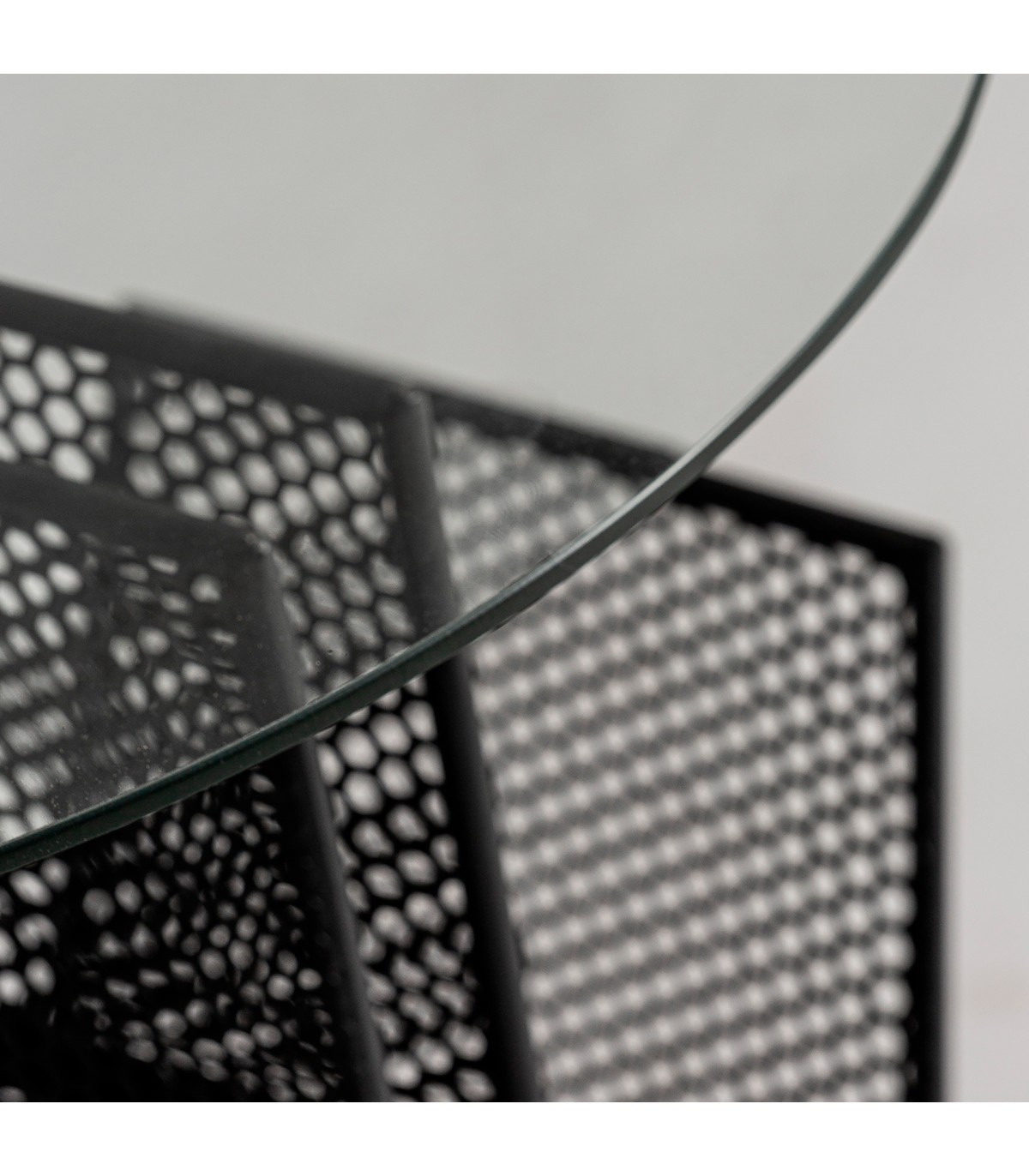 Mesa auxiliar fussen, en color negro, de estilo art deco. Fabricado en hierro, combinado con vidrio. Producto desmontable.