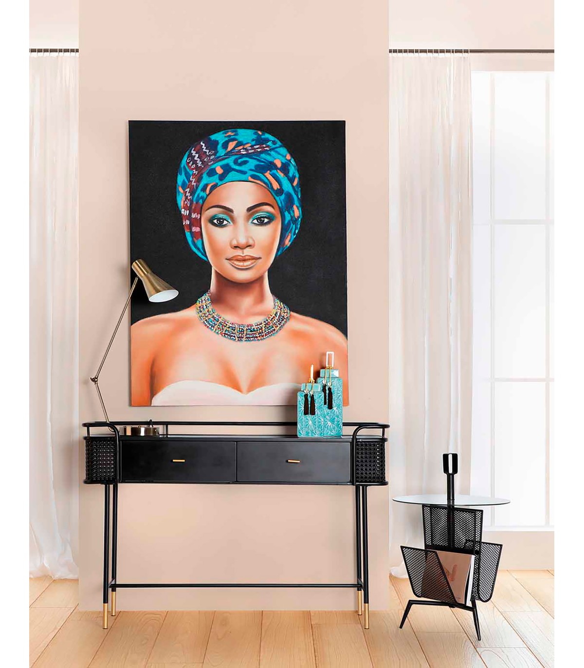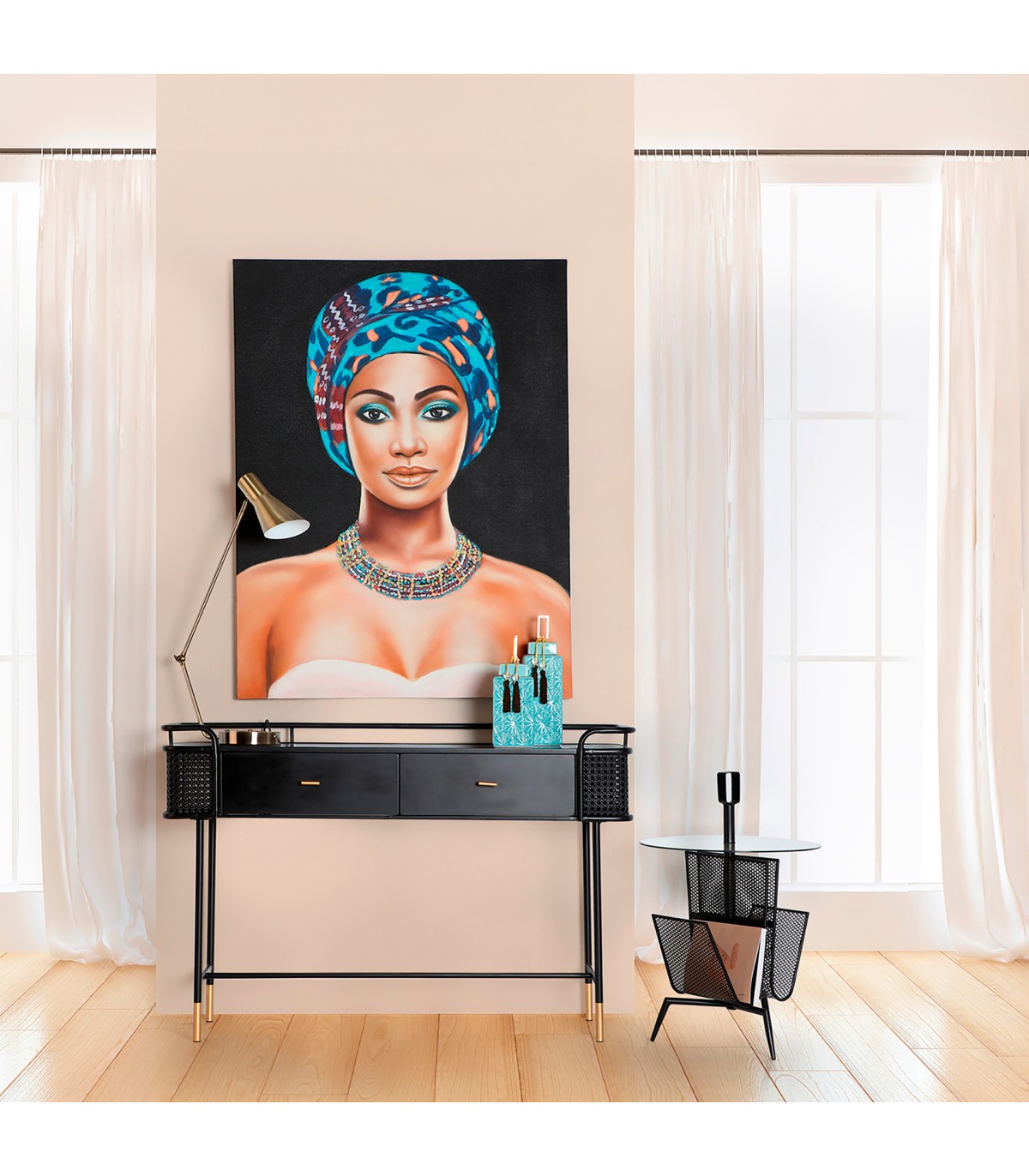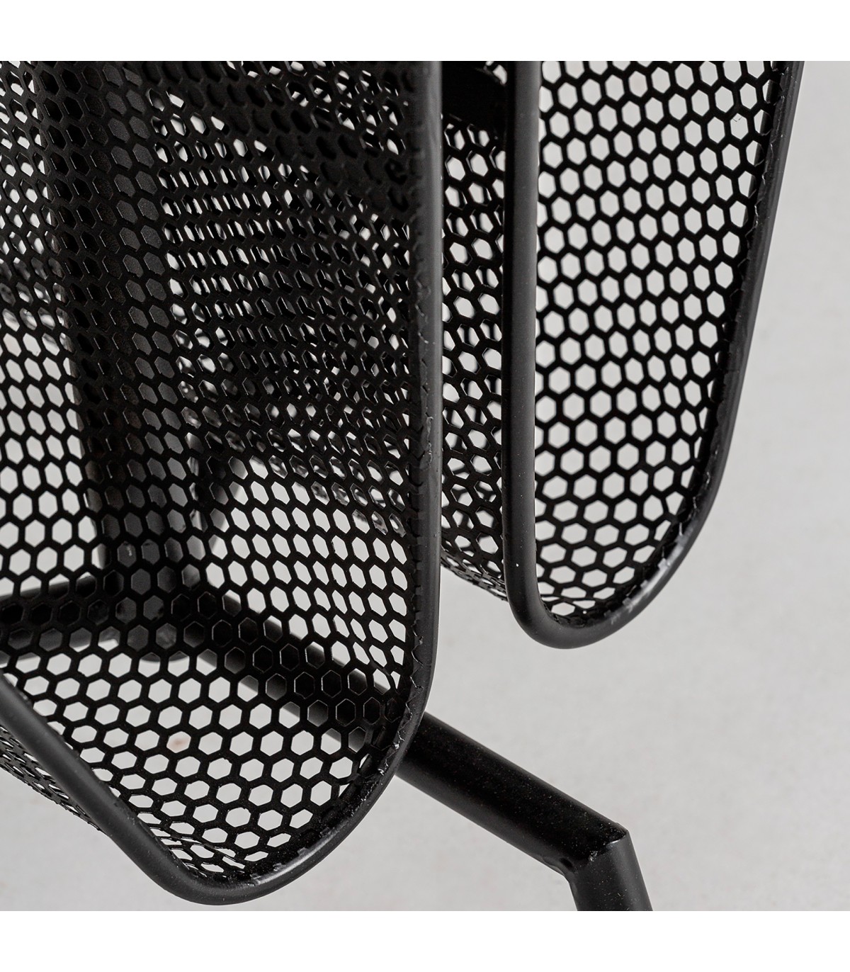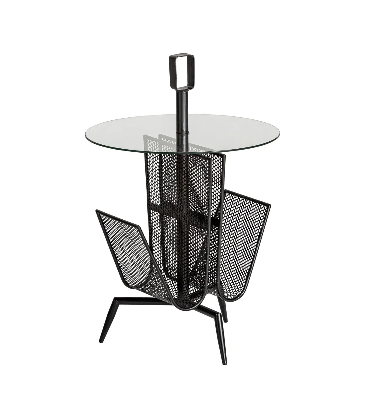 Mesa auxiliar fussen, en color negro, de estilo art deco. Fabricado en hierro, combinado con vidrio. Producto desmontable.