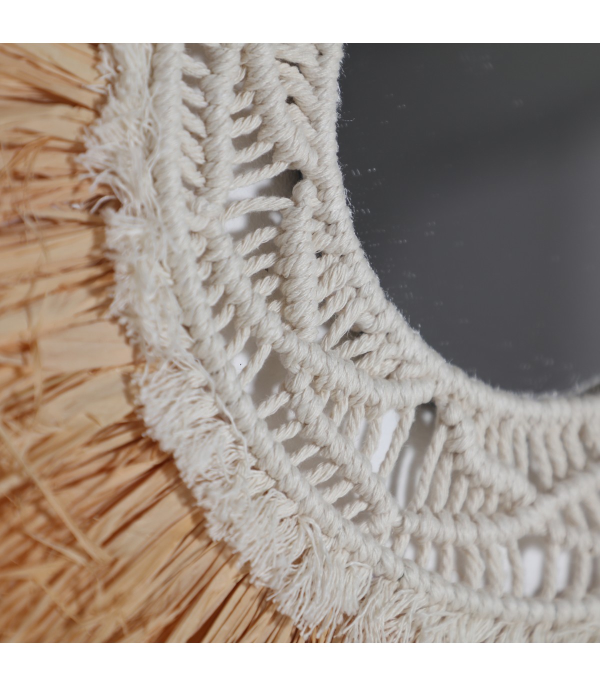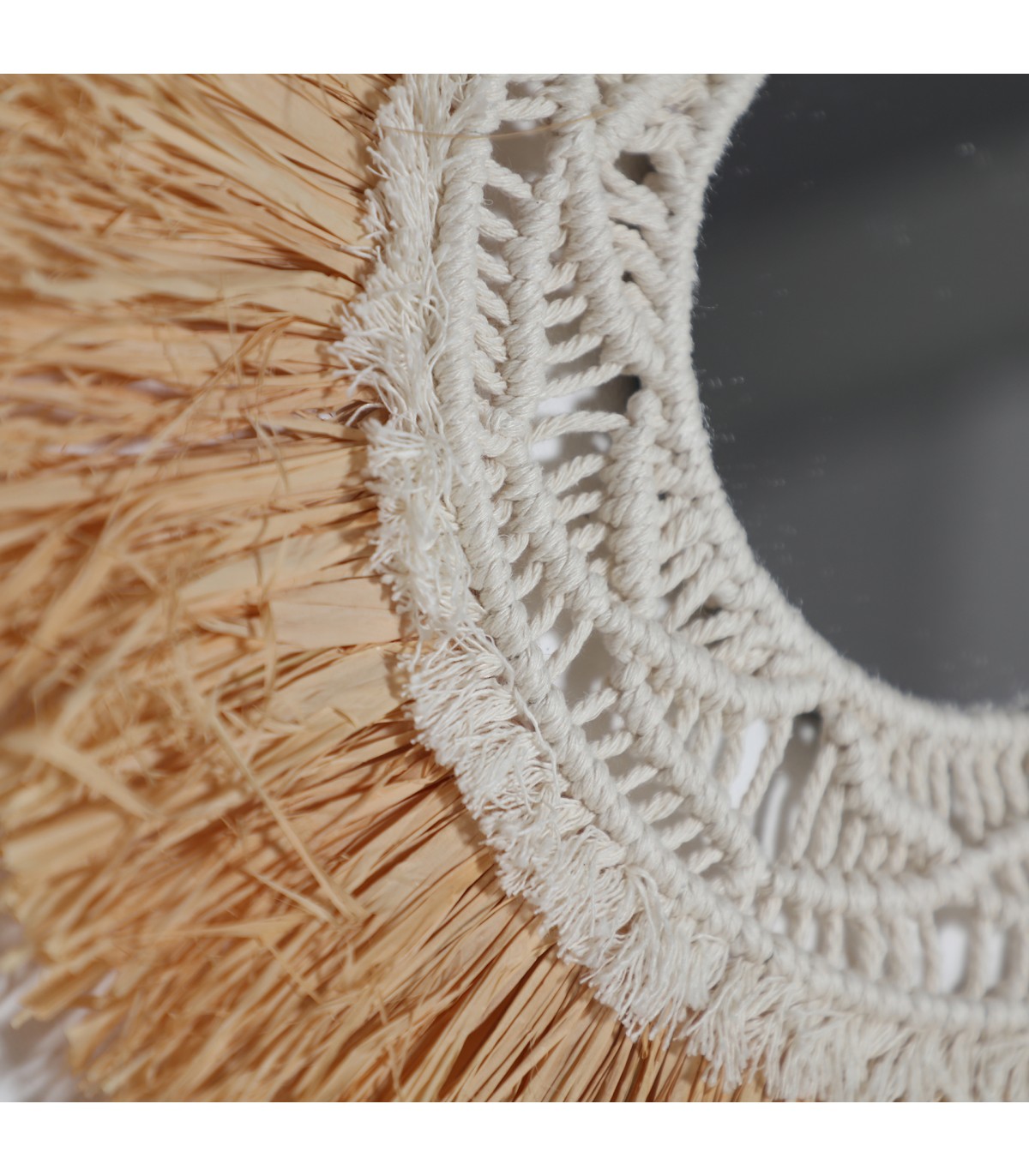 Espejo kasses, en color natural, de estilo boho. Fabricado en rafia, combinado con plástico y cuerda. Espejo plástico.
