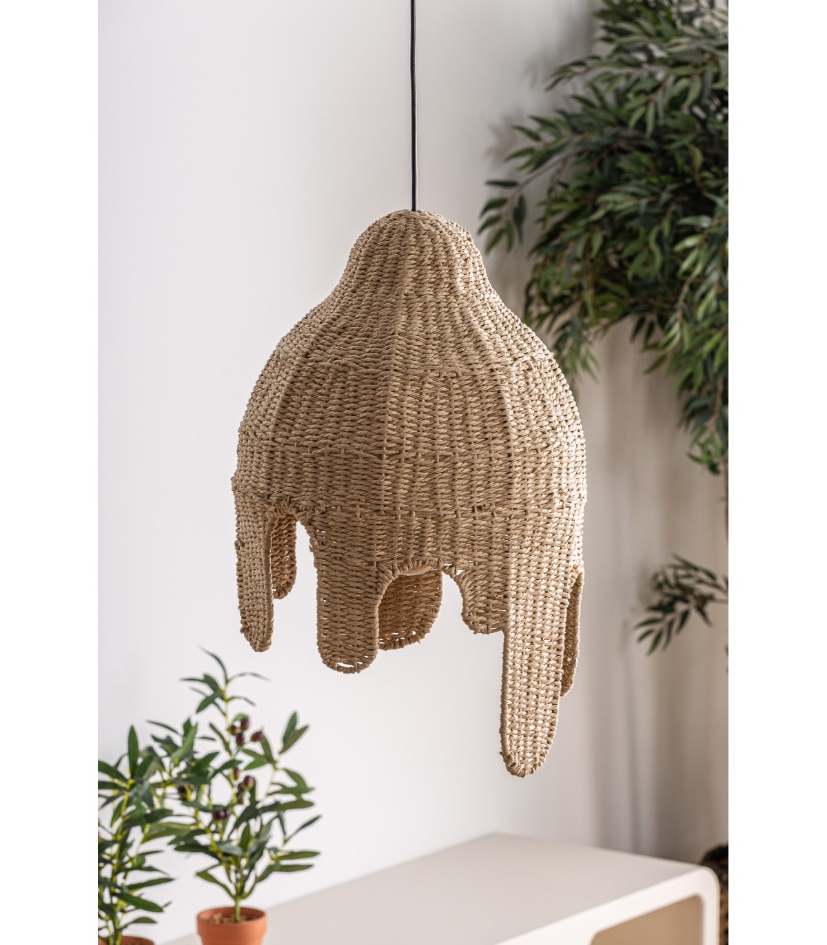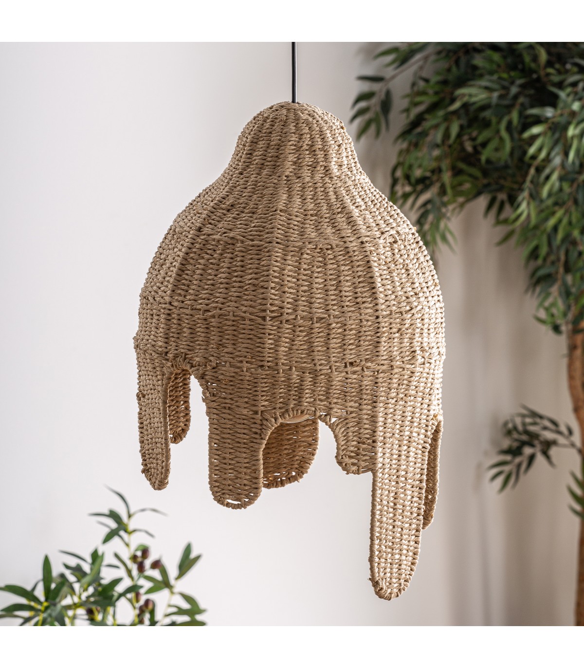 Lámpara de techo helle, en color natural, de estilo boho. Fabricado en fibra natural, combinado con cuerda y hierro.