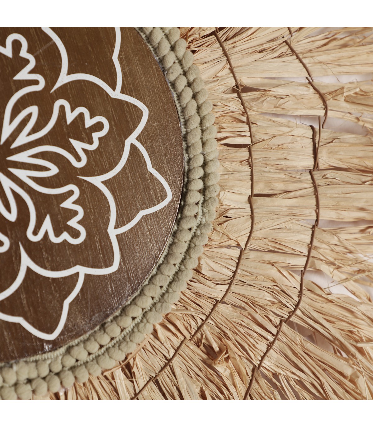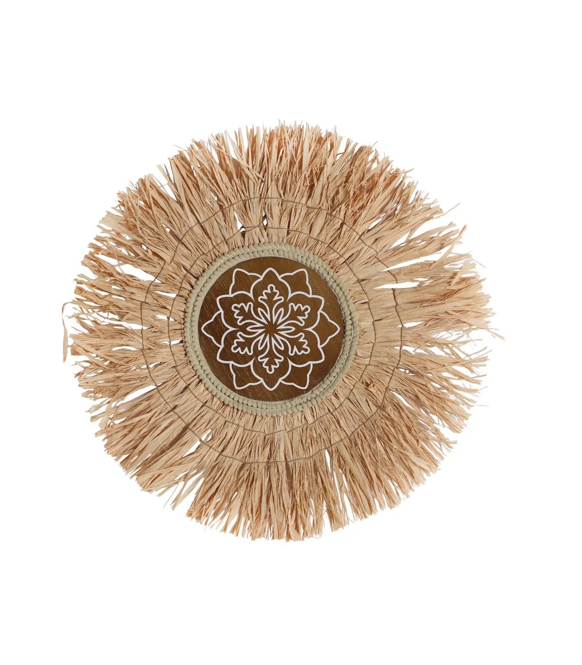 Panel decorativo kasses, en color natural, de estilo boho. Fabricado en fibra natural, combinado con rafia y madera dm.