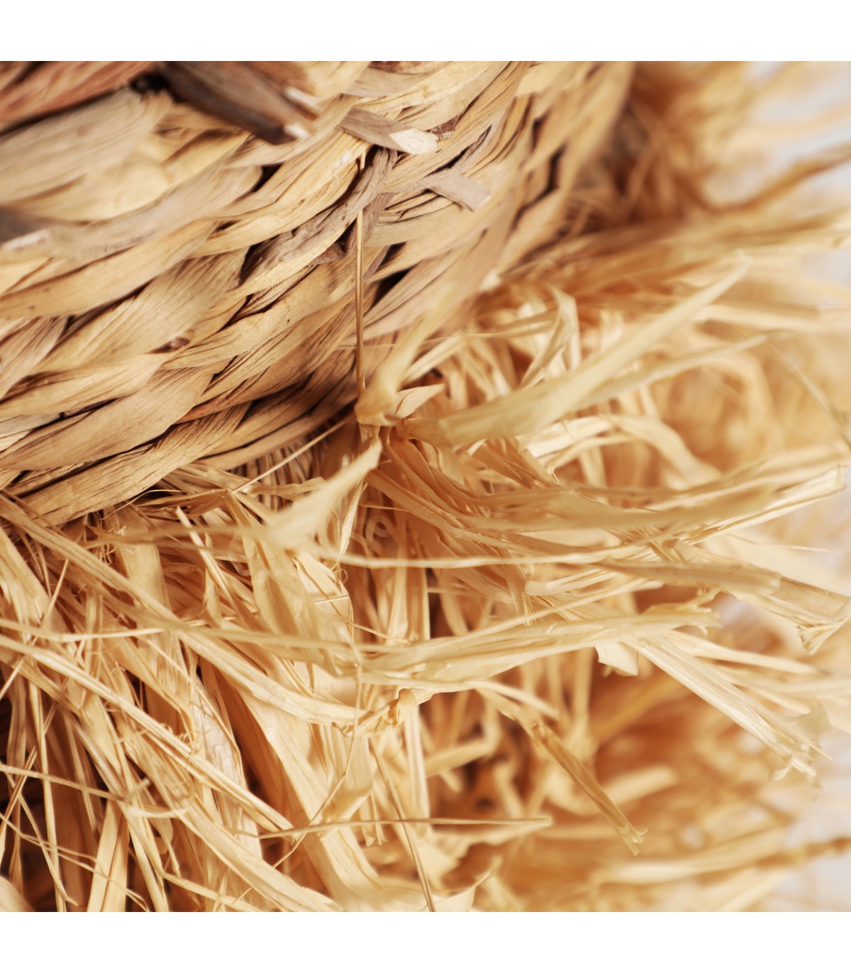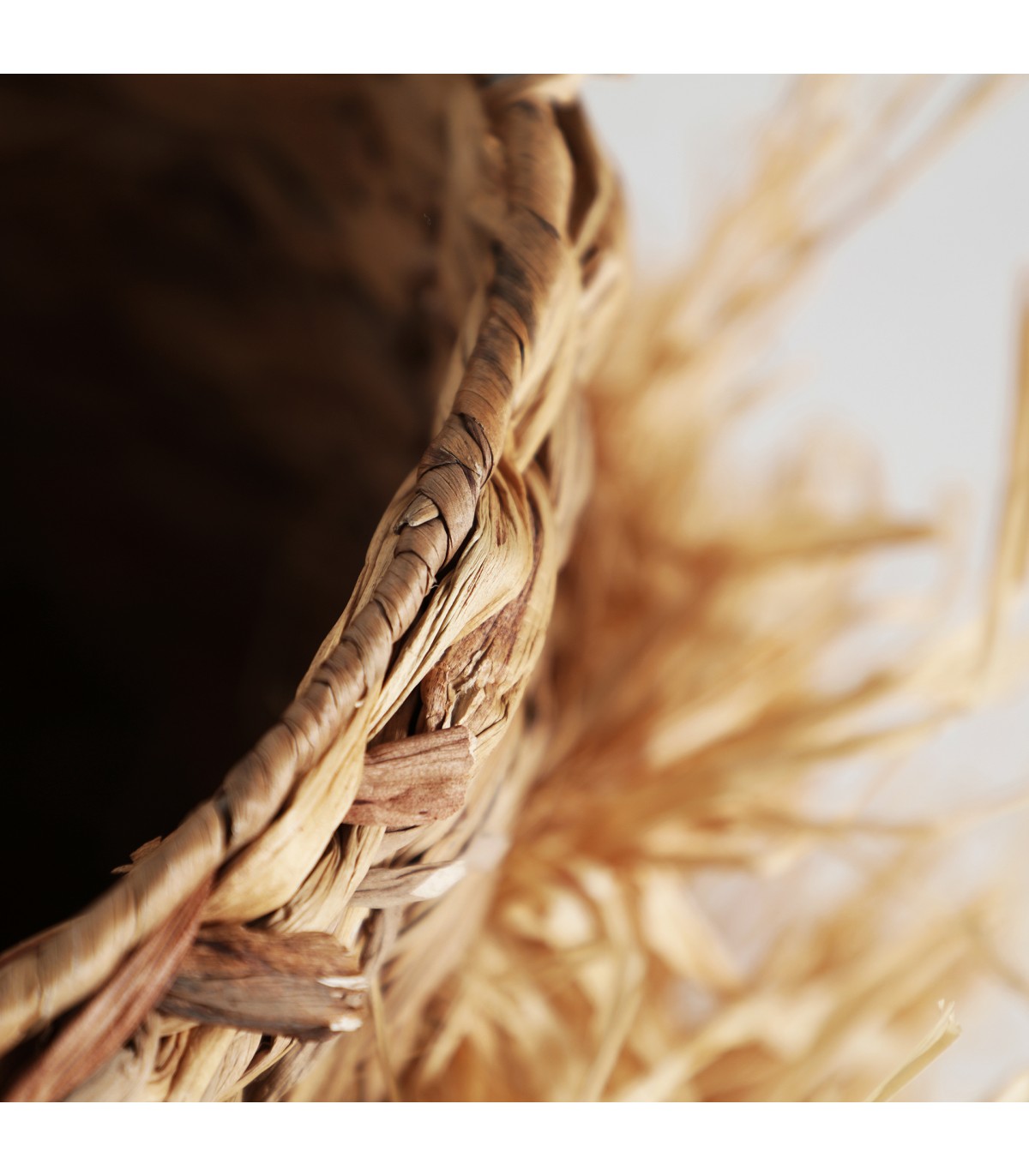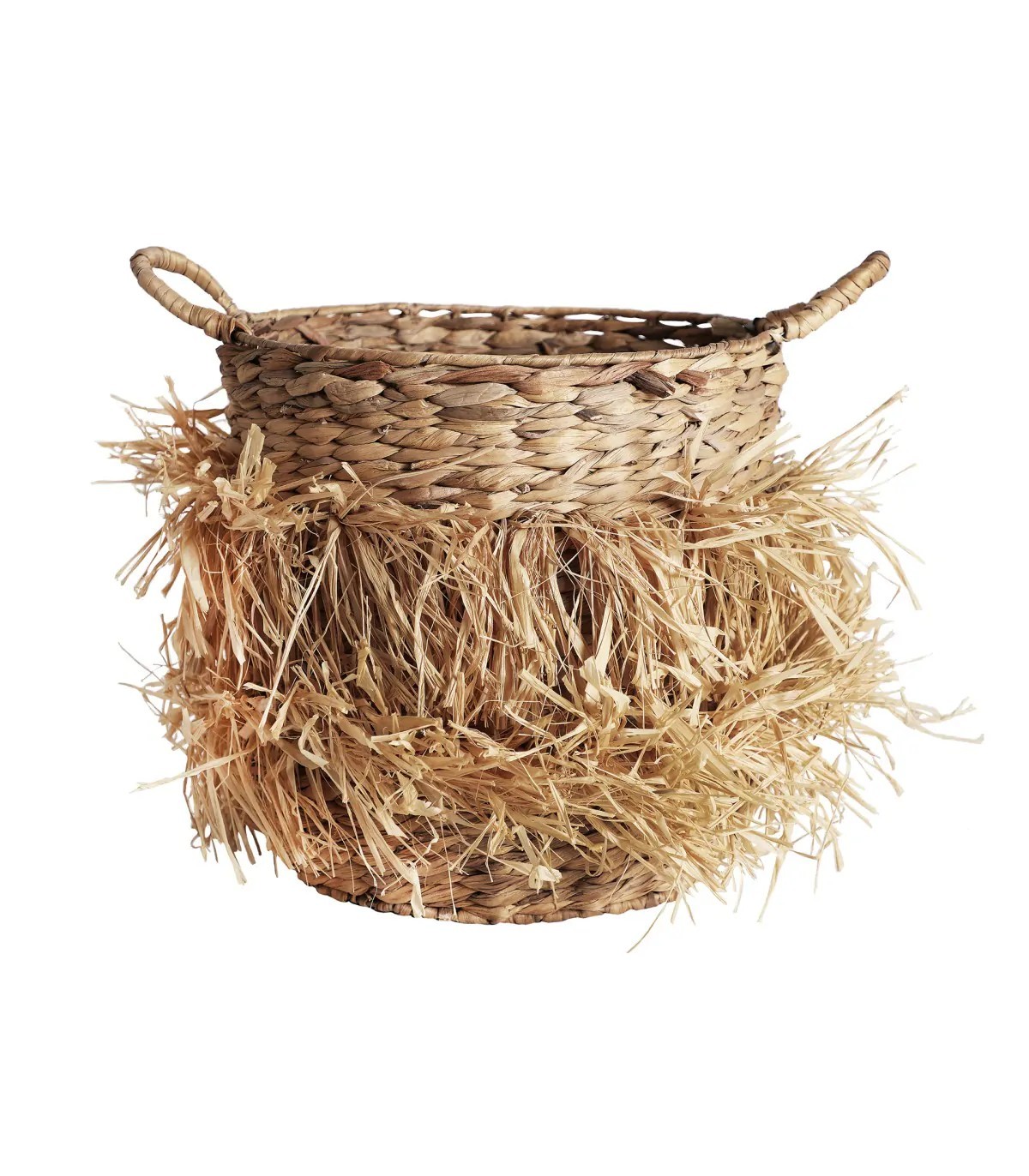 Cesto kasses, en color natural, de estilo boho. Fabricado en fibra natural, combinado con rafia y hierro.