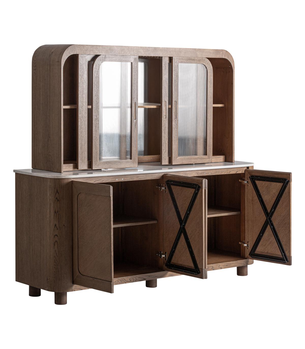 Mueble bar fabricado en madera roble en color marrón combinado con mármol en color blanco y cristal en color transparente.