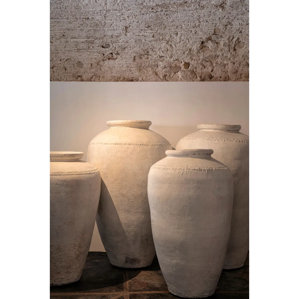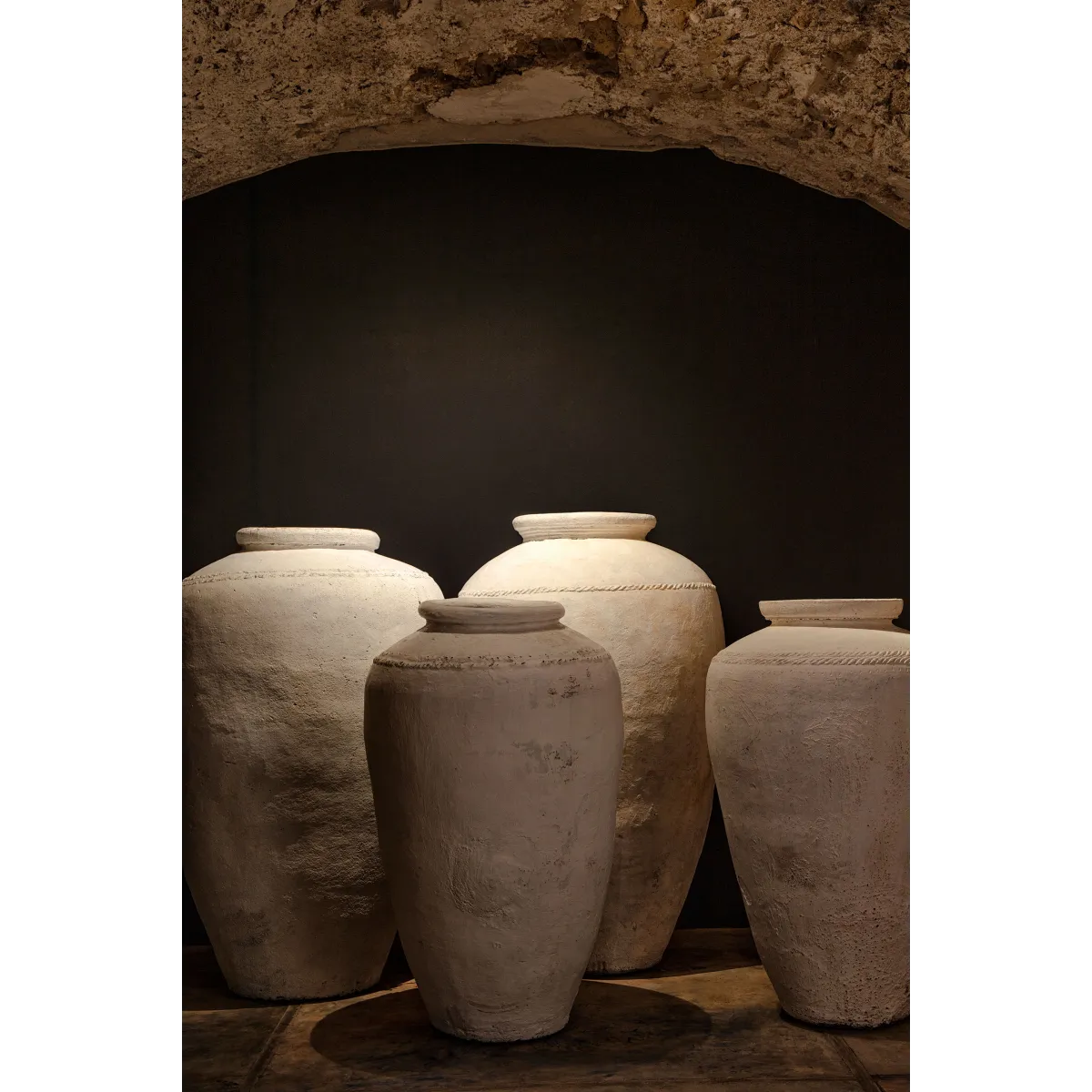 Tinaja mimetiz de estilo colonial fabricado en terracota en color blanco con acabado envejecido.