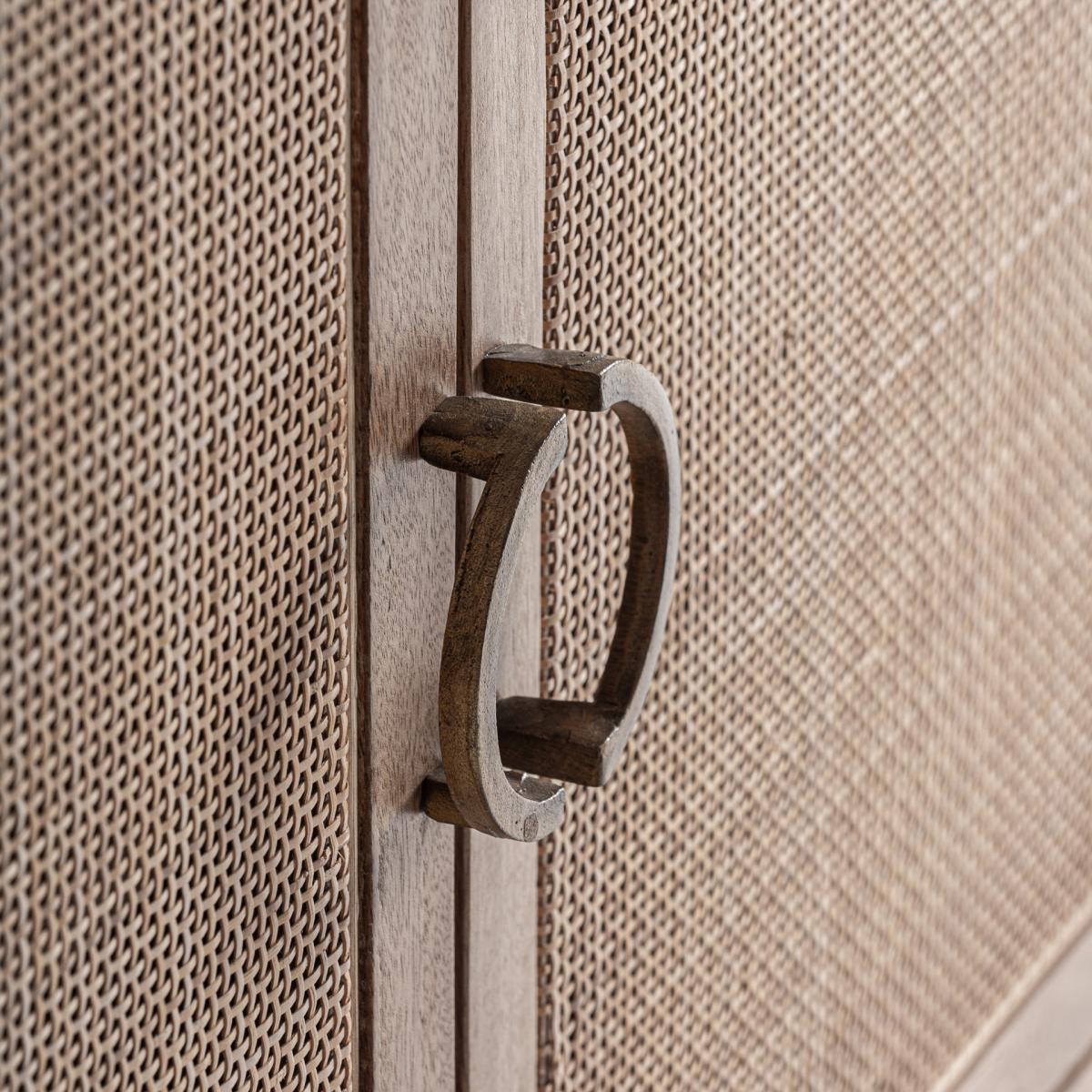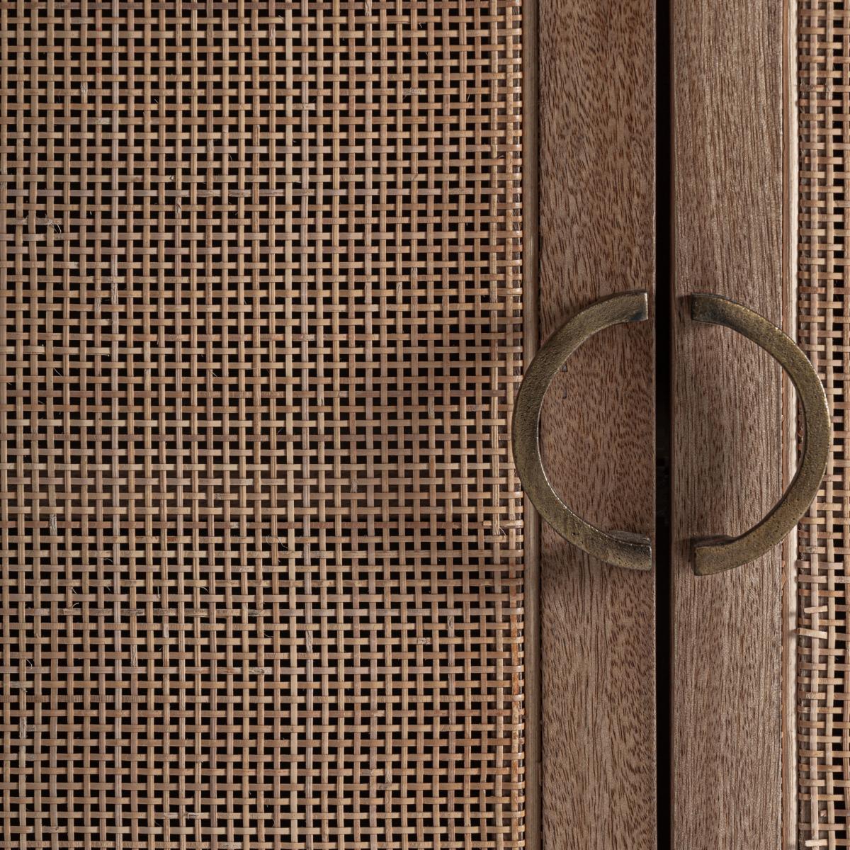 Aparador Beckley de estilo nórdico fabricado en madera de mango en color marrón combinado con ratán en color marrón claro y madera dm. Producto desmontable.