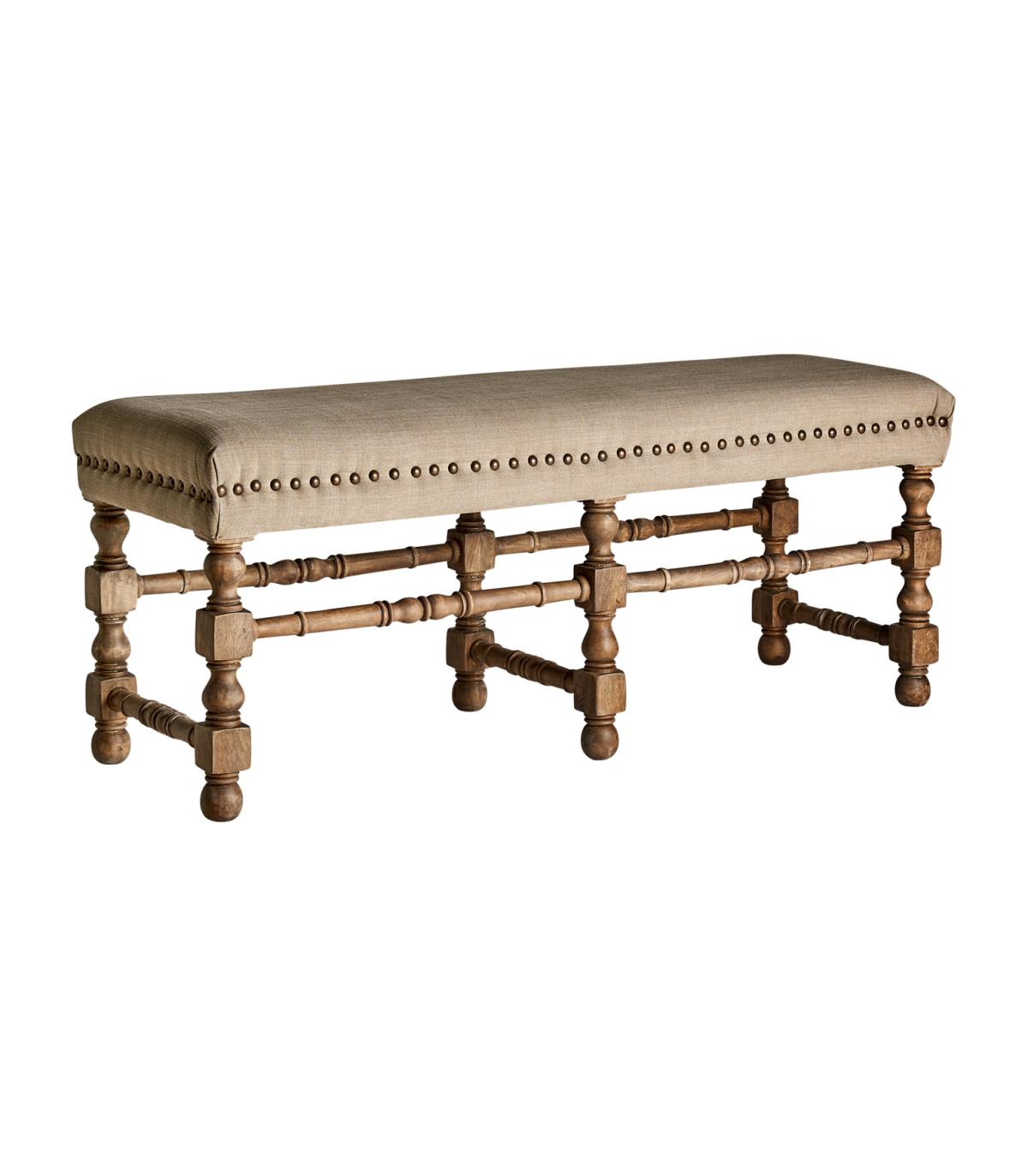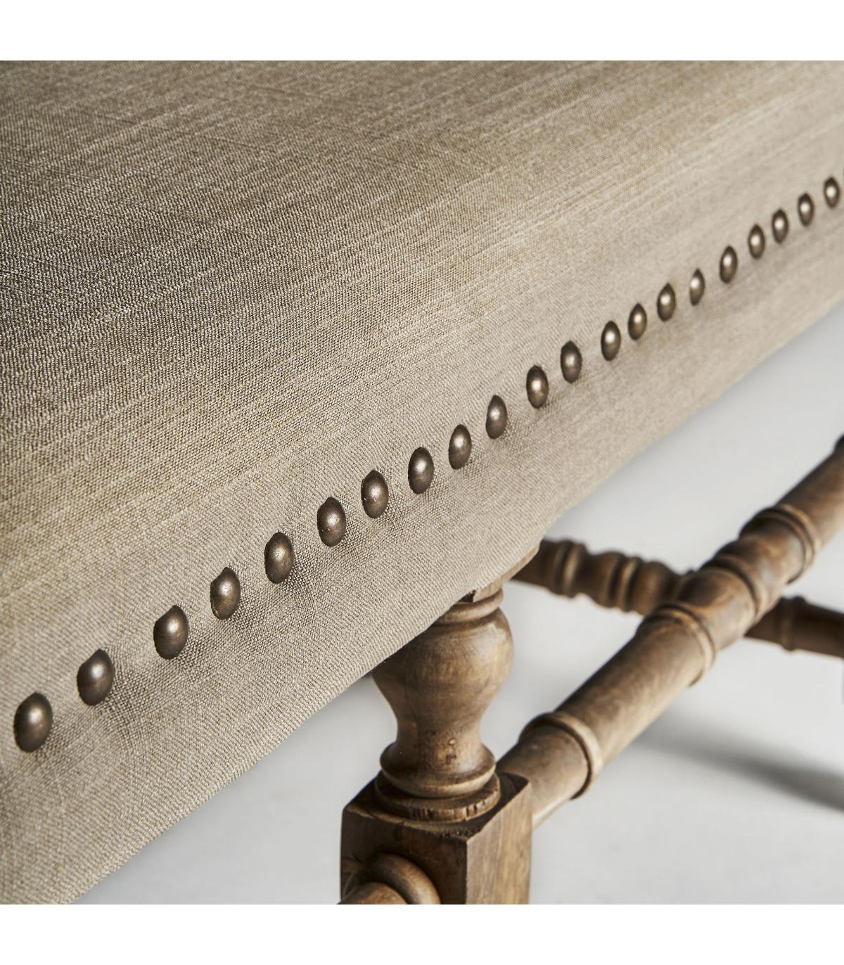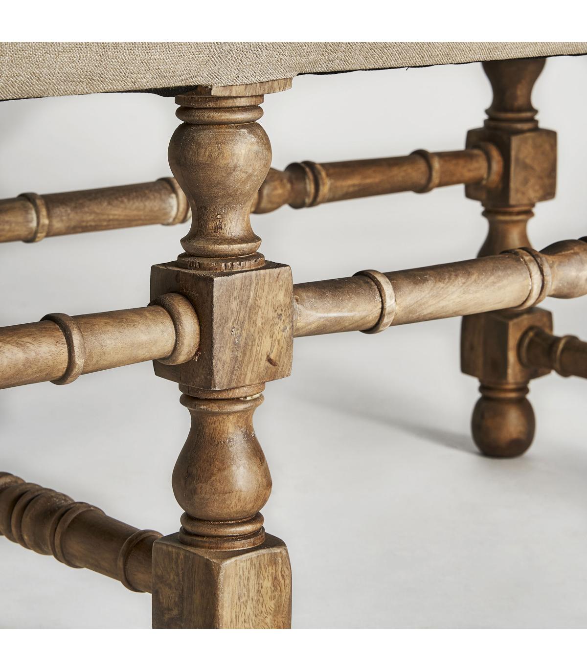 Pie de cama wangen de estilo contemporáneo fabricado en madera de mango en color marrón combinado con lino y espuma.
