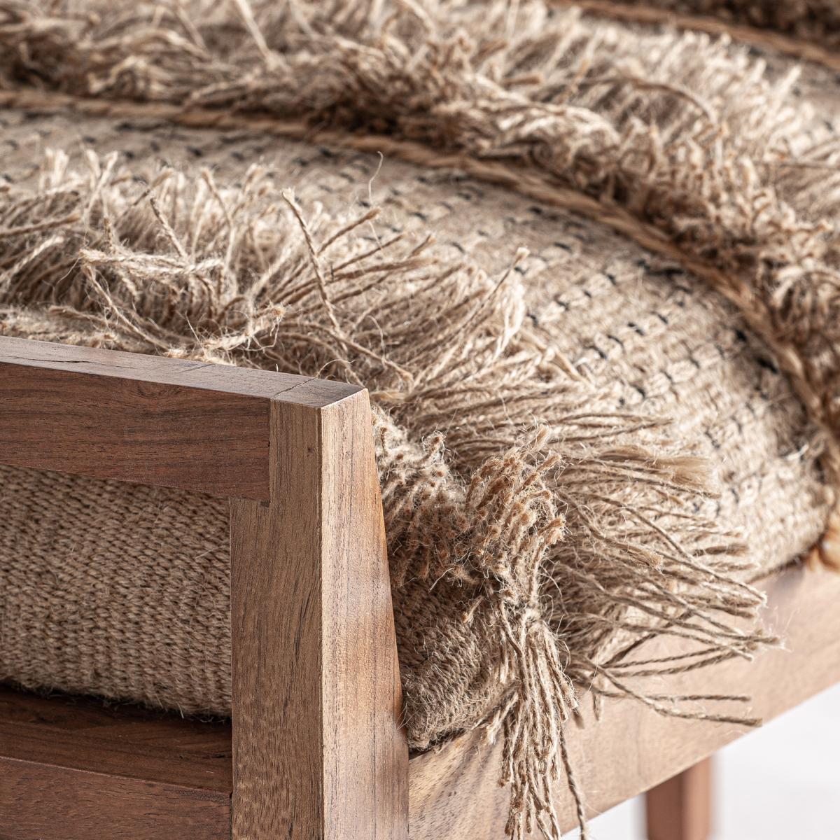 Banco fabricado en madera de mango en color marrón claro combinado con algodón en color tonos en marrón y yute en color beige.