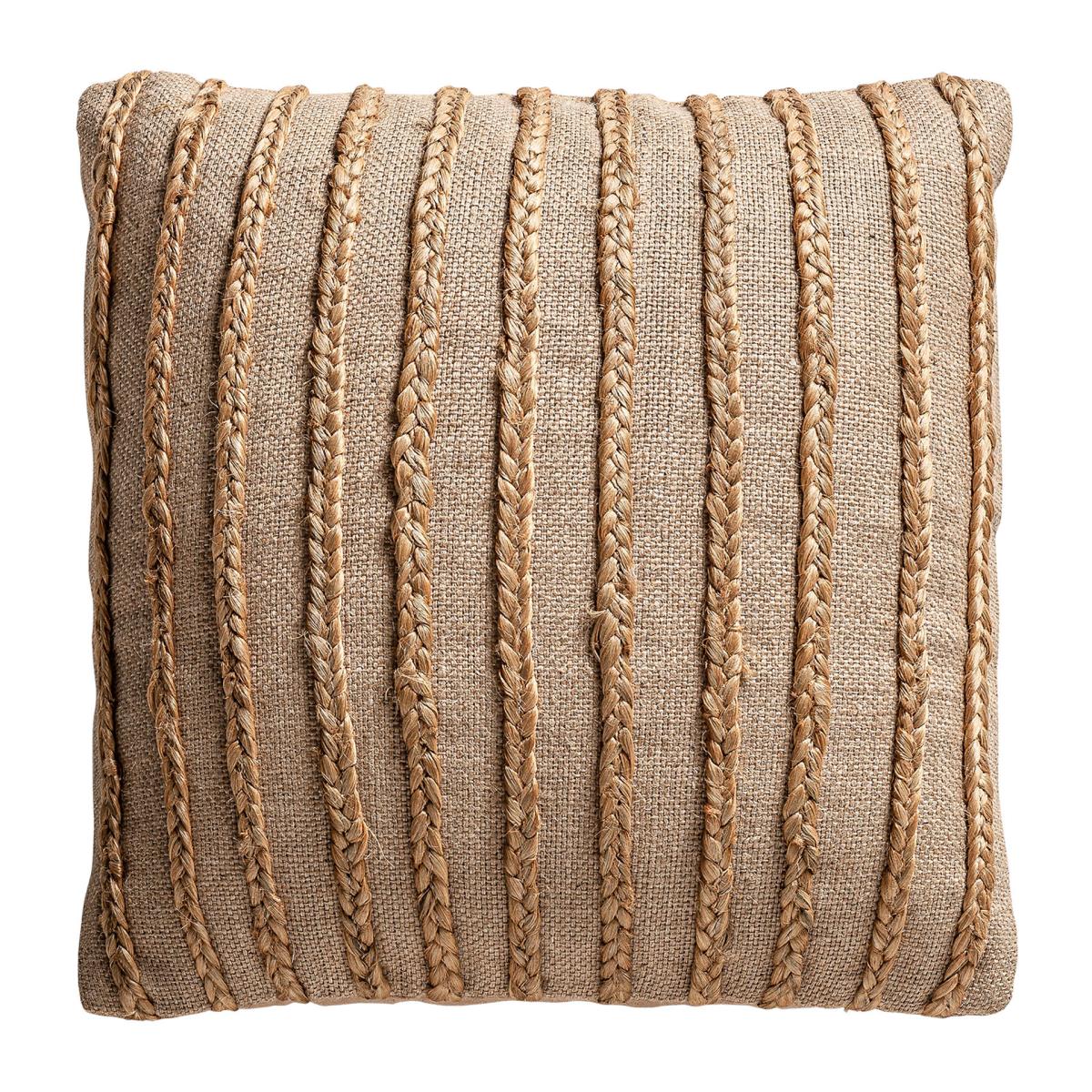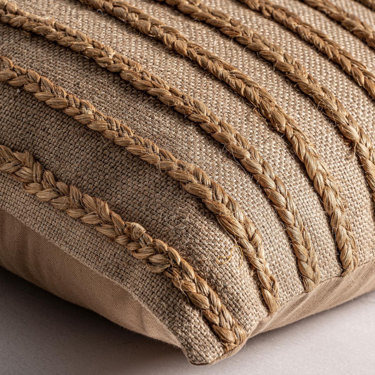 Cojín dalk de estilo clásico, fabricado en yute en color beige, combinado con algodón y poliéster. Producto desenfundable.