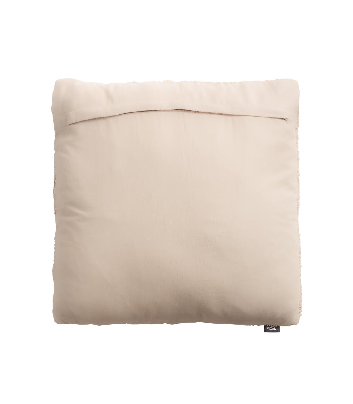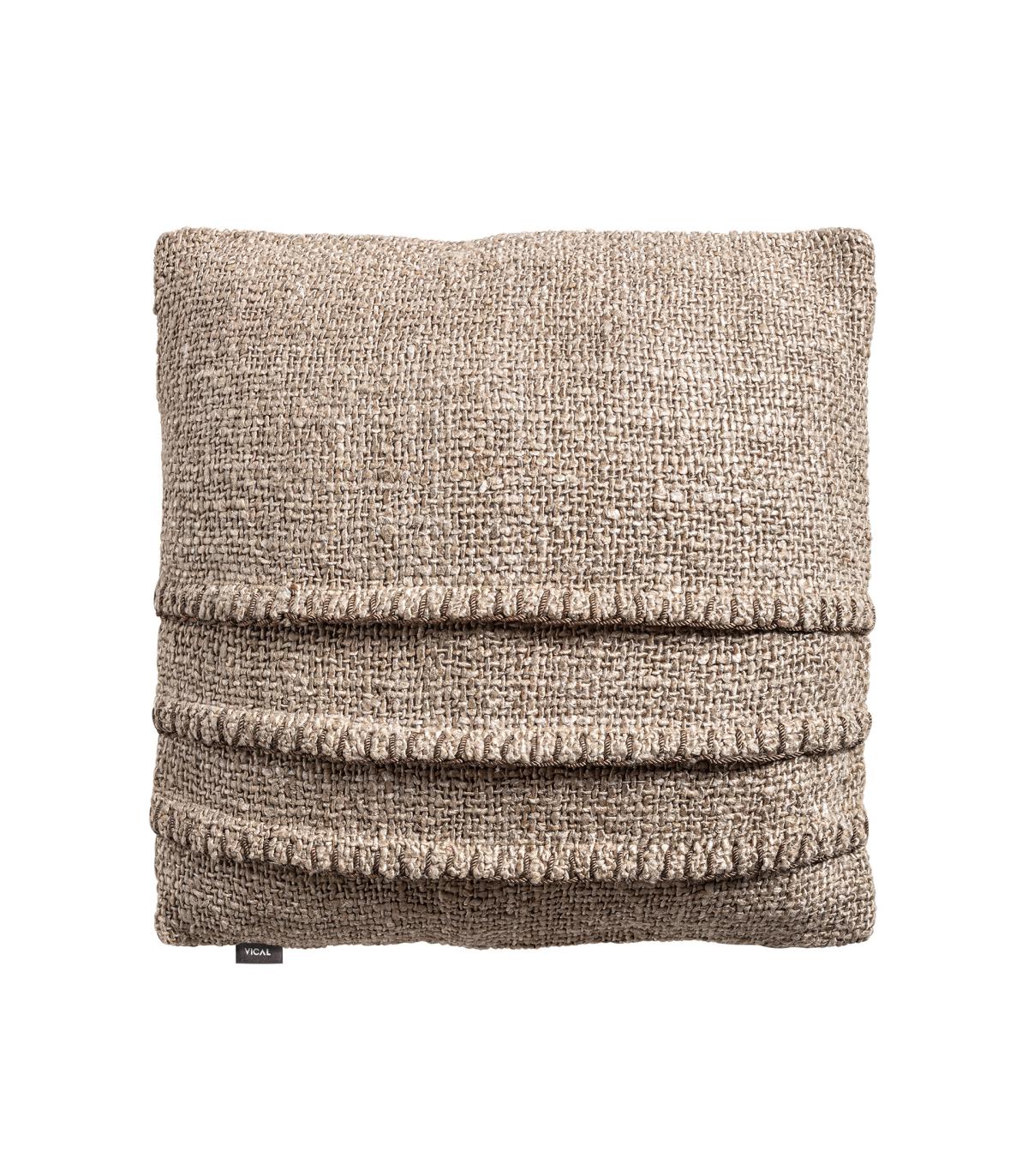 Cojín azai de estilo clásico fabricado en algodón en color arena combinado con viscosa y guata sintética. Producto desenfundable.
