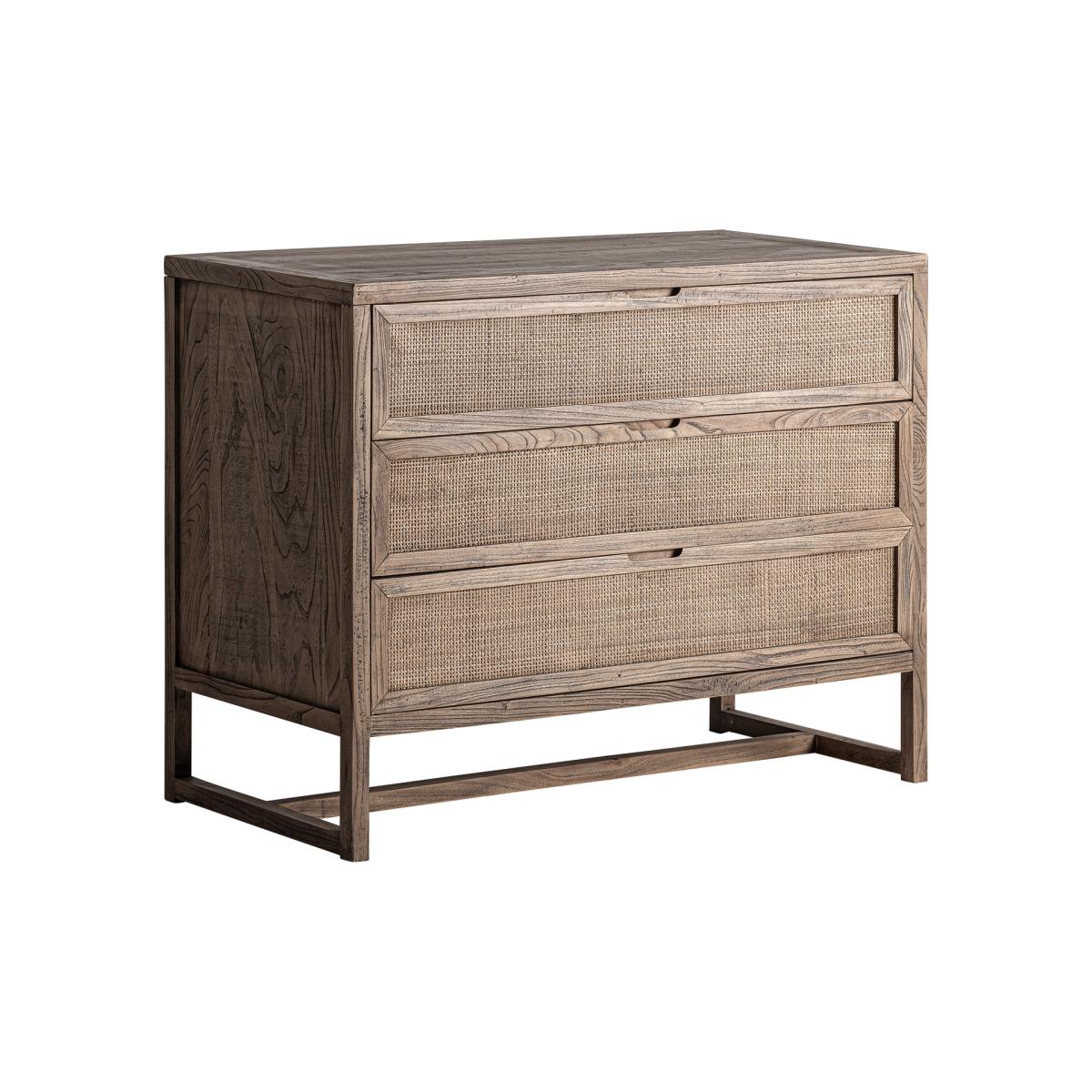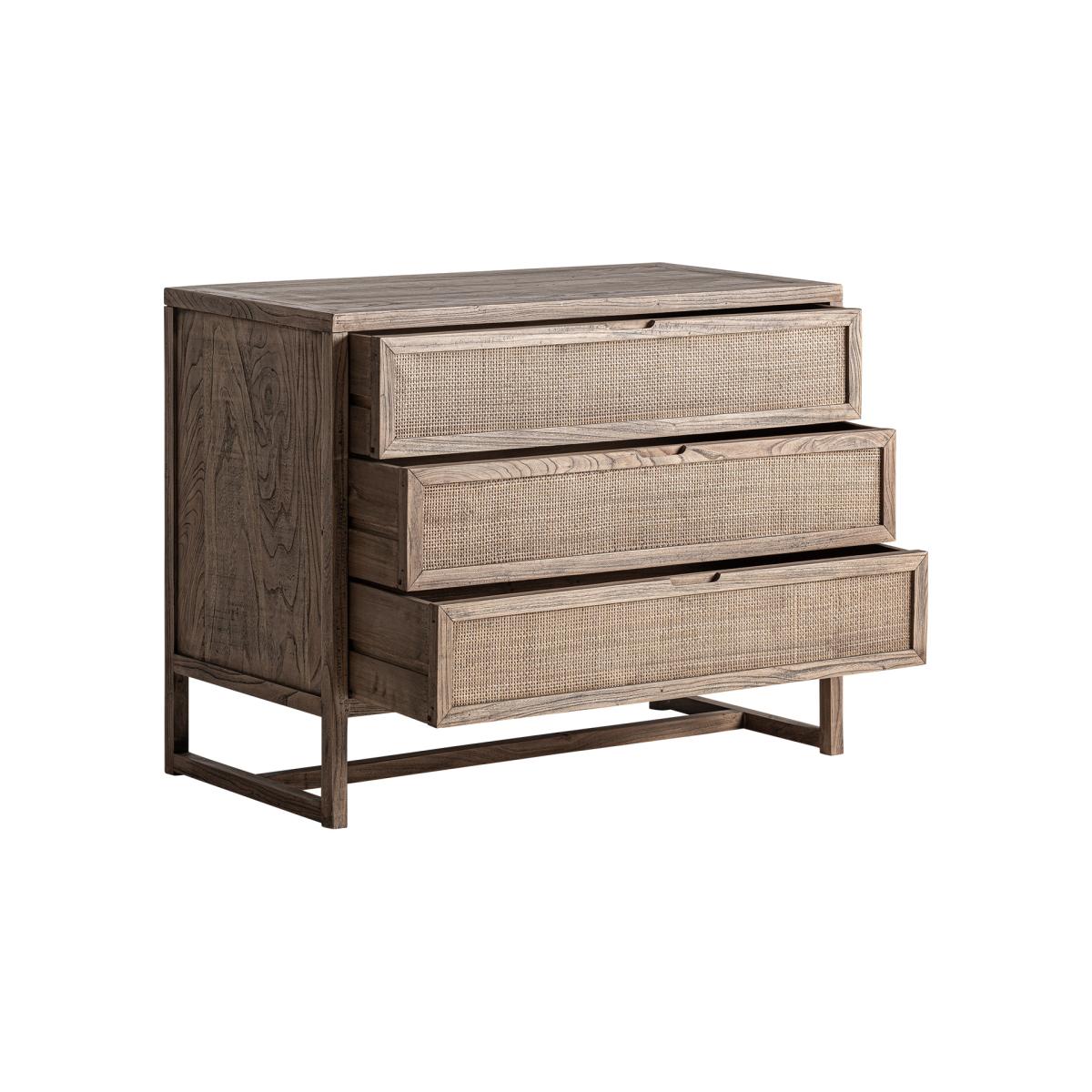 Cómoda, fabricado en madera de olmo en color marrón, combinado con ratán.
