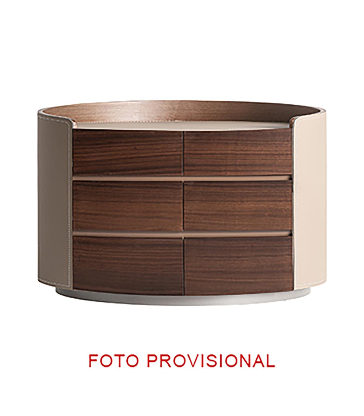 Cómoda fabricado en madera contrachapada en color marrón claro combinado con chapa de eucalipto y polipiel.