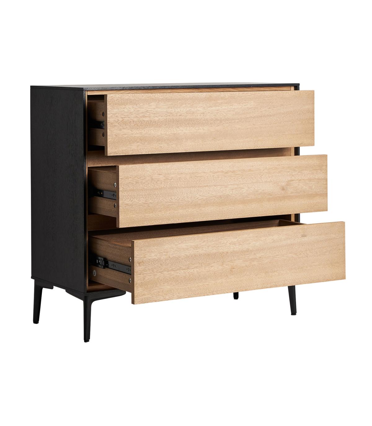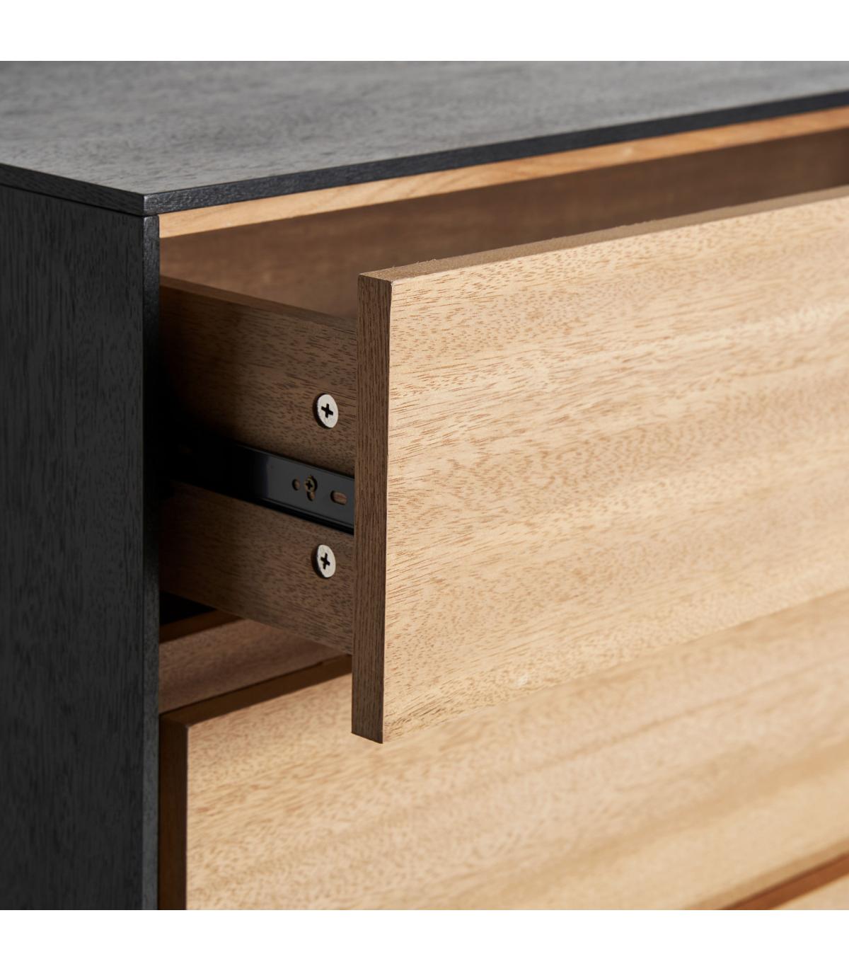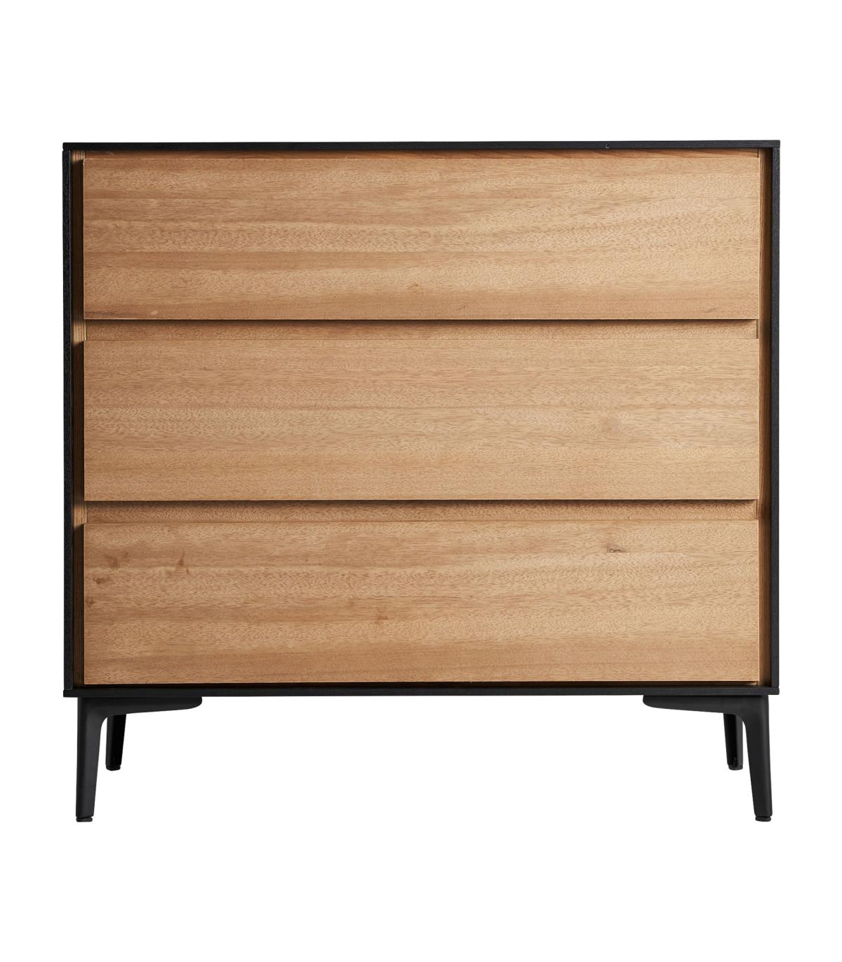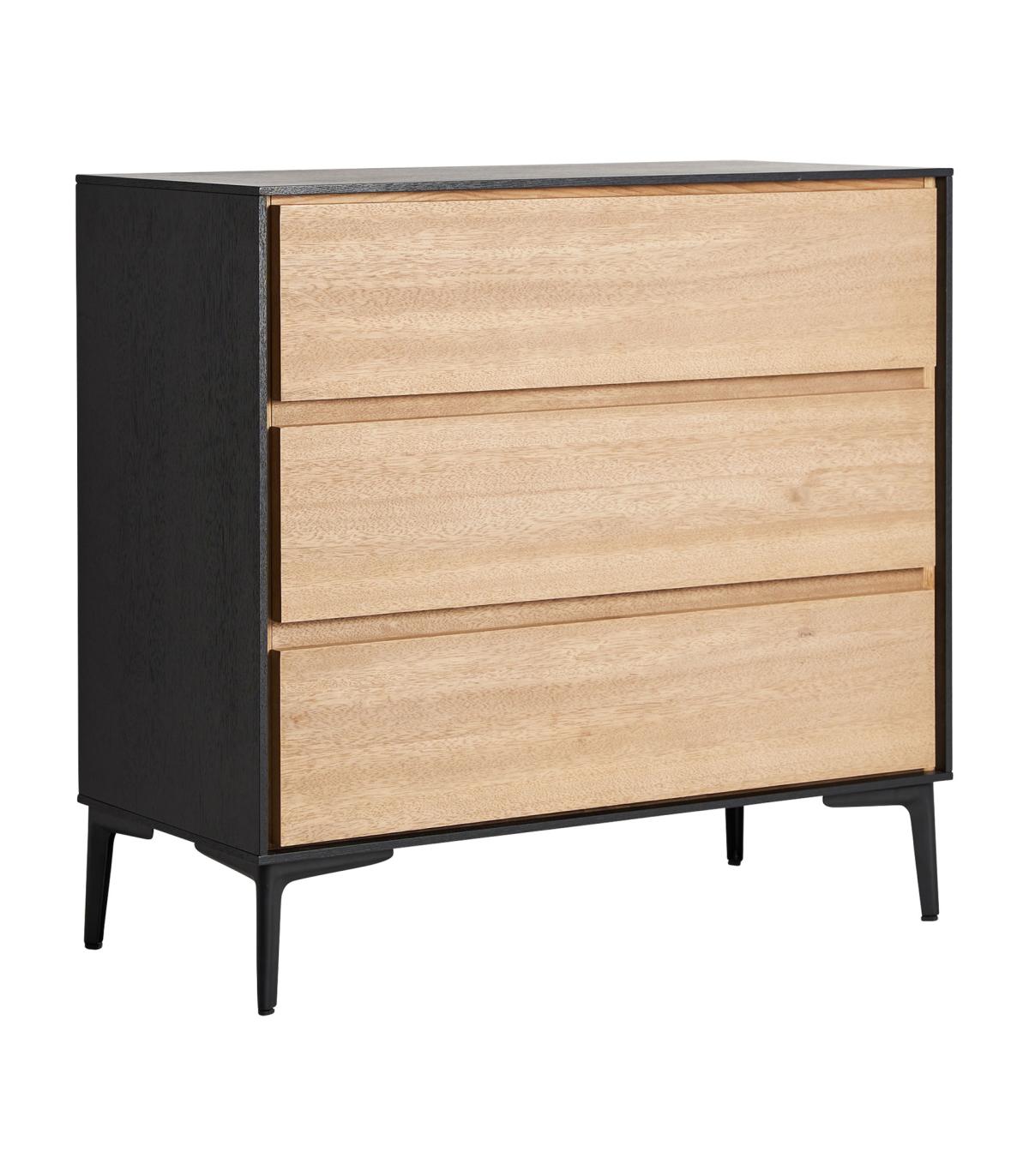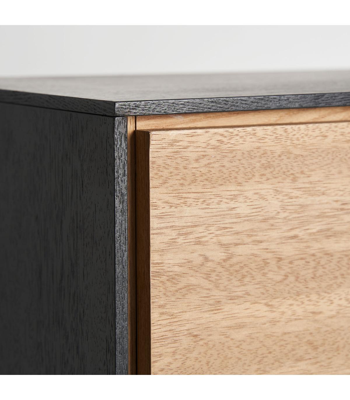 Cómoda cuadrada brussa de estilo nórdico, fabricado en madera dm en color marrón claro, combinado con hierro en color negro. Producto desmontable.