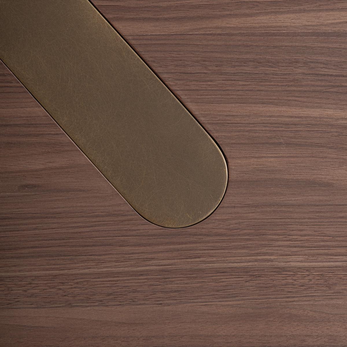 Escritorio Lausana de estilo art deco fabricado en chapa de nogal en color marrón combinado con madera dm y acero inoxidable en color cobre con acabado envejecido.