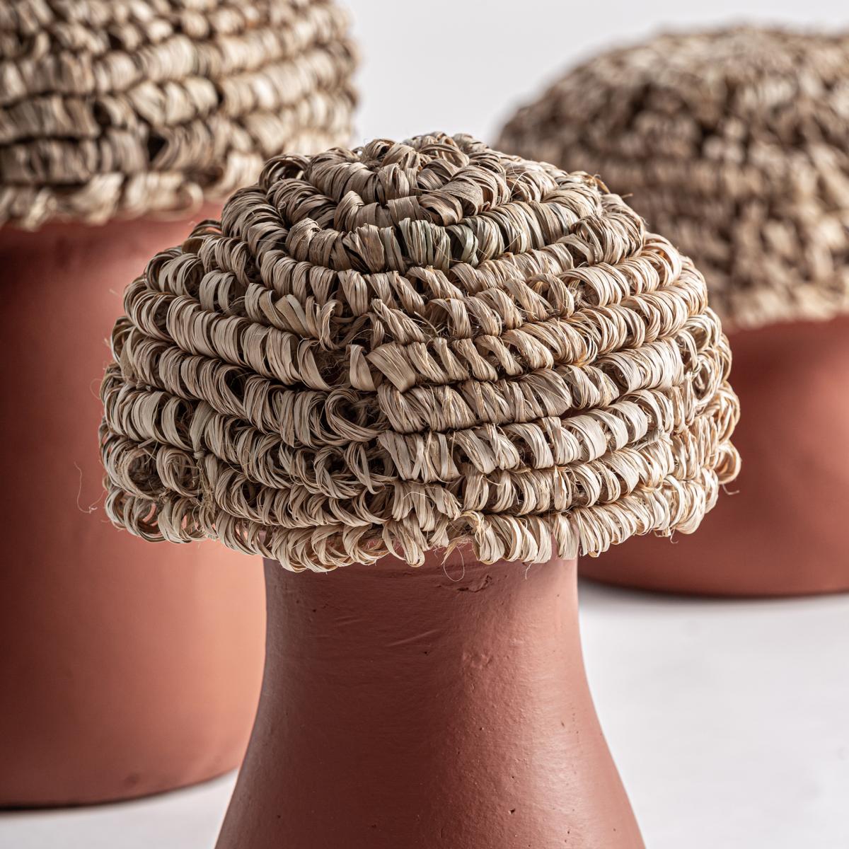 Figura j 3 fabricado en terracota en color terracota combinado con rafia en color beige.