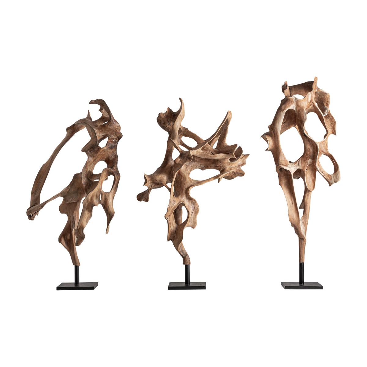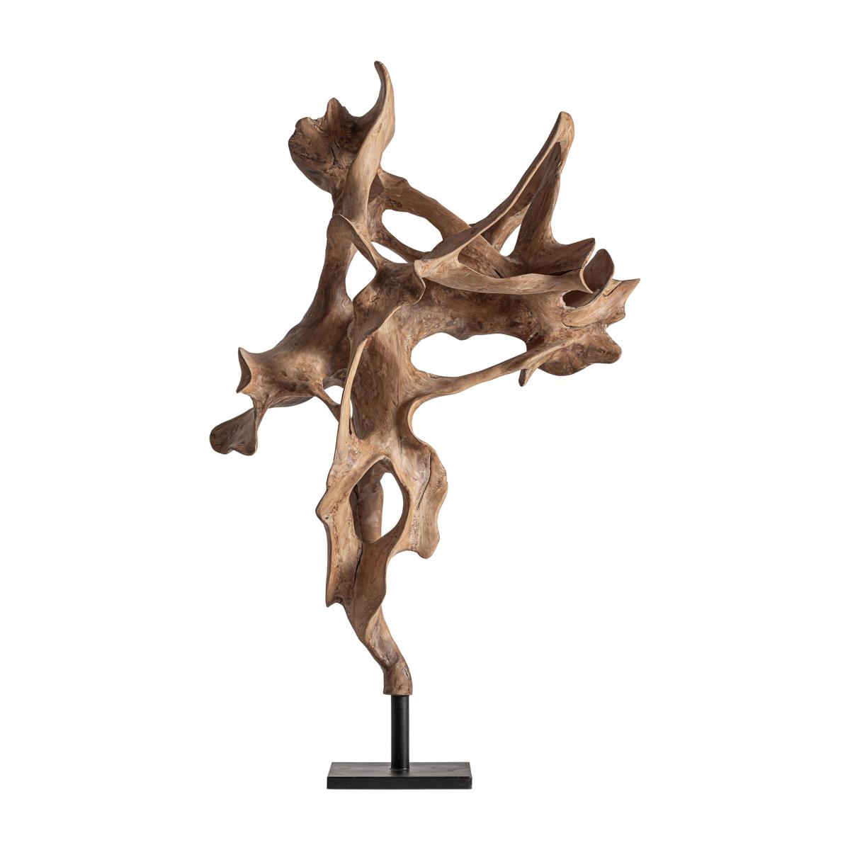 Escultura pie, fabricado en madera de teka en color marrón claro, combinado con hierro en color negro.