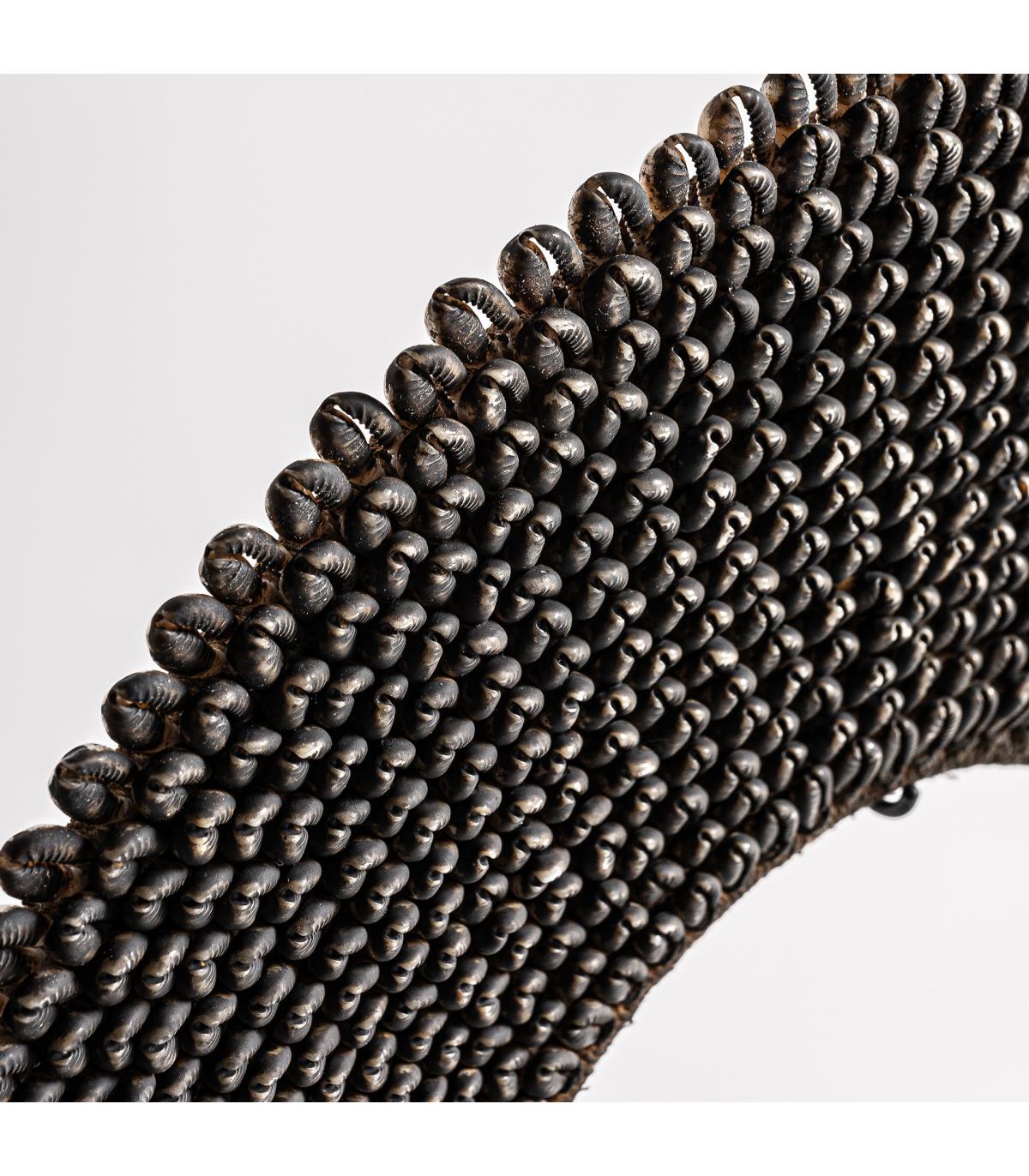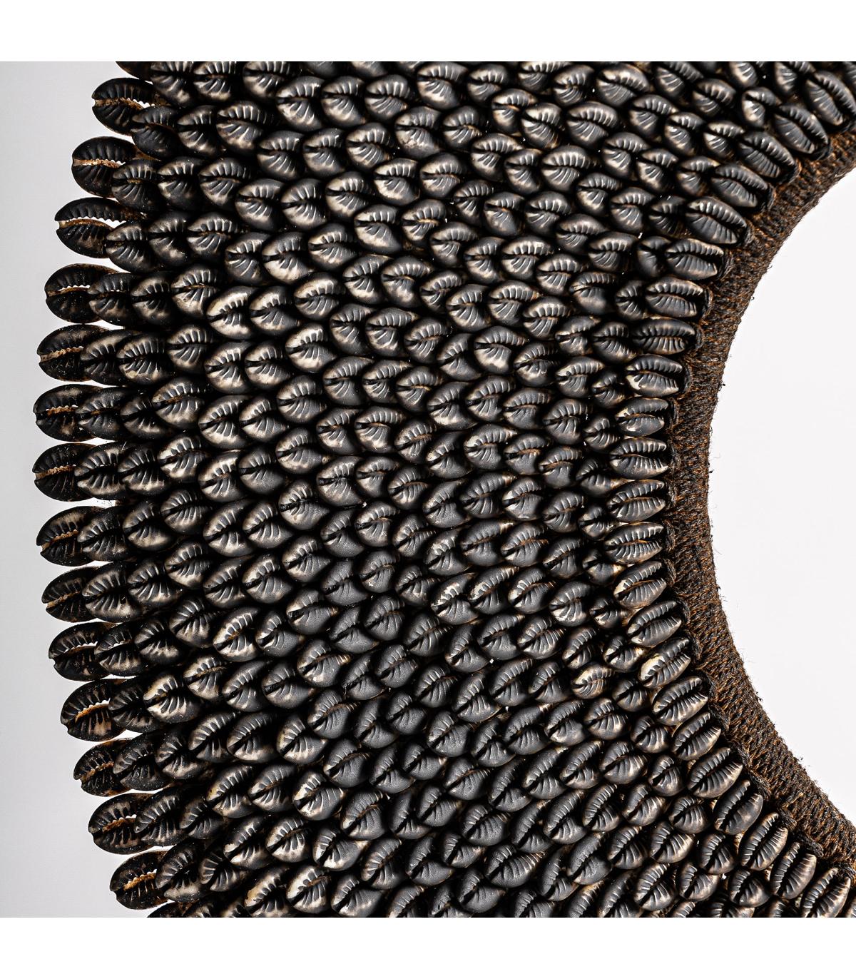 Figura decorativa jedhasea de estilo étnico fabricado en hierro en color negro combinado con concha en color tonos oscuros. Producto desmontable.