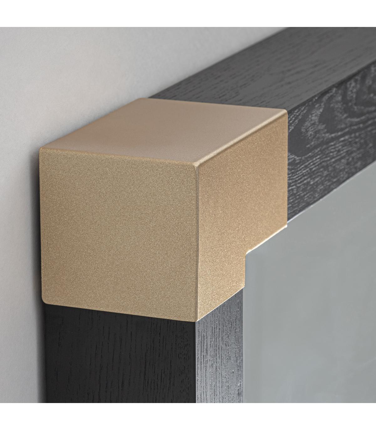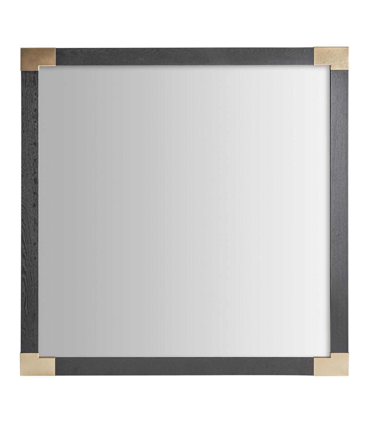 Espejo Delmont de estilo art deco fabricado en espejo combinado con madera de fresno en color negro y hierro en color dorado.