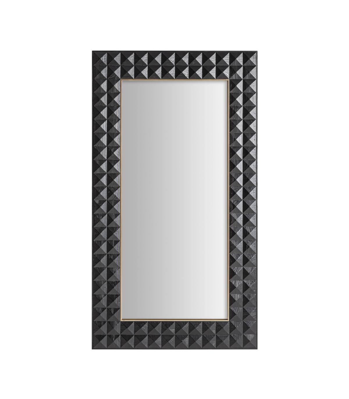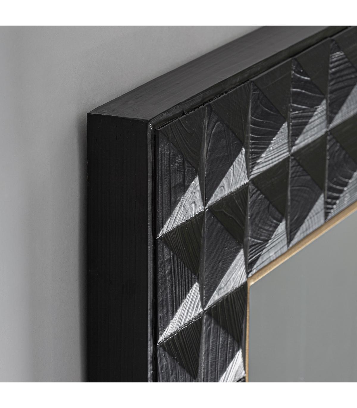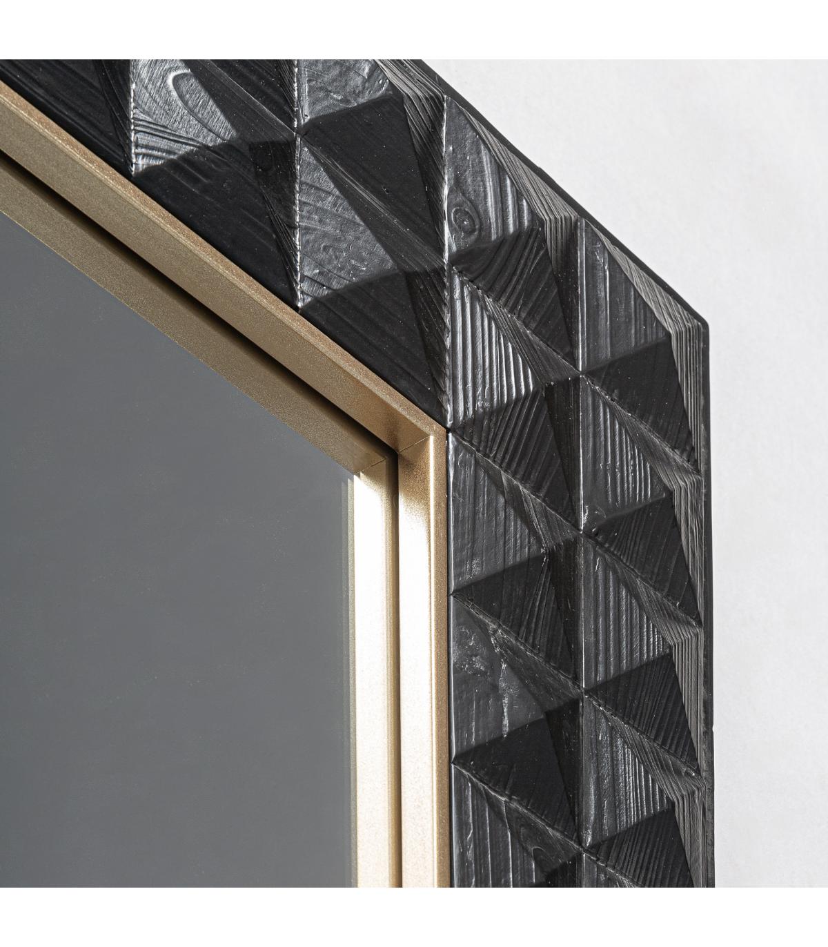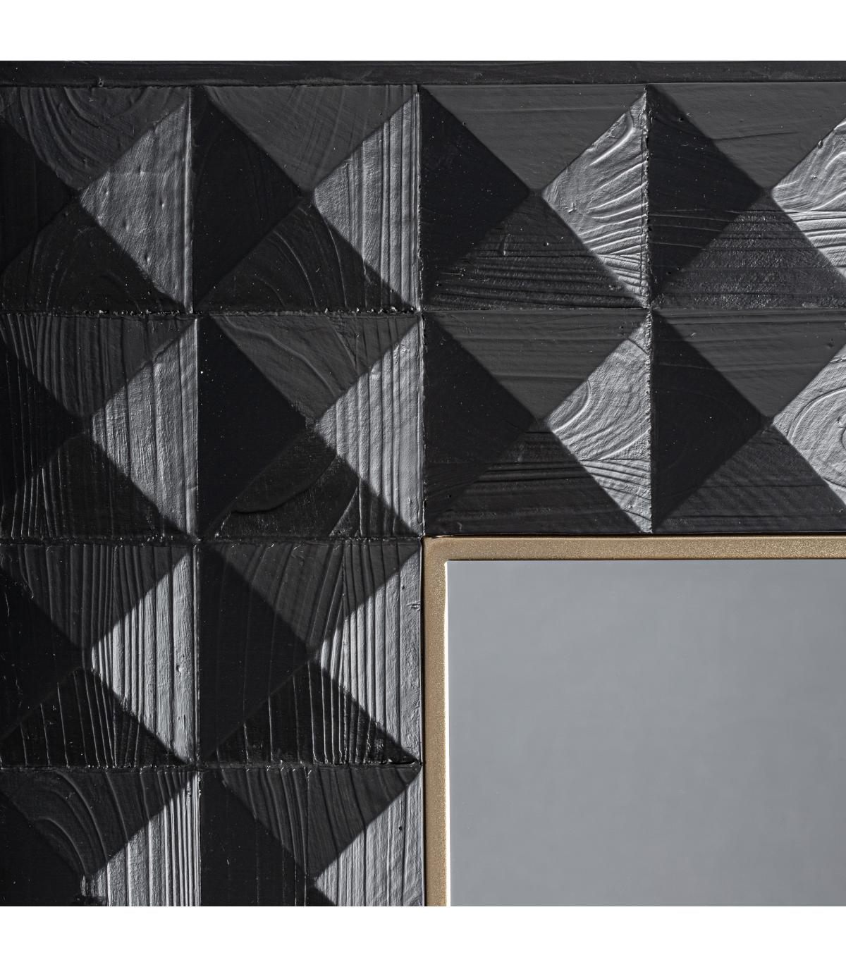 Espejo Morzine de estilo art deco fabricado en espejo combinado con madera de fresno en color negro y hierro en color dorado.