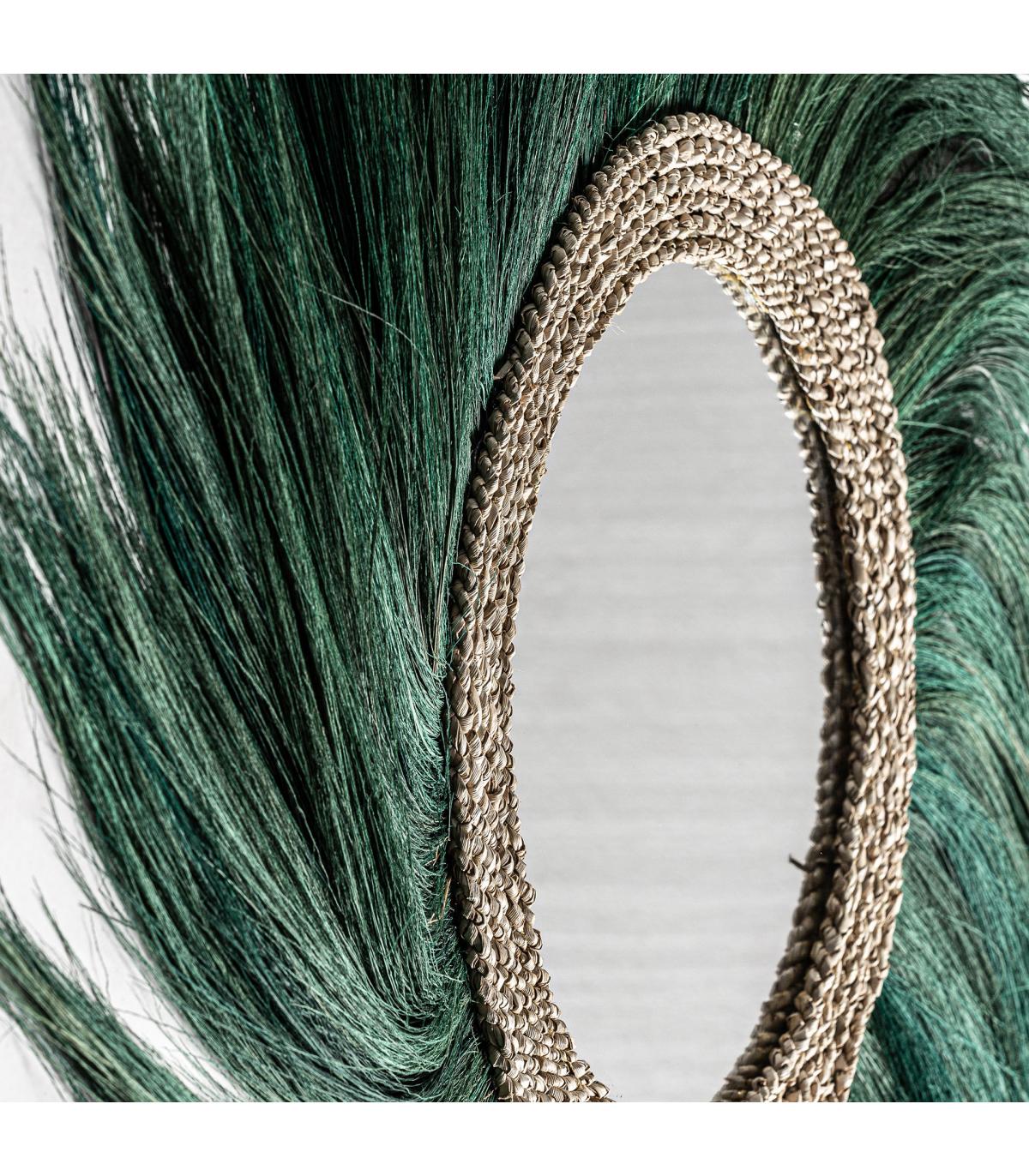 Espejo sinko de estilo étnico fabricado en fibra natural en color verde combinado con espejo.