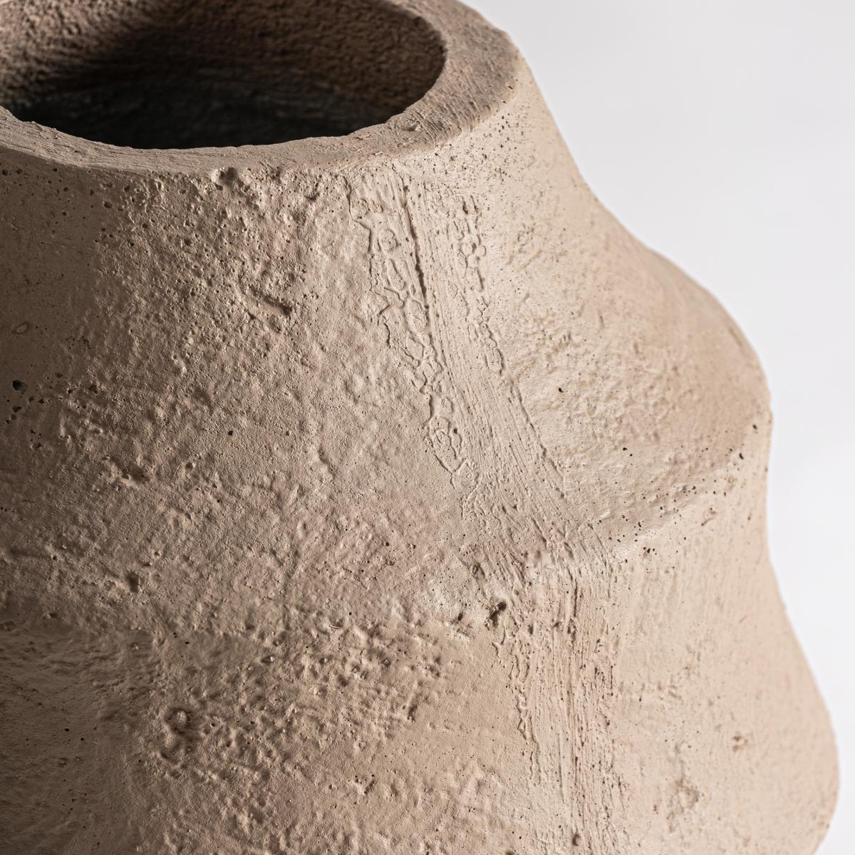 Jarrón fabricado en cemento en color marrón claro combinado con fibra de vidrio.