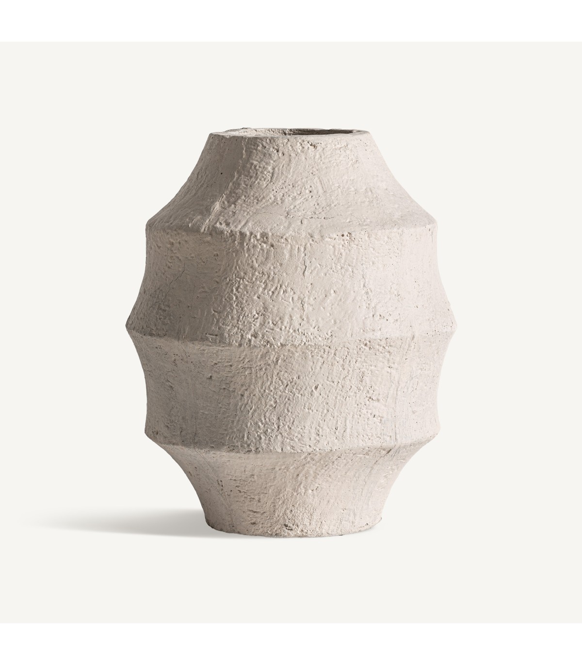 Jarrón fabricado en cemento en color crema combinado con fibra de vidrio.
