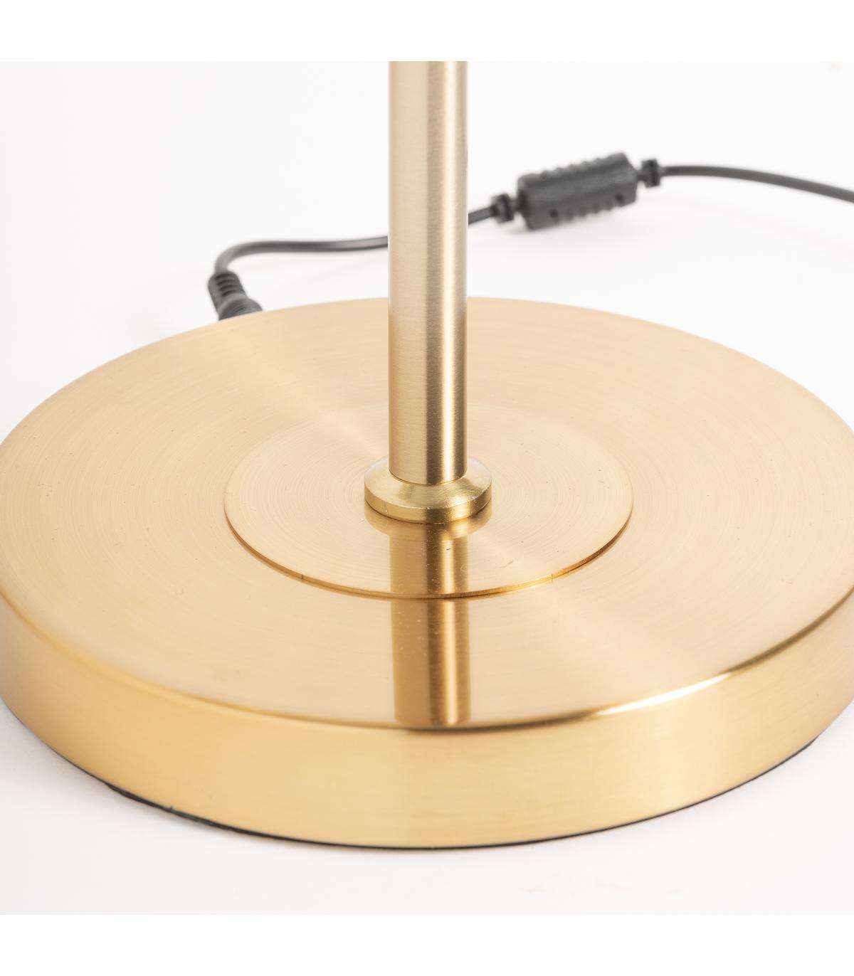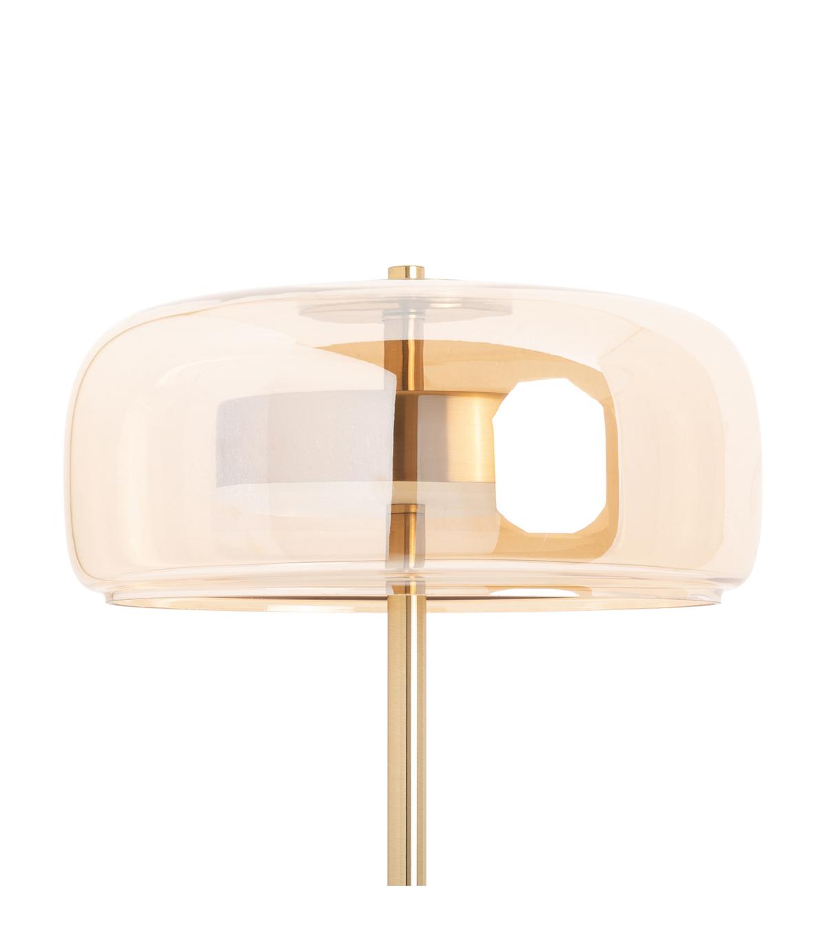 Lámpara de sobremesa leslia de estilo art deco fabricado en hierro en color oro combinado con acrílico y cristal en color marrón. Producto desmontable.