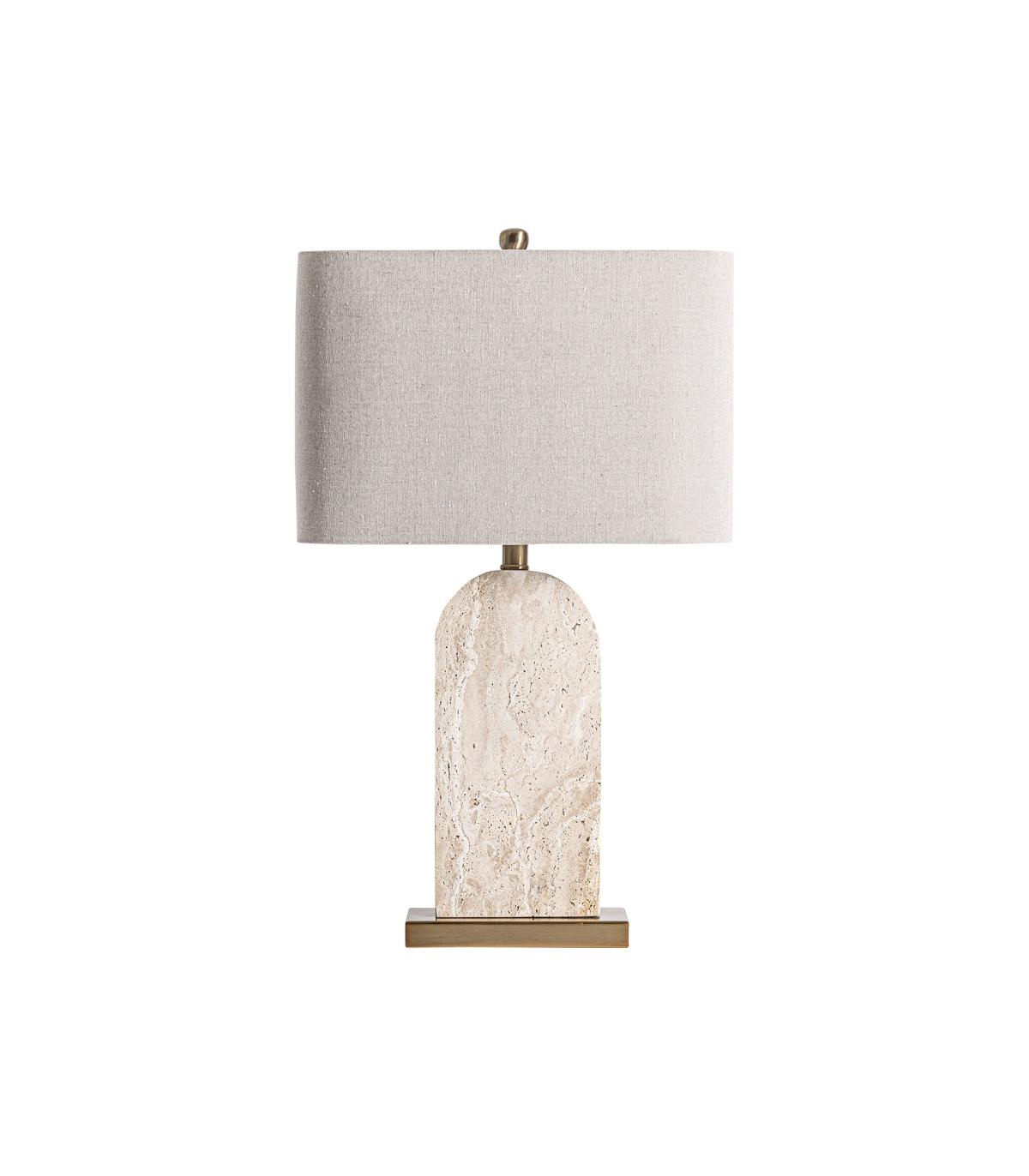 Lámpara de sobremesa de estilo art deco fabricado en travertino en color marfil combinado con hierro en color oro y lino en color blanco roto. Producto desmontable.