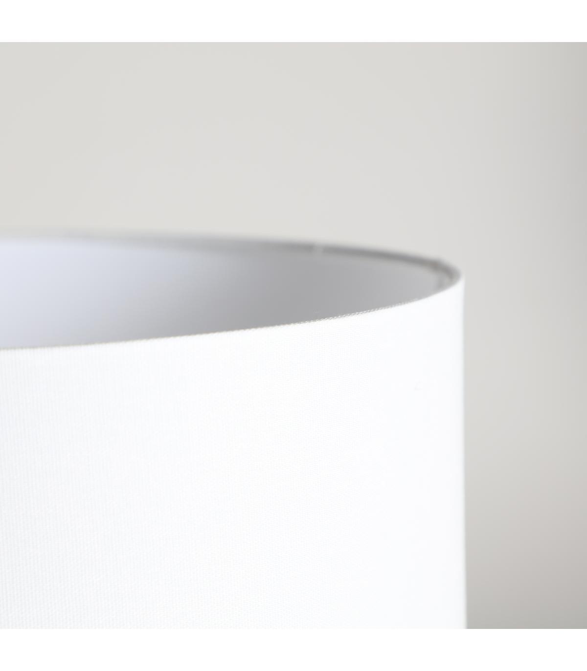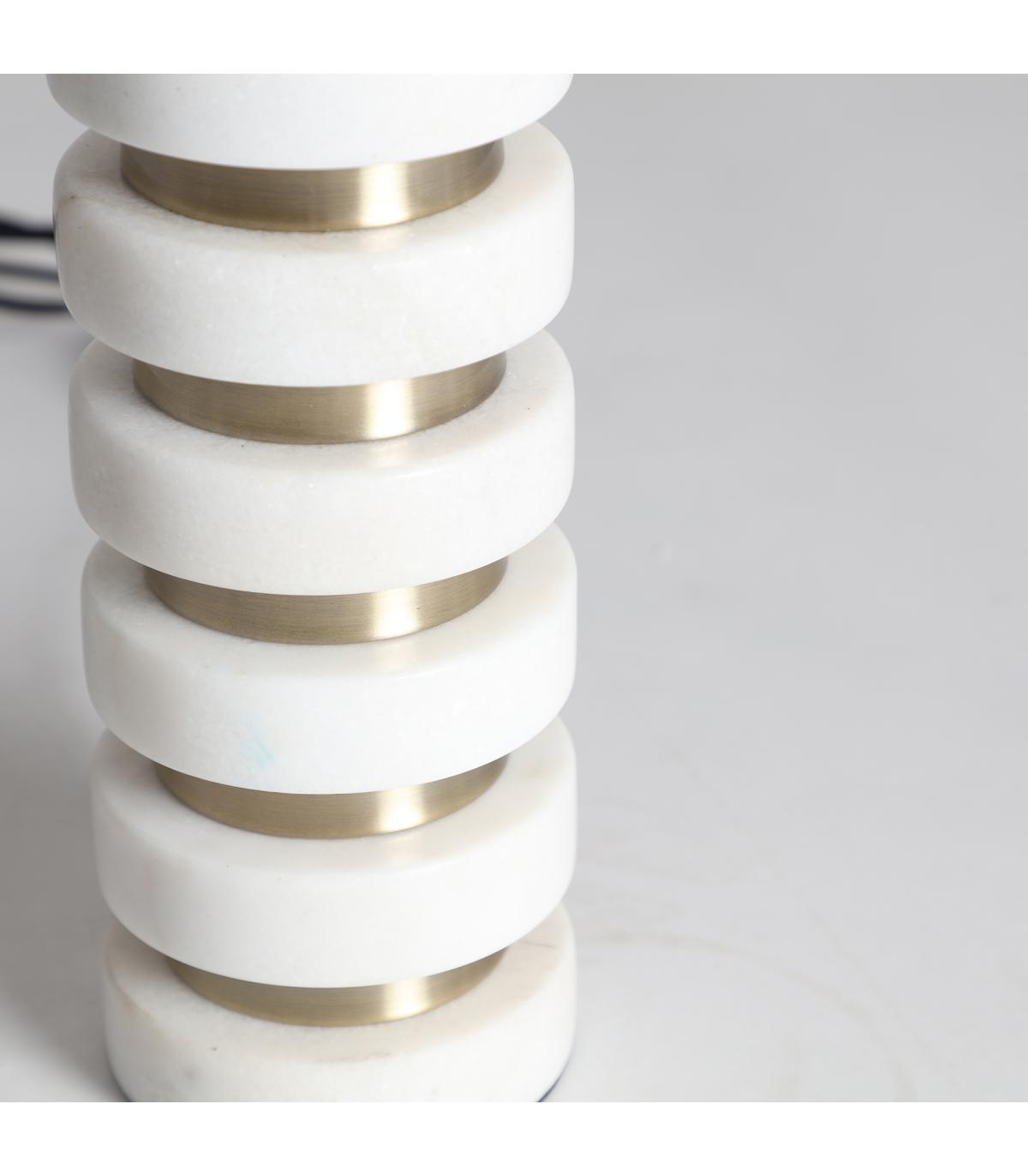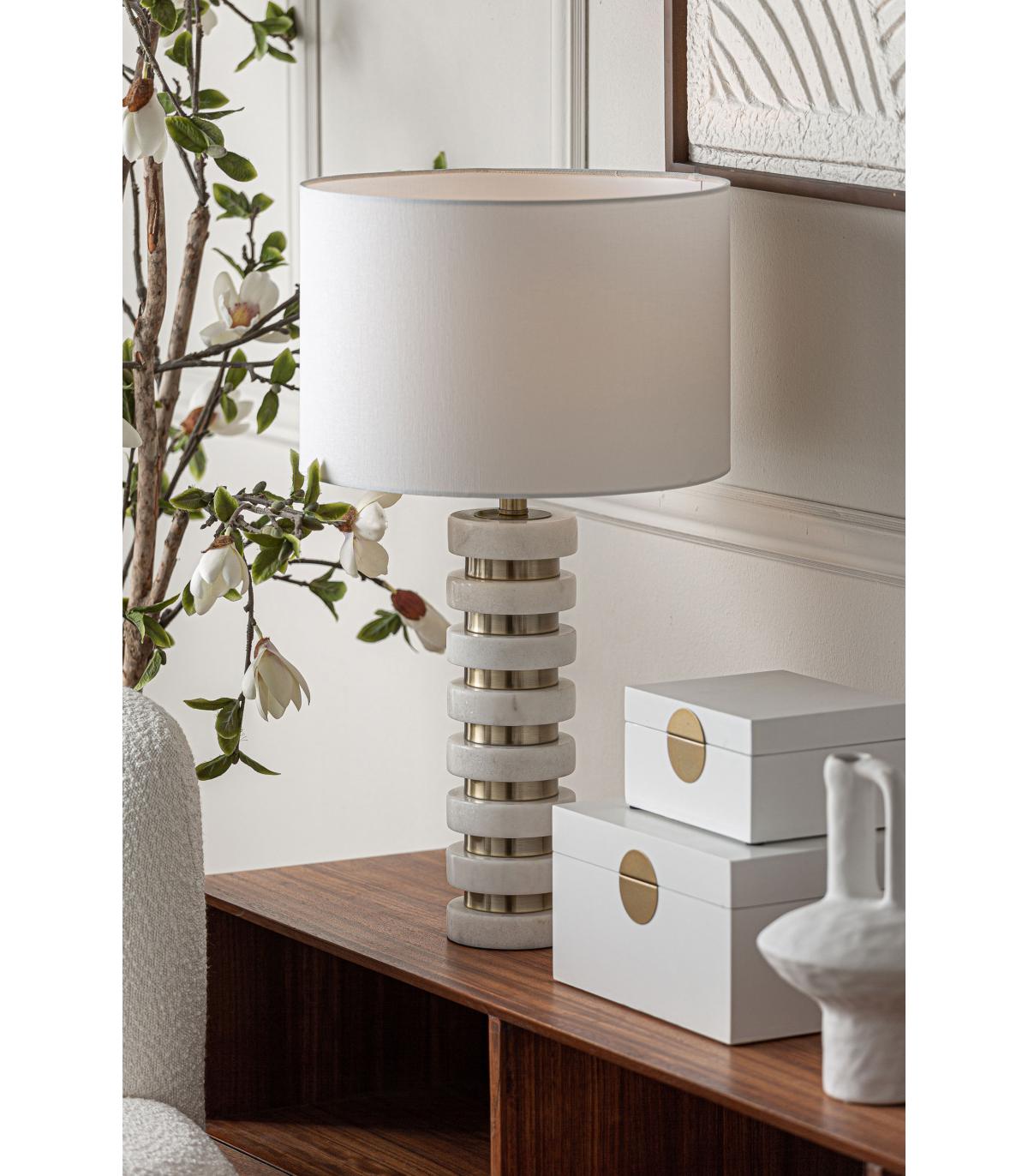 Lámpara de sobremesa rectangular iola de estilo provenzal, fabricado en mármol en color blanco, combinado con hierro en color oro y lino en color blanco roto. Producto desmontable.