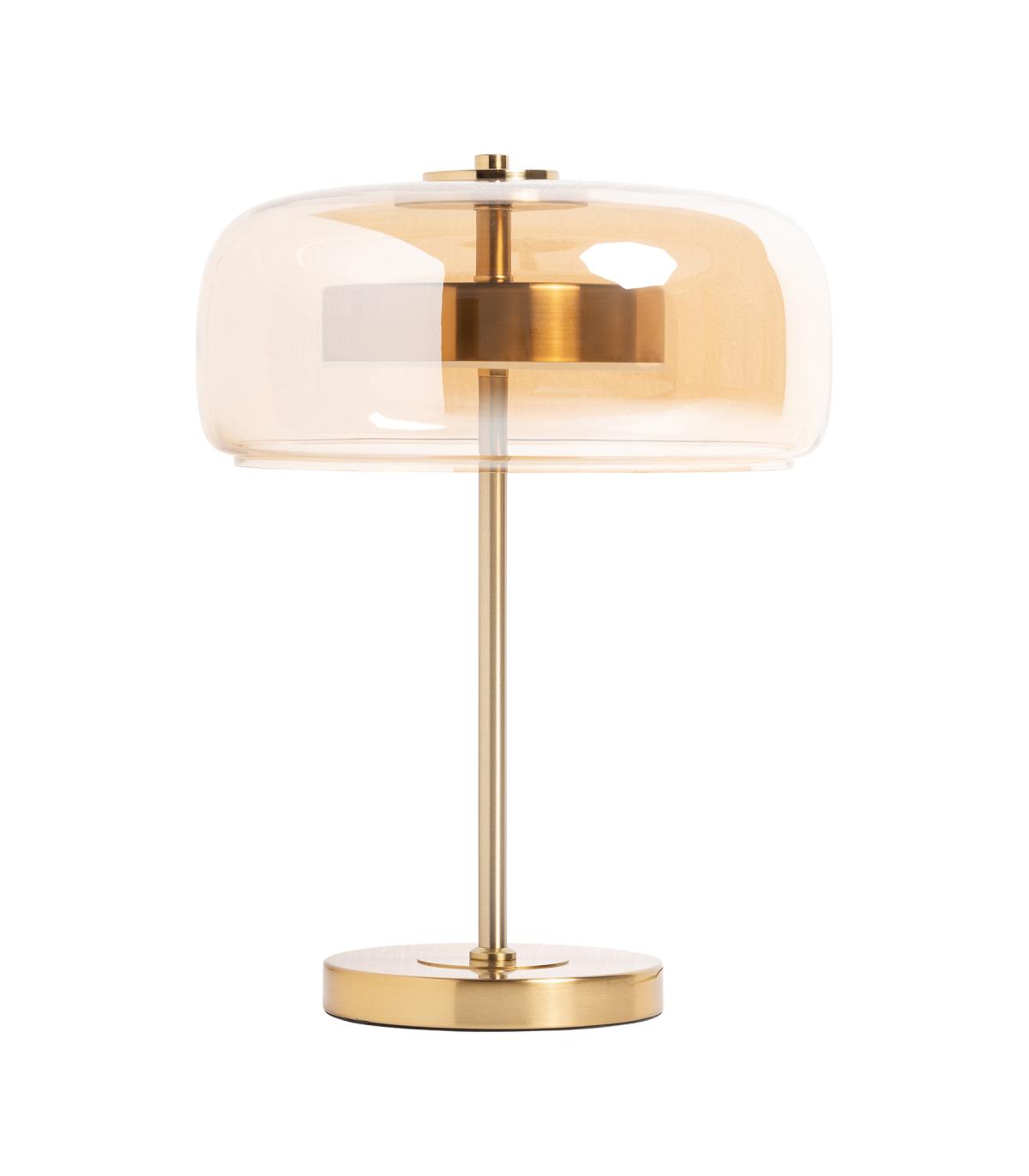 Lámpara de sobremesa leslia de estilo art deco fabricado en hierro en color oro combinado con acrílico y cristal en color marrón. Producto desmontable.