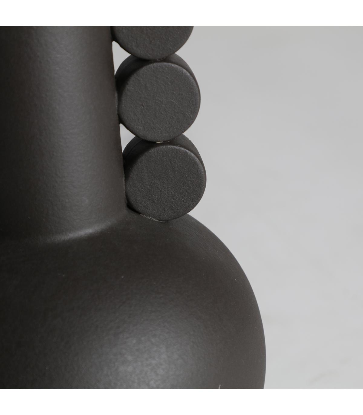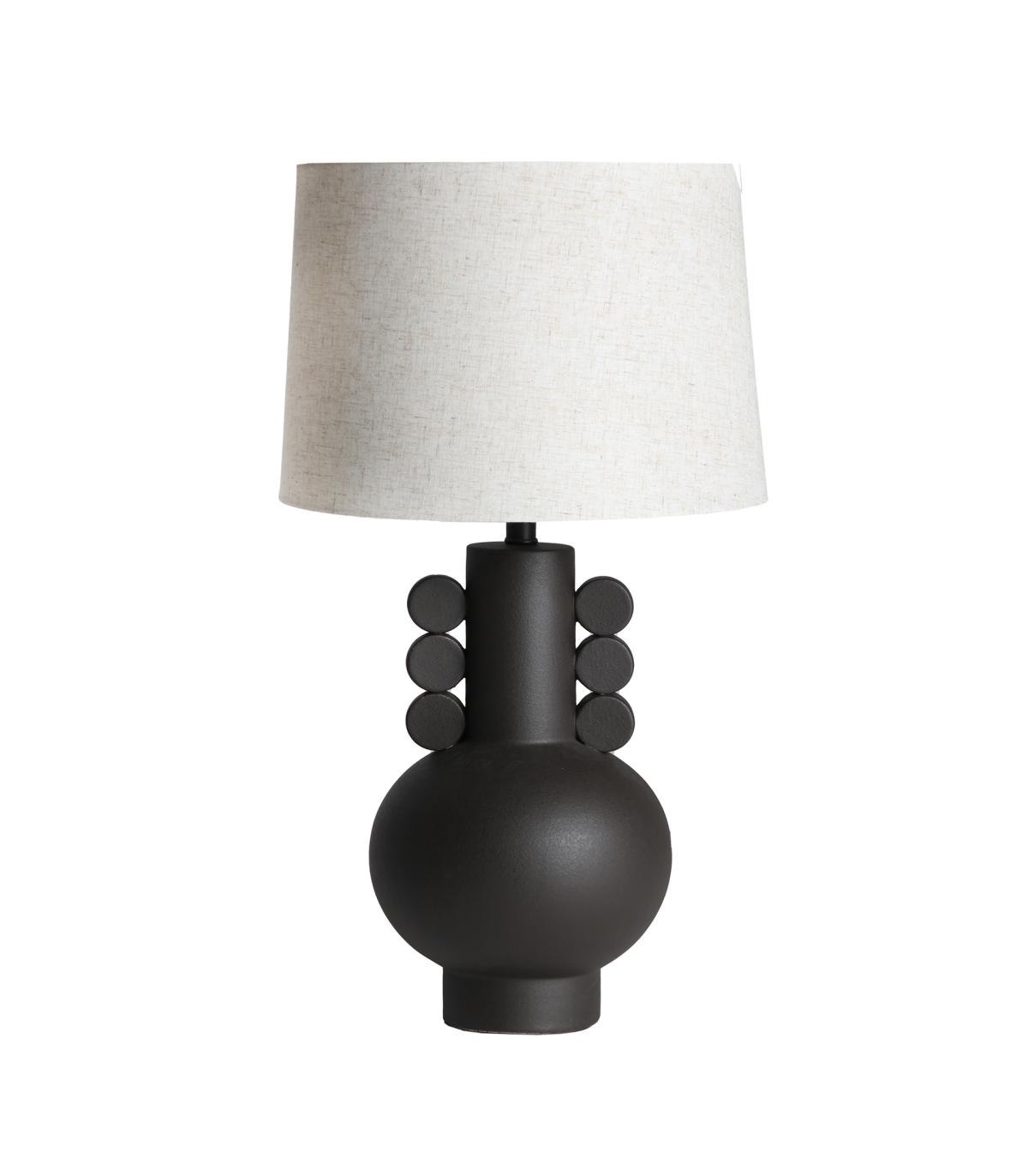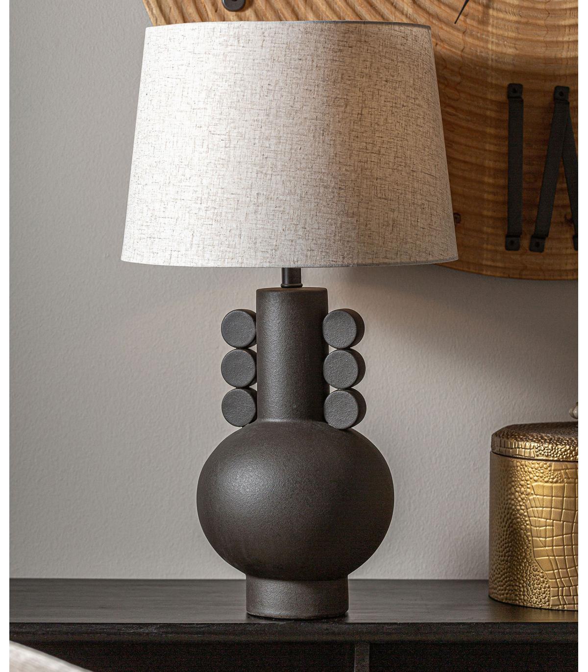 Lámpara de sobremesa oksana de estilo provenzal, fabricado en cerámica en color negro, combinado con hierro en color natural y lino en color blanco roto. Producto desmontable.