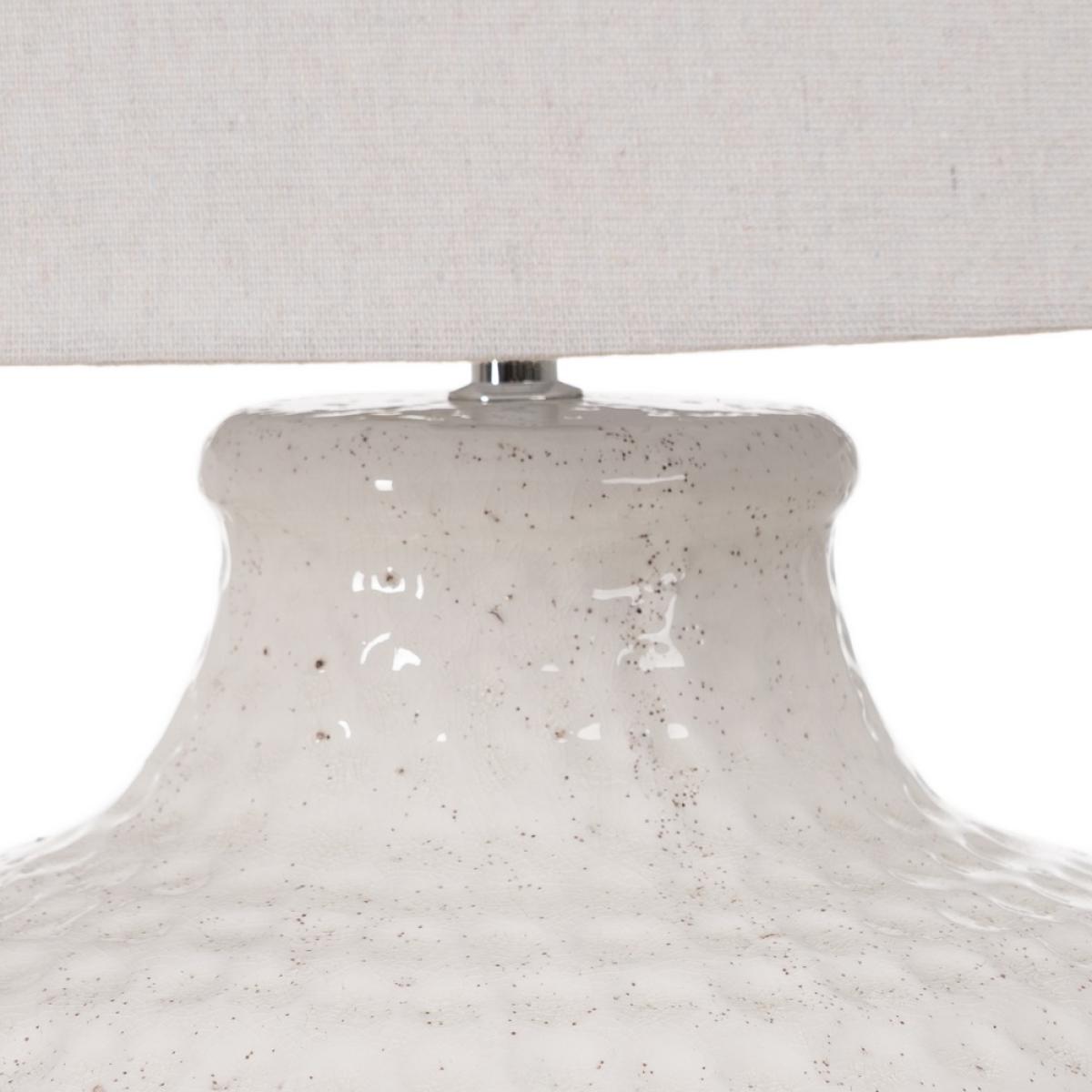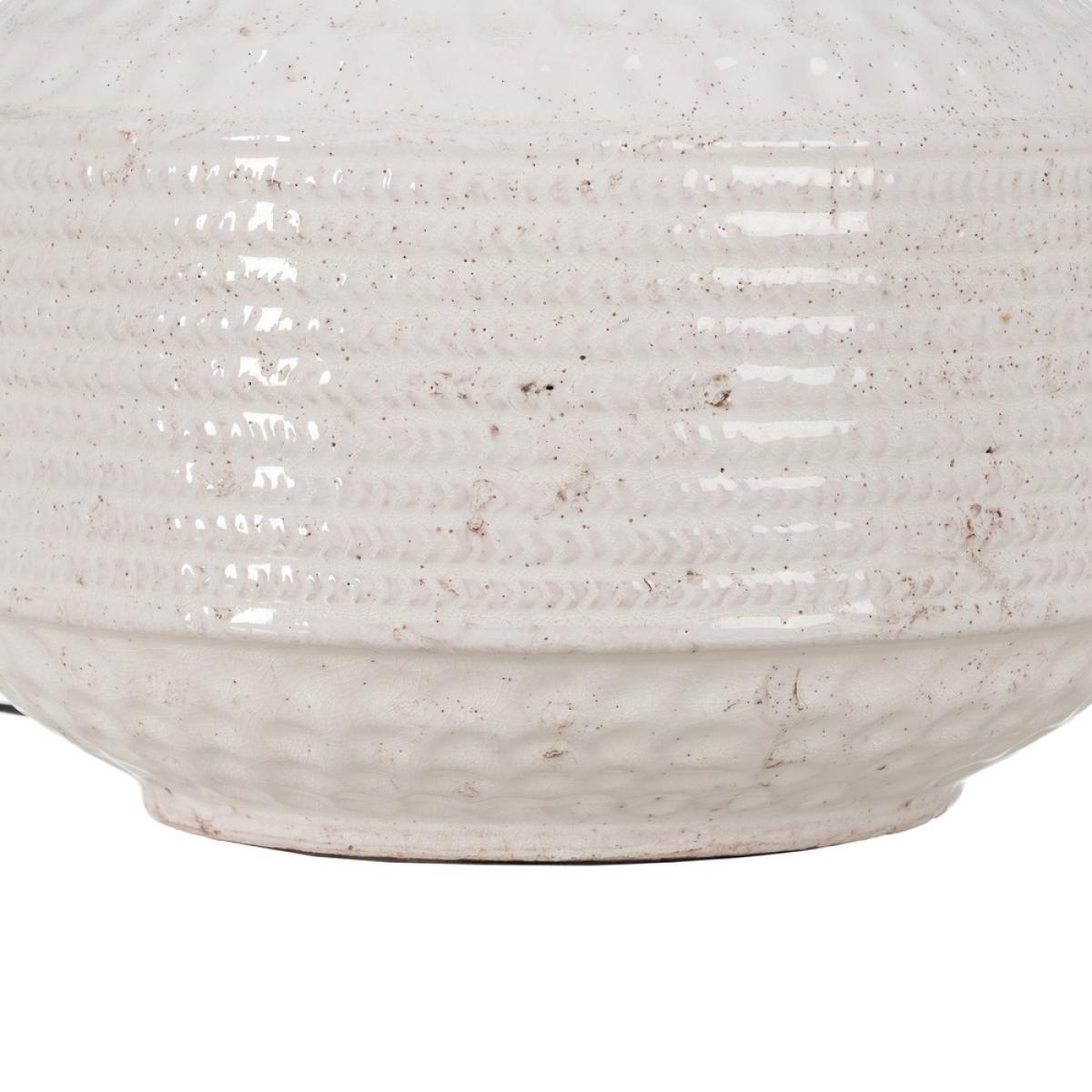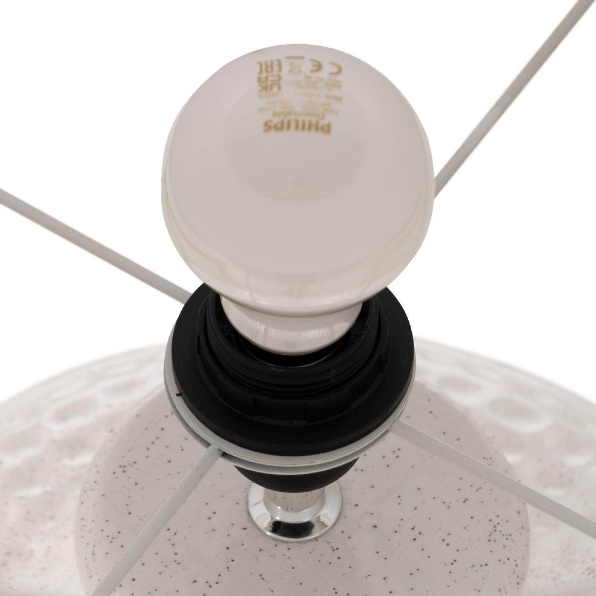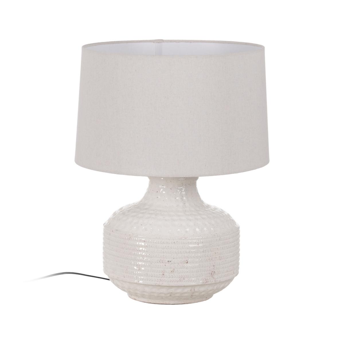 LÁMPARA MESA BLANCO TERRACOTA 43 X 43 X 57,50 CM Base de terracota, medidas 31x31x27cm. Pantalla de tejido (lino), medidas 43x40x25cm. Voltaje: 220V. Casquillo: E27. Bombillas: 1*60W máx (no incluida). Longitud cable: 120cm.