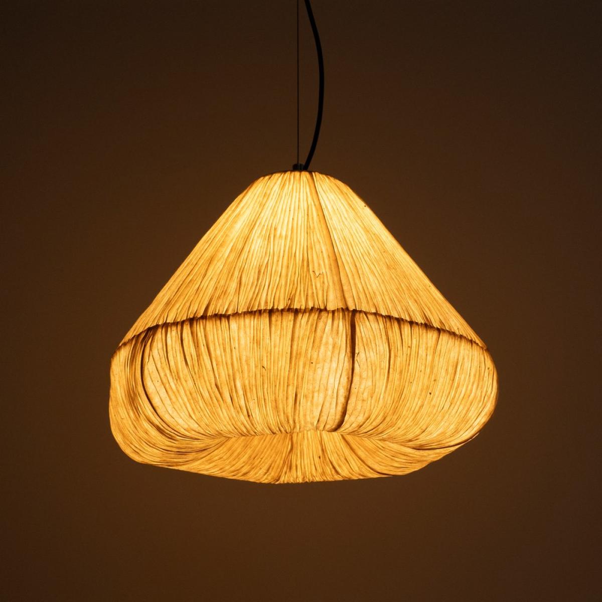 LÁMPARA TECHO BEIGE PAPEL-METAL 49 X 49 X 40 CM Material: papel - hierro Casquillo: 1 x E27/9w led Bombilla: no incluida Cable negro, largo 150cm. Altura regulable.