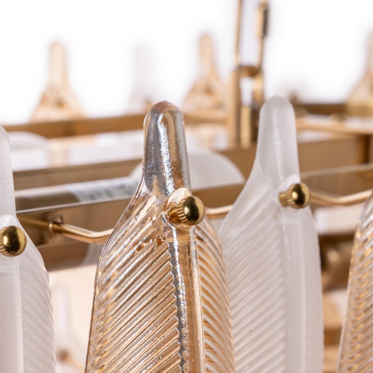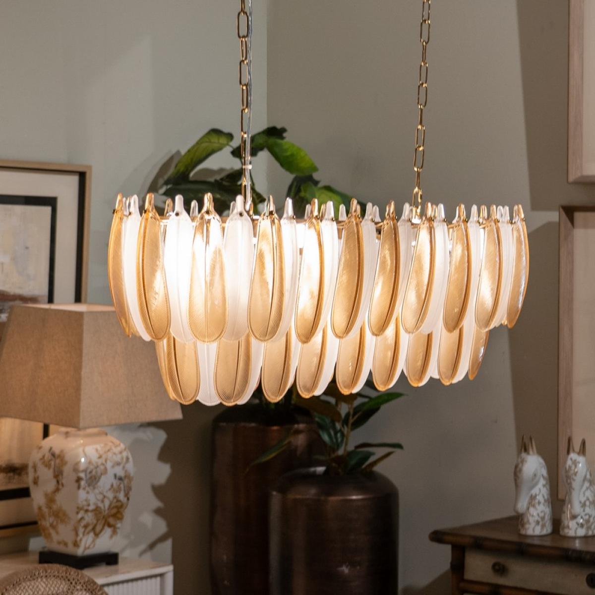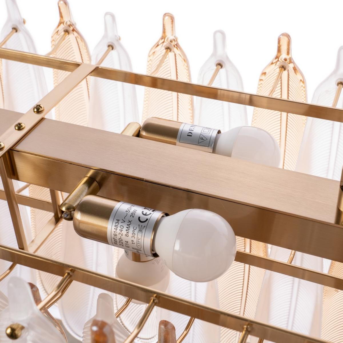 LÁMPARA TECHO PLUMAS CHAMPÁN CRISTAL 100 X 35 X 38 CM Material: cristal, hierro. Voltaje: 220-240V. Casquillos: E14. Bombillas: 8*25W máx (no incluidas). Longitud cadena: 130cm. Se recomienda colgar la lámpara en un techo firme y robusto.
