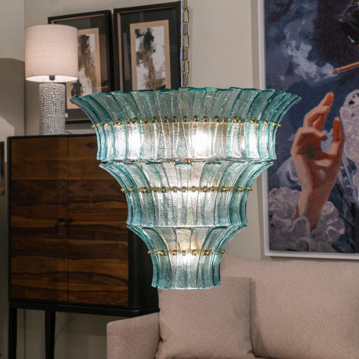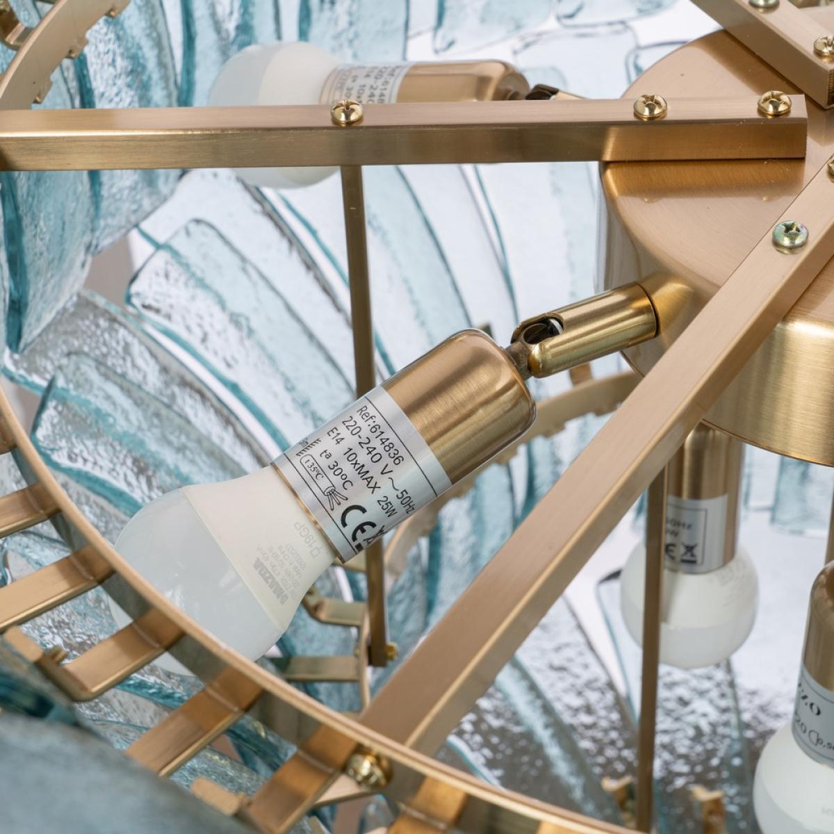 LÁMPARA TECHO VERDE CRISTAL ILUMINACIÓN 70 X 70 X 56 CM Material: cristal, hierro. Voltaje: 220-240V. Casquillos: E14. Bombillas: 10*25W máx (no incluidas). Longitud cadena: 130cm. Se recomienda colgar la lámpara en un techo firme y robusto.