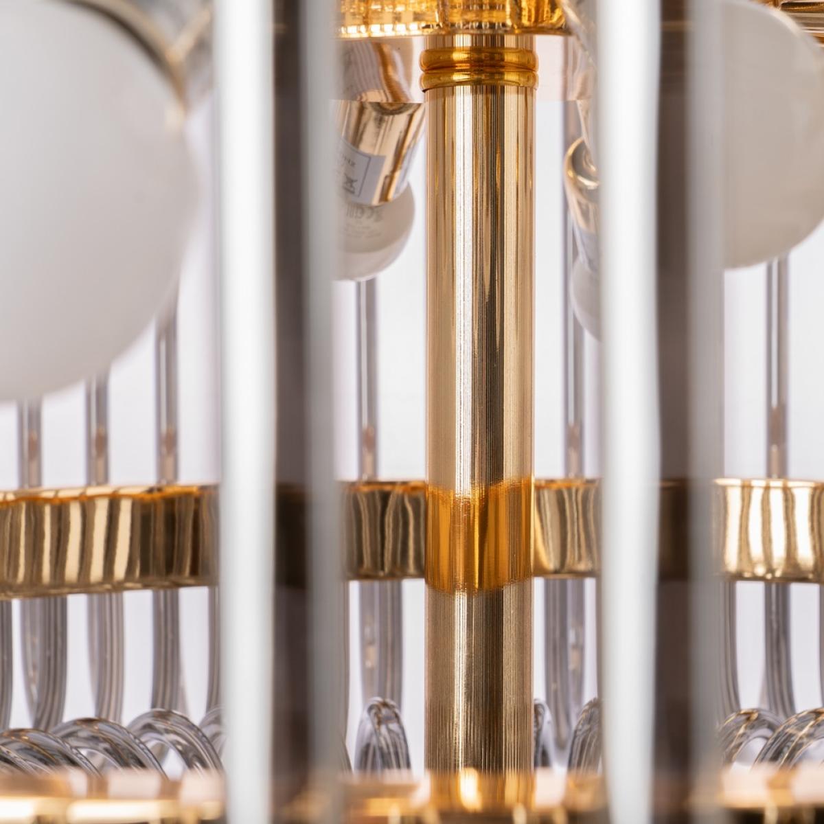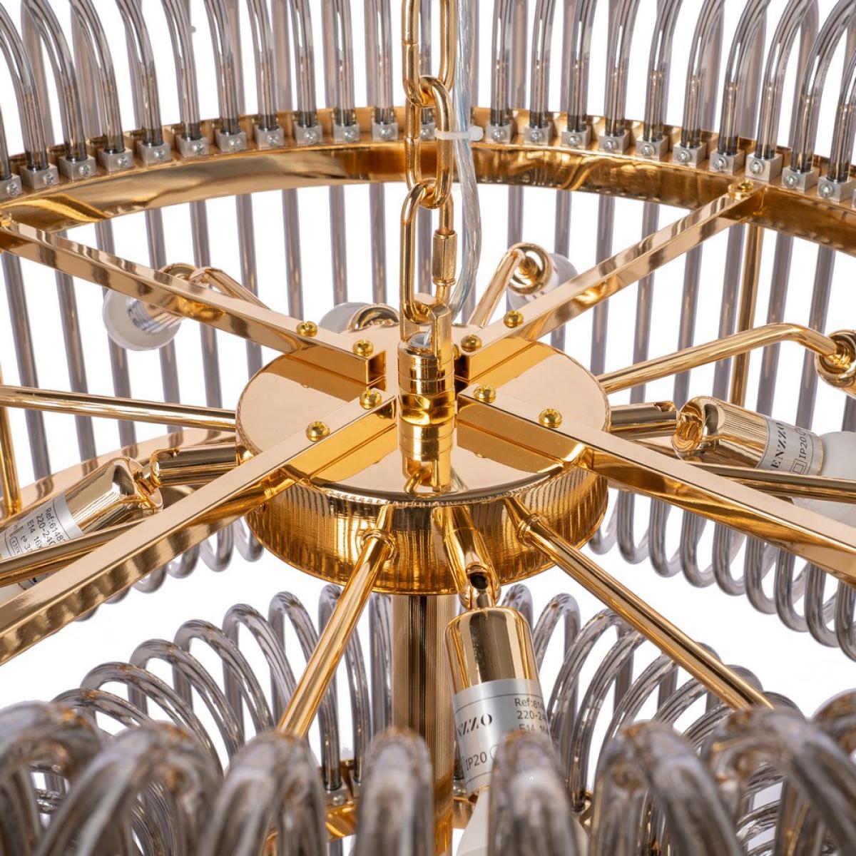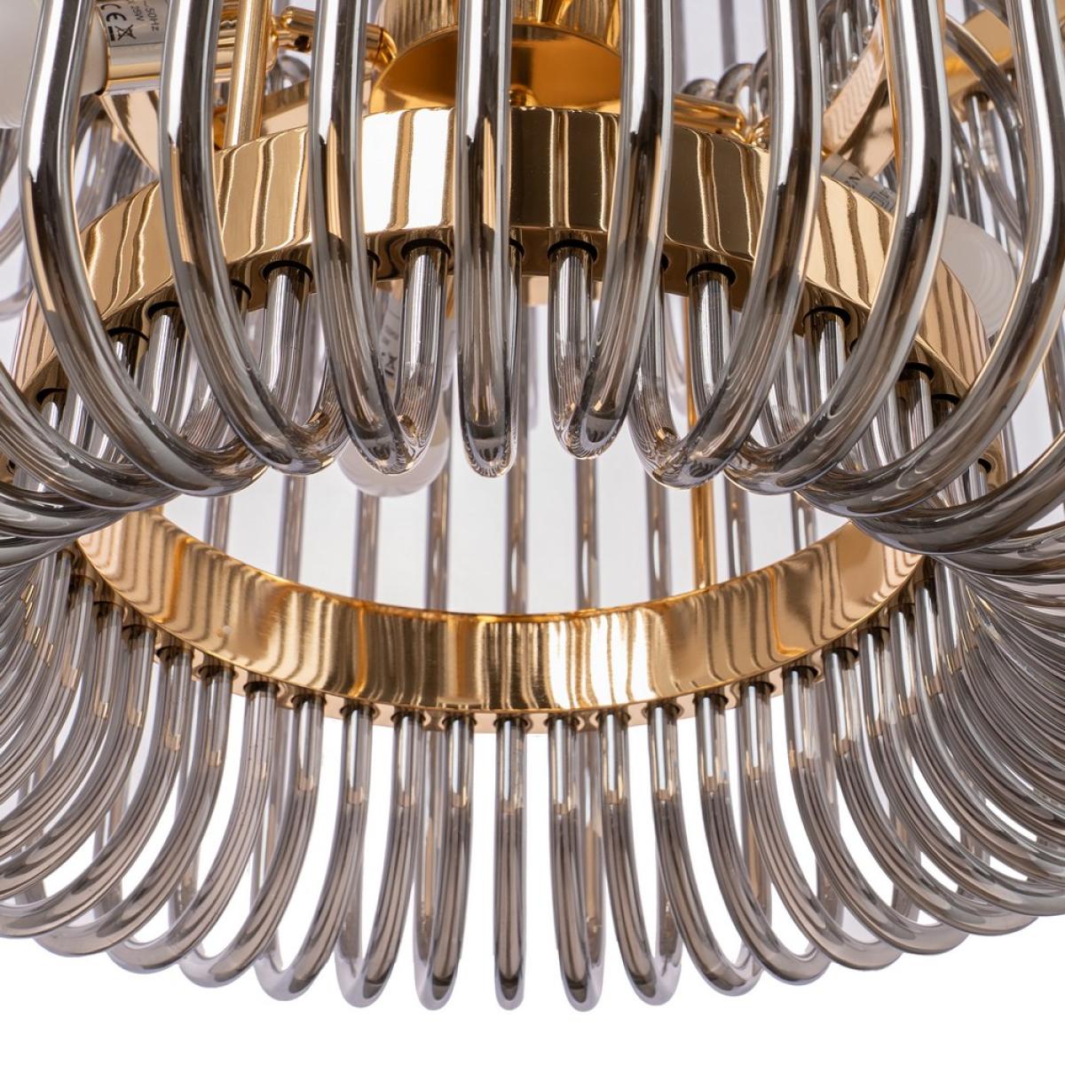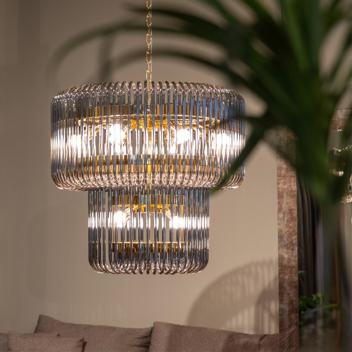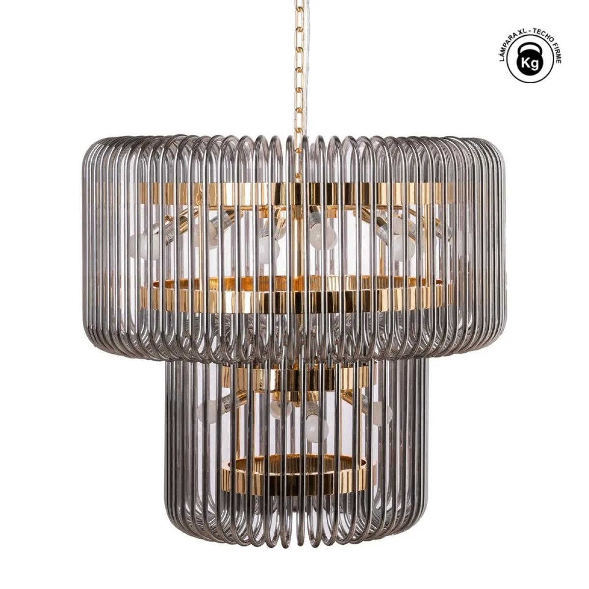 LÁMPARA TECHO ORO-GRIS CRISTAL 80 X 80 X 70 CM Material: cristal, hierro. Voltaje: 220-240V. Casquillos: E14. Bombillas: 16*25W máx (no incluidas). Longitud cadena: 130cm. Se recomienda colgar la lámpara en un techo firme y robusto.
