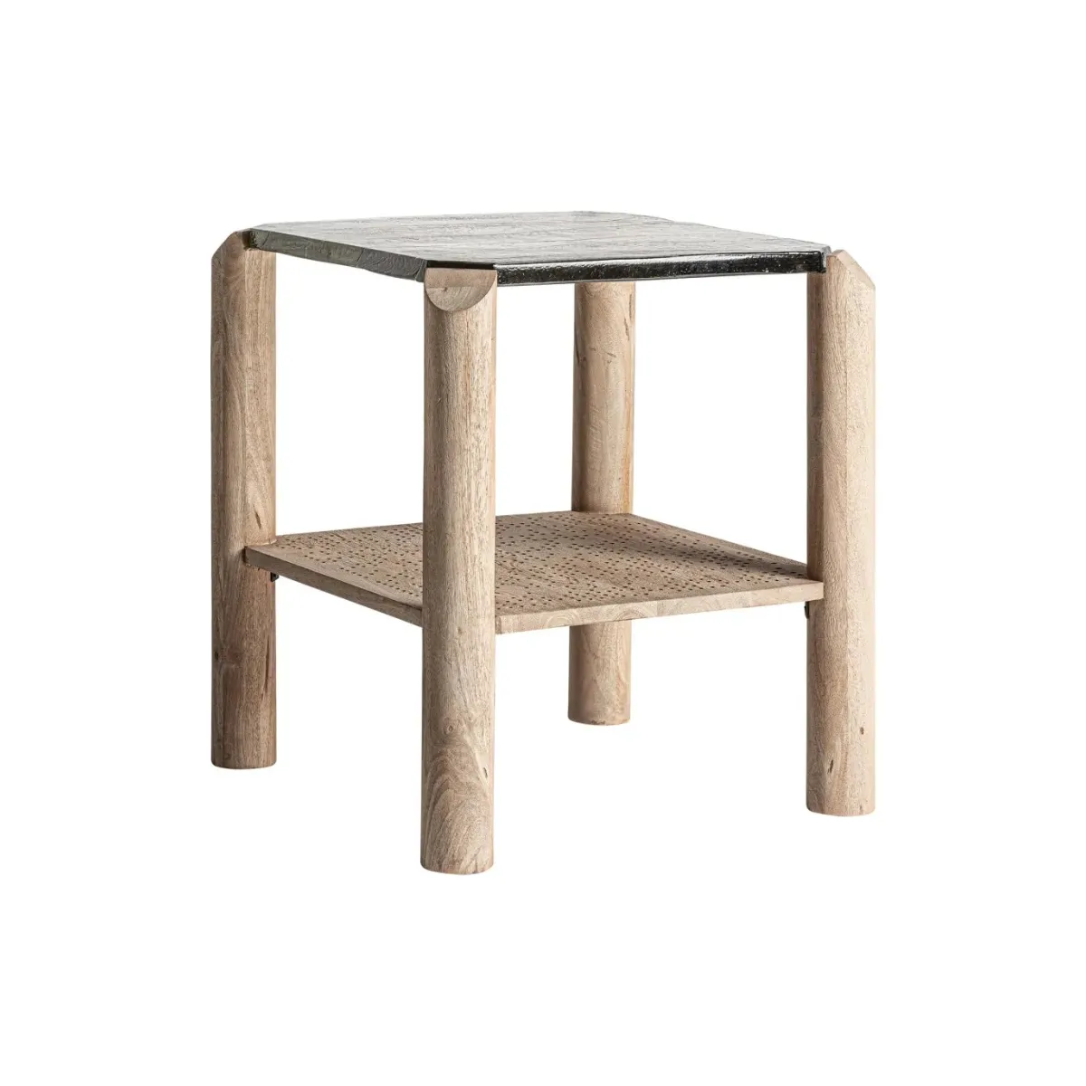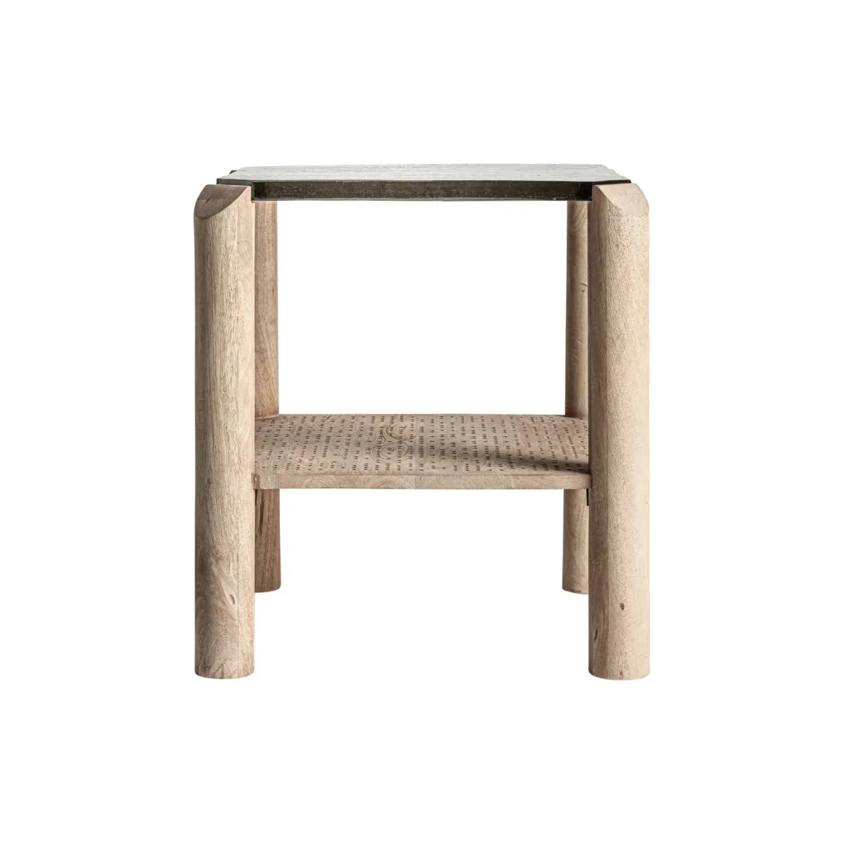 Mesa auxiliar jacquard de estilo contemporáneo. Fabricado en madera de mango en color marrón claro combinado con vidrio en color transparente. Producto desmontable.
