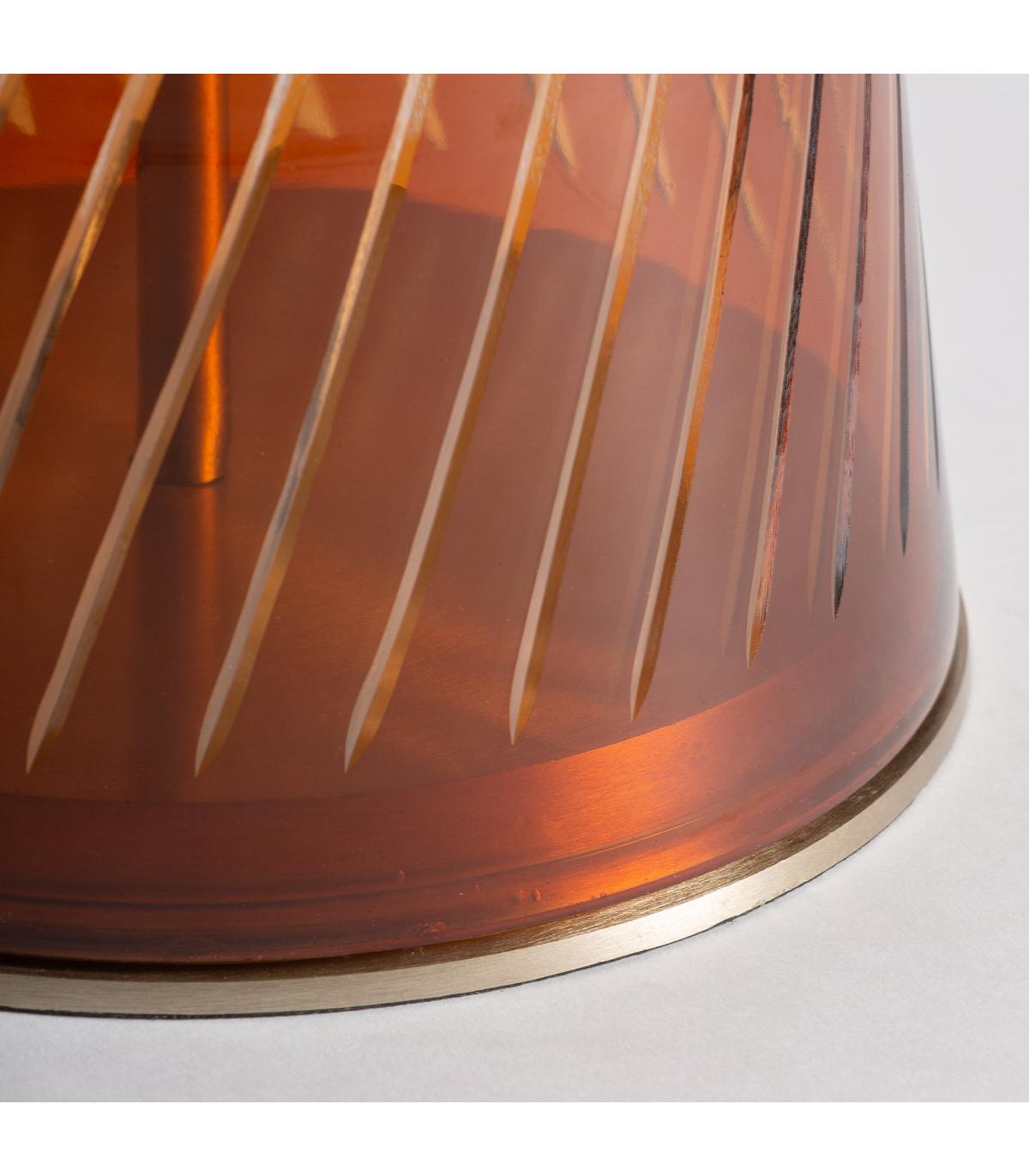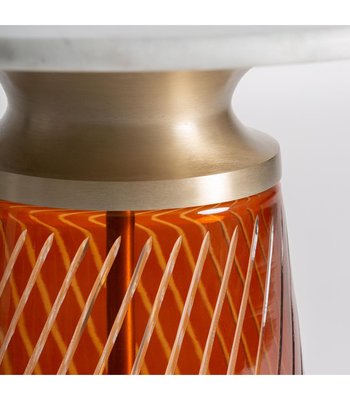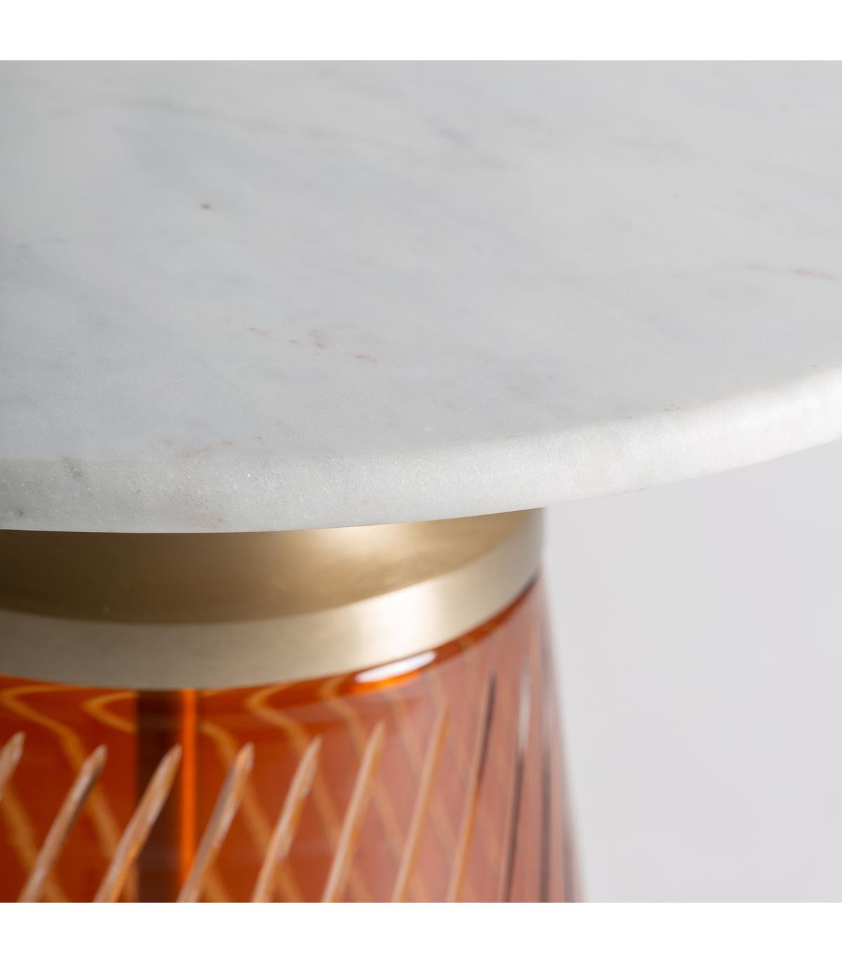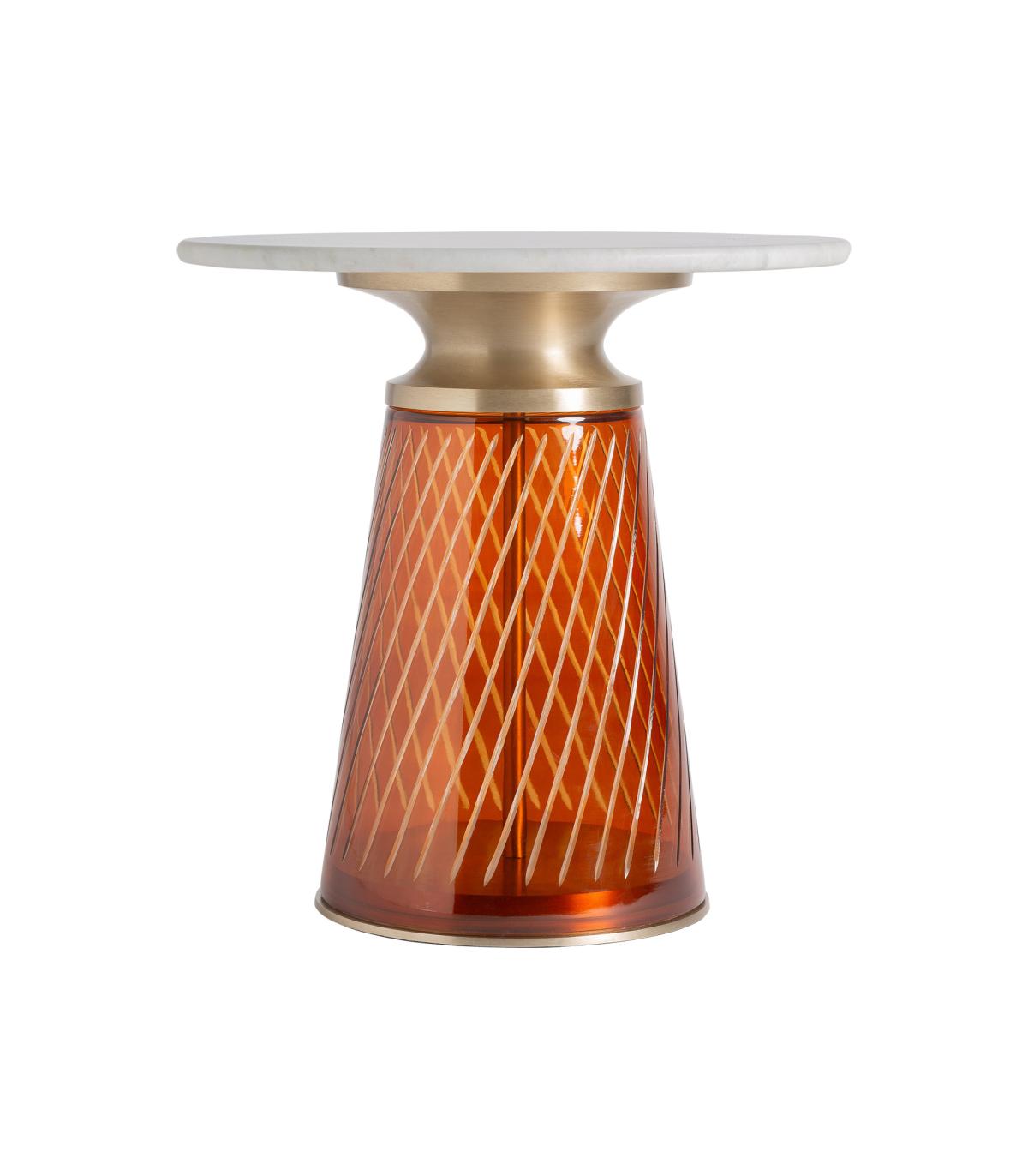 Mesa auxiliar Orvos de estilo art deco fabricado en vidrio en color rojo combinado con mármol en color blanco y acero en color oro.