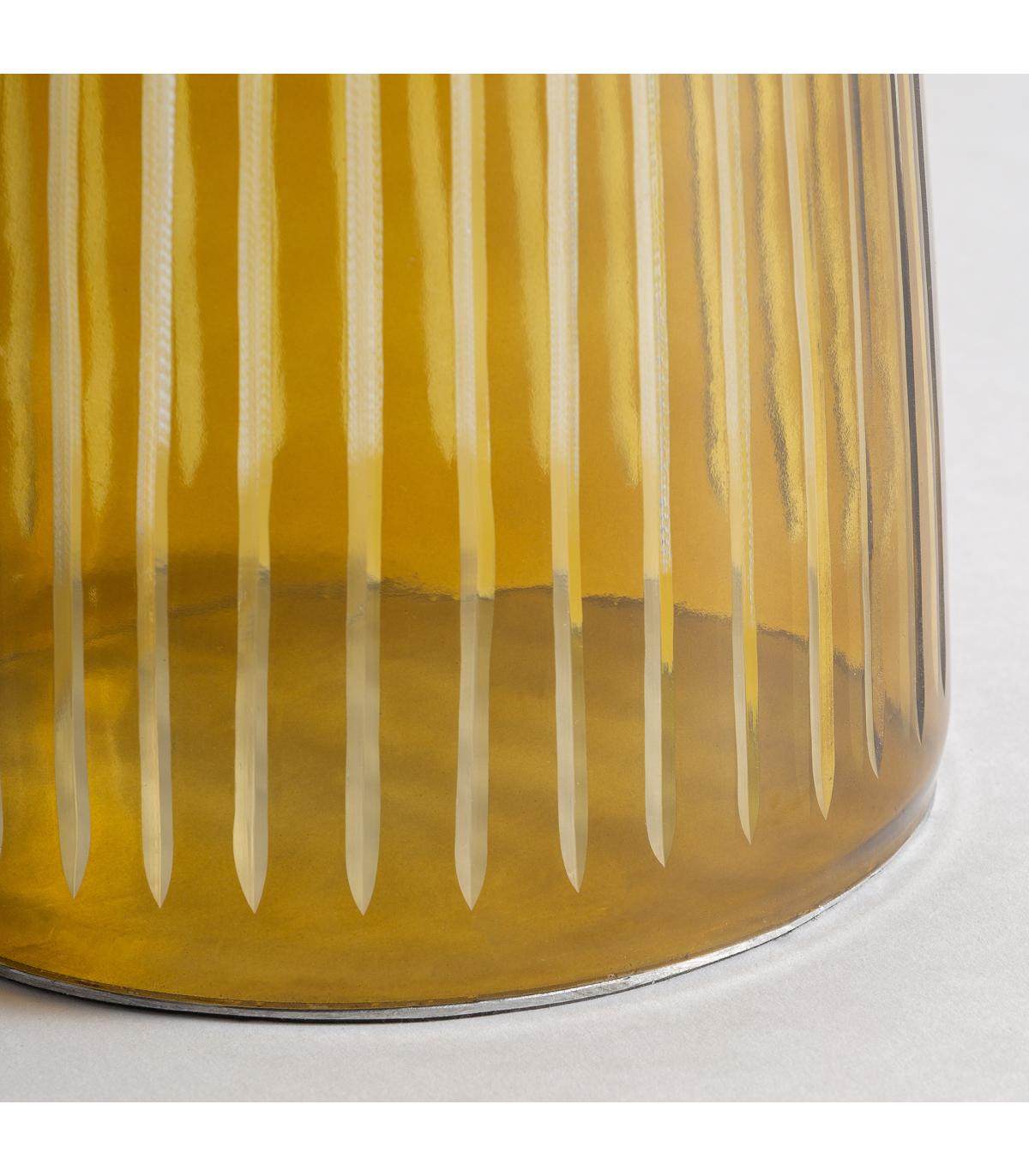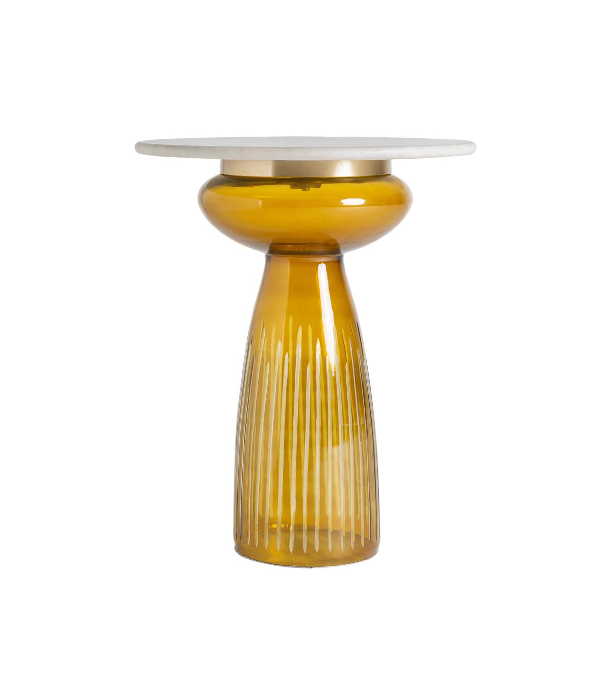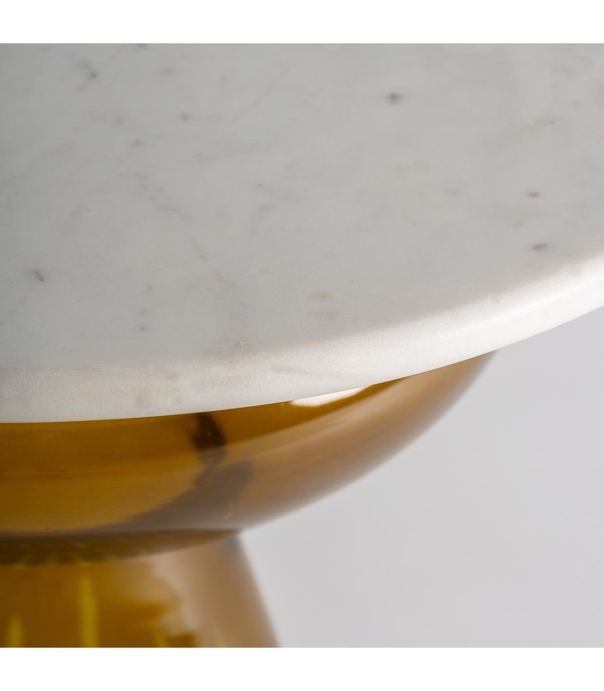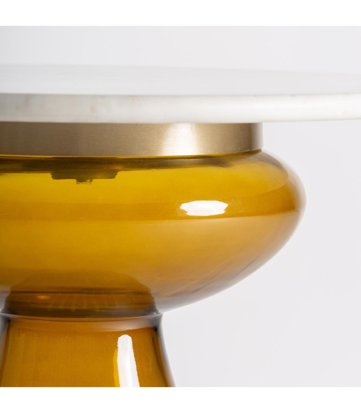 Mesa auxiliar Dalsbida de estilo art deco fabricado en vidrio en color ocre combinado con mármol en color blanco y acero en color oro.