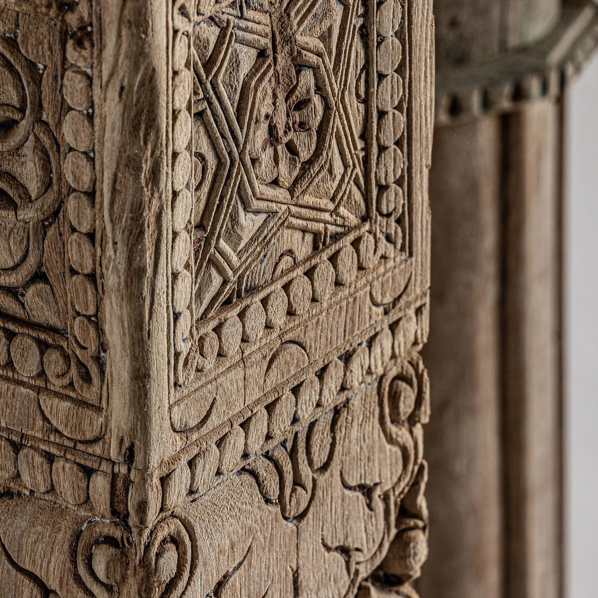 Columna Askale de estilo étnico fabricado en madera de teka en color marrón con acabado envejecido.