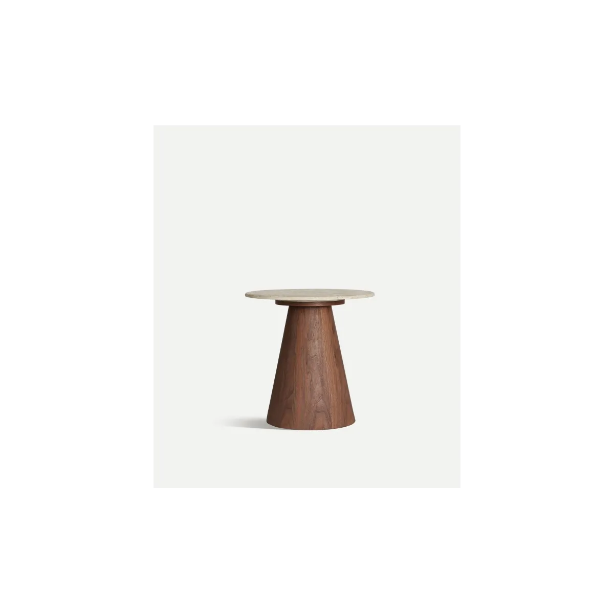 Mesa auxiliar Dune de estilo contemporáneo, fabricado en mármol sintético en color beige, combinado con chapa de nogal en color marrón y madera dm. Producto desmontable.