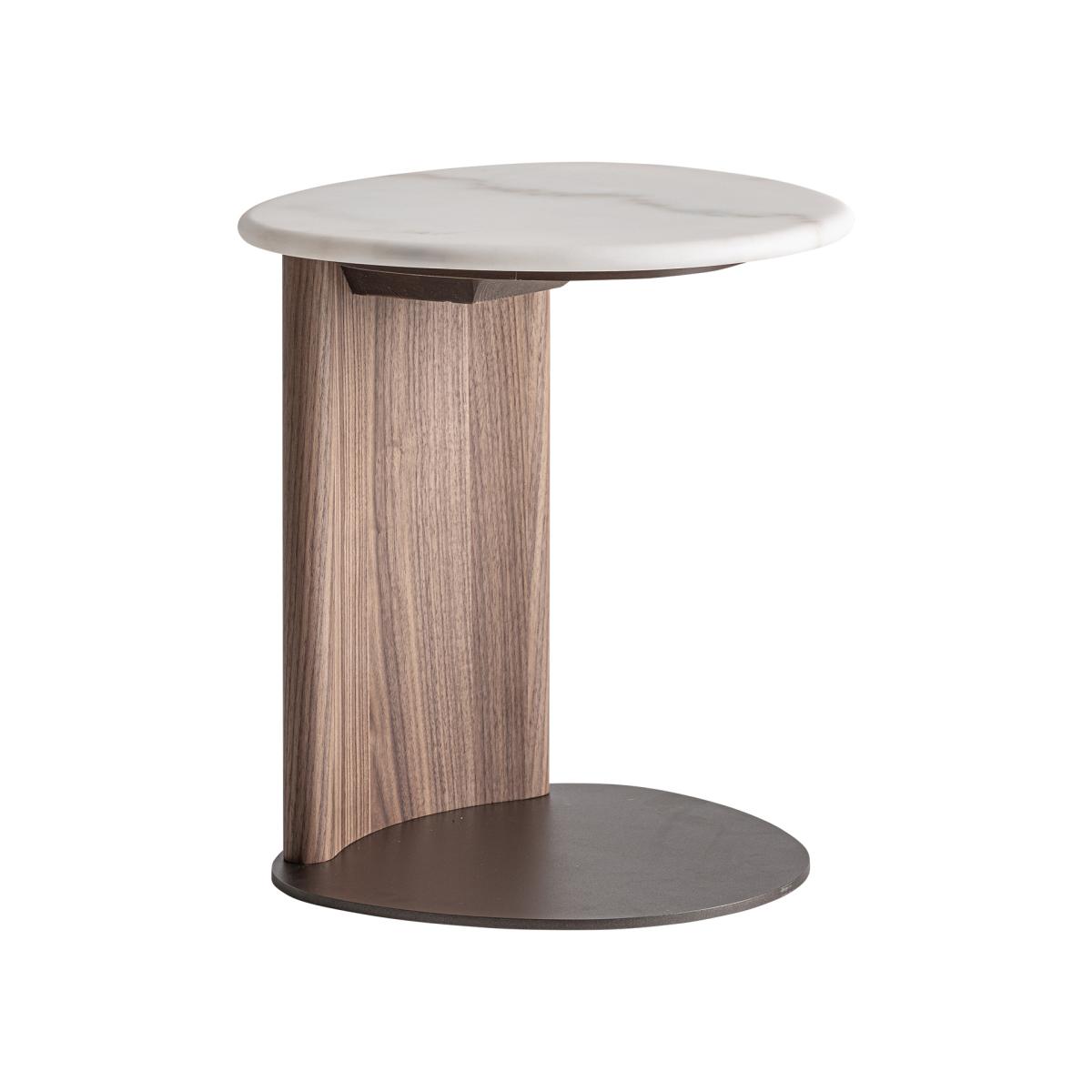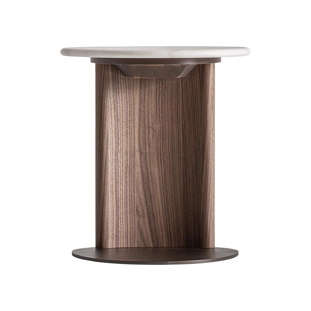 Mesa auxiliar, fabricado en mármol en color blanco, combinado con chapa de nogal en color marrón y hierro en color marrón.