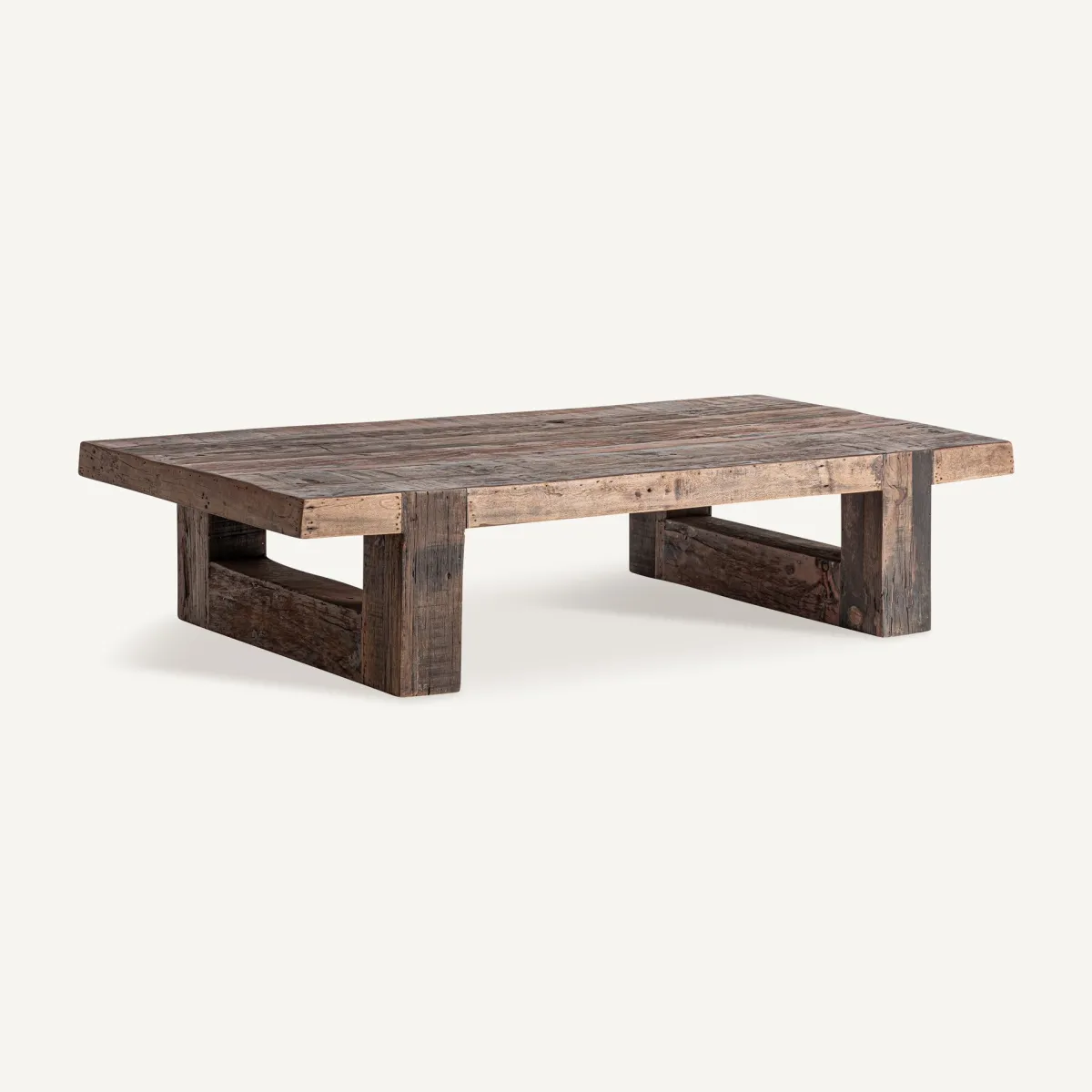 Mesa de centro fabricado en madera recuperada en color marrón.