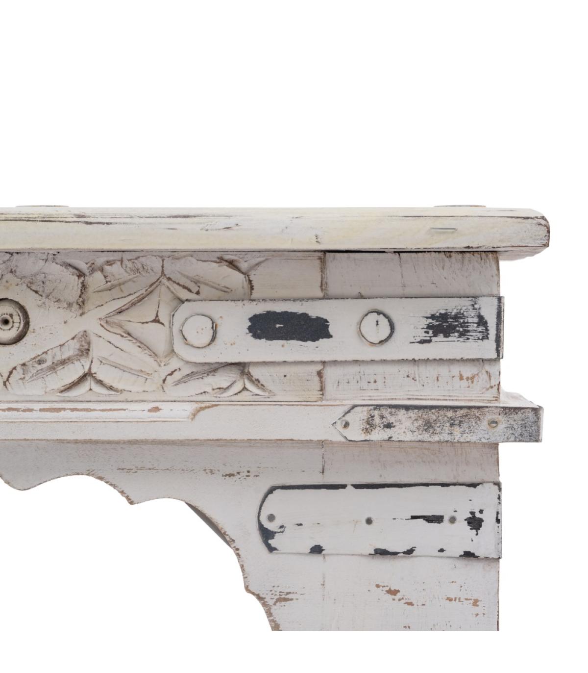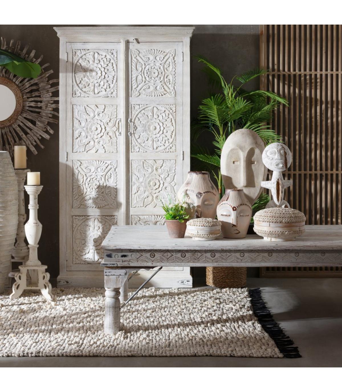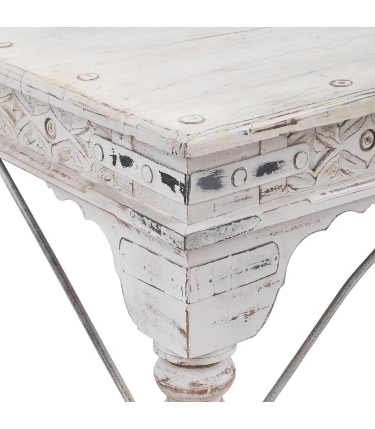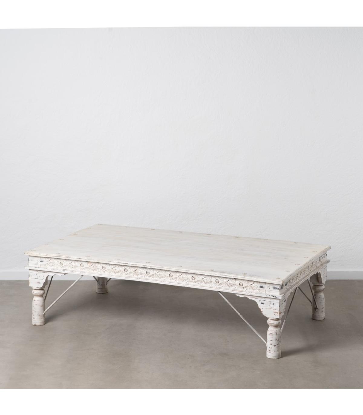 **Carácter orgánico y robustez.** La **Mesa Centro Loft** es el ancla visual de tu salón. Fabricada en madera de mango noble con un sutil acabado blanco rozado, esta pieza de gran formato (177x100 cm) combina la calidez de la materia prima natural con una estética *vintage* refinada.