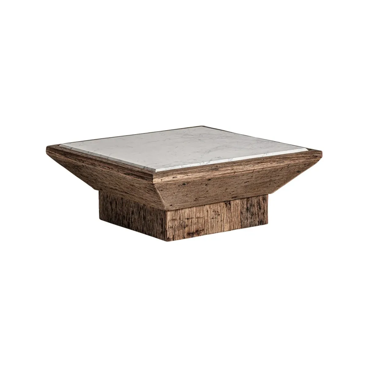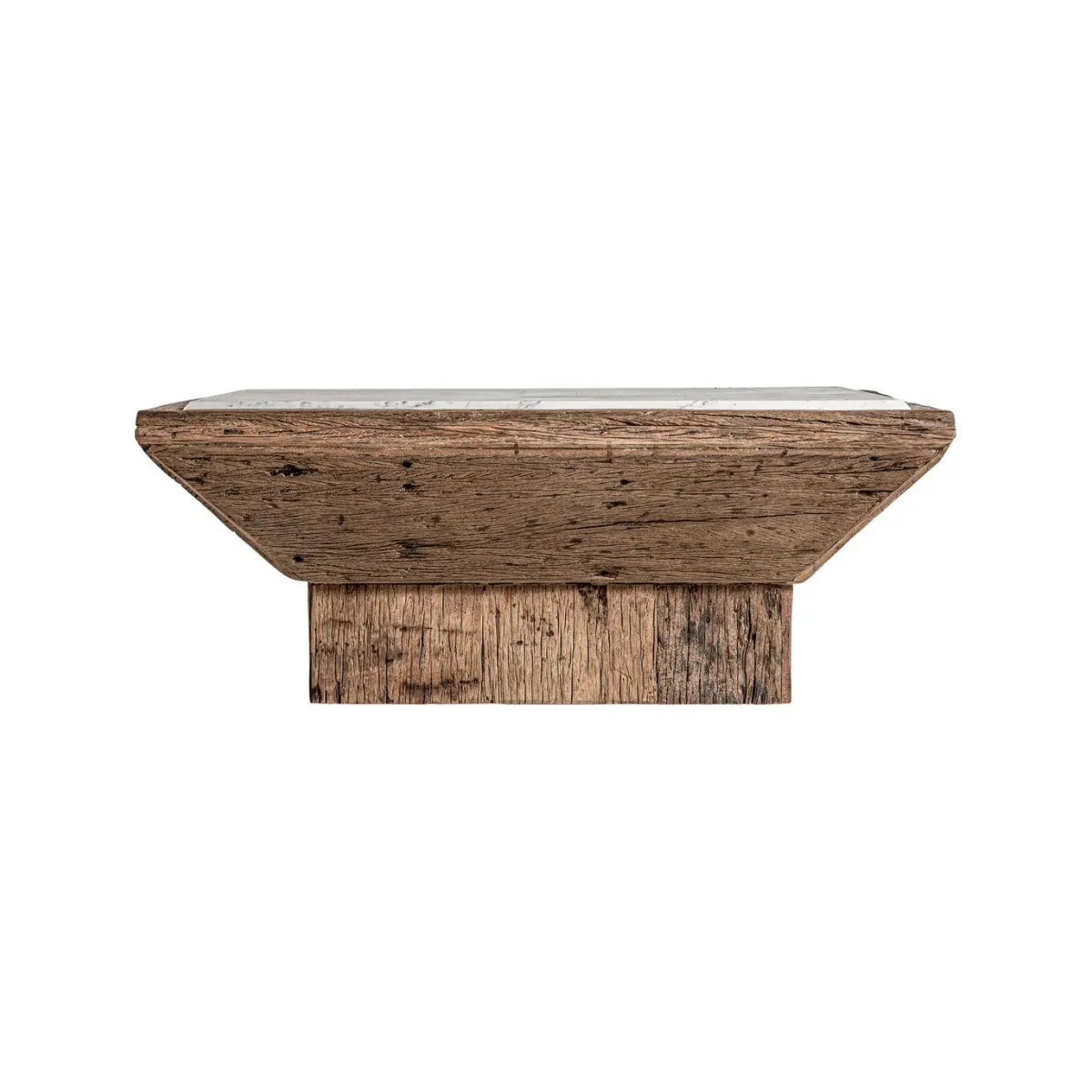 Mesa de centro samsun, en color natural/blanco envejecido, de estilo étnico. Fabricado en madera de pino reciclado, combinado con mármol. Varias maderas: pino, mango, teka, acacia.