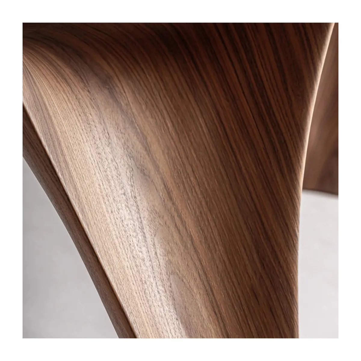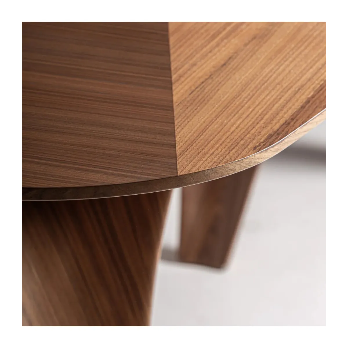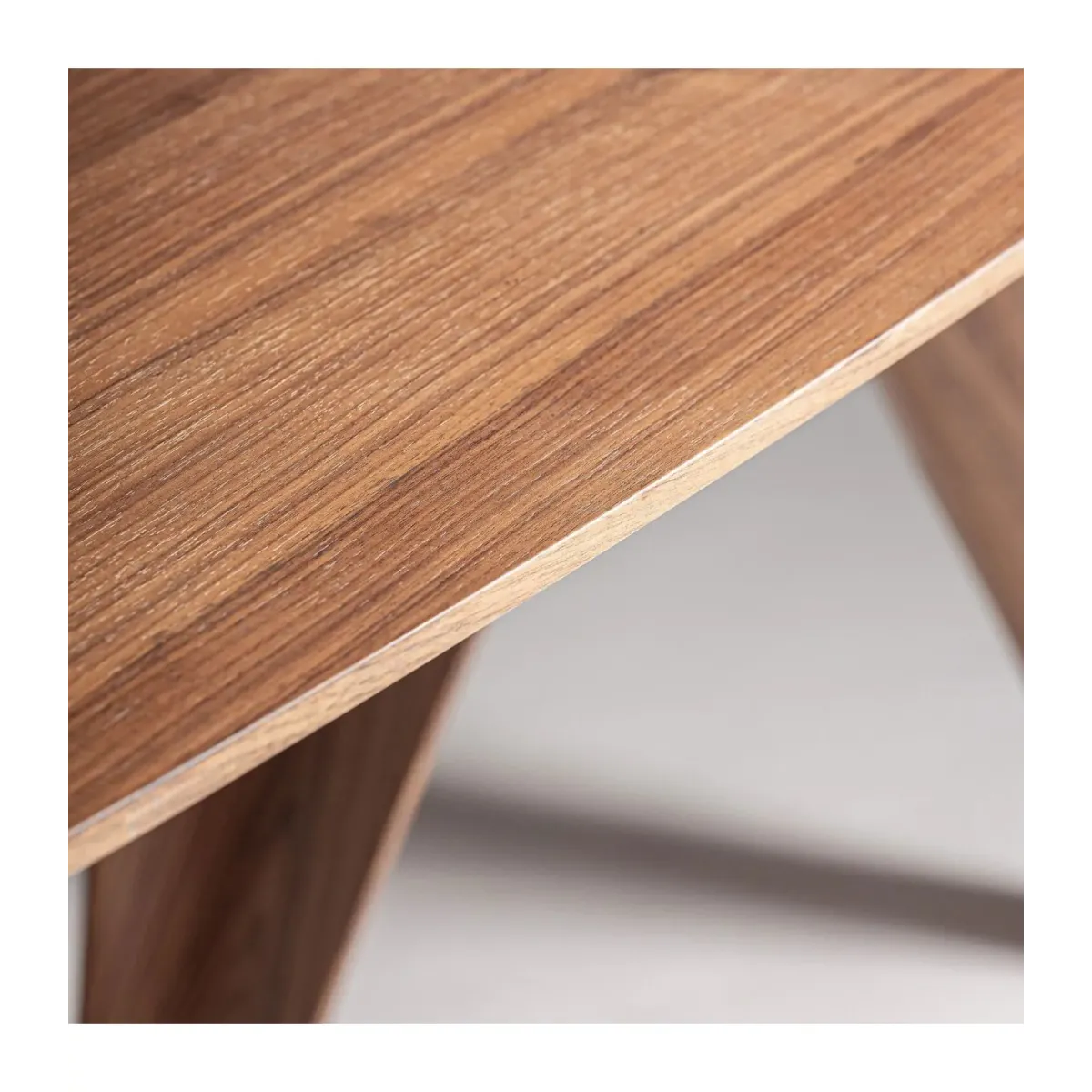 Mesa comedor bilzen de estilo contemporáneo fabricado en chapa de nogal en color marrón con acabado natural combinado con madera dm y fibra de vidrio.