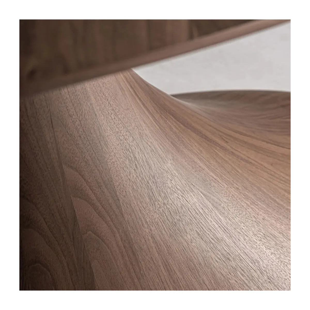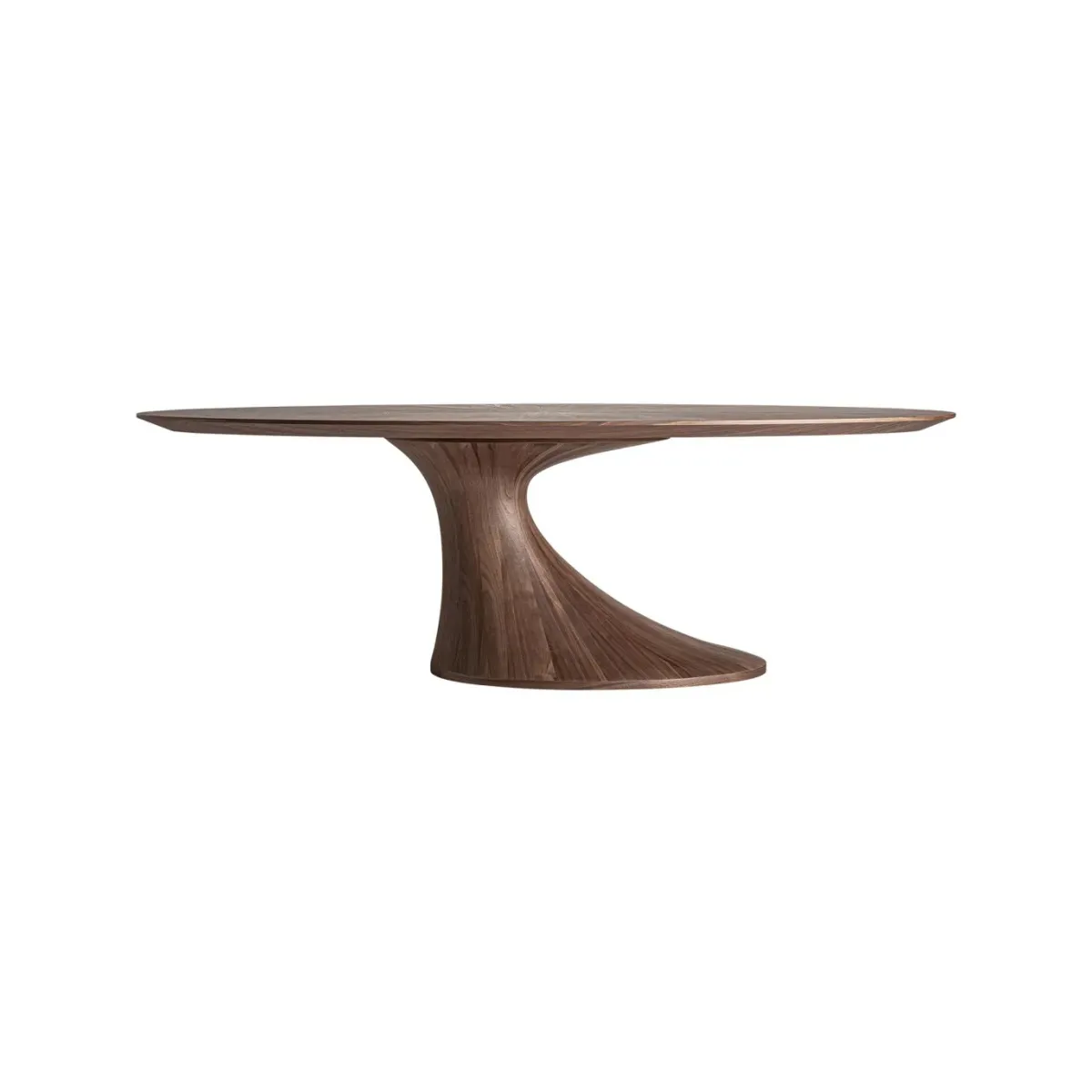 Mesa comedor sittard de estilo contemporáneo fabricado en chapa de nogal en color marrón con acabado natural combinado con madera dm y fibra de vidrio.