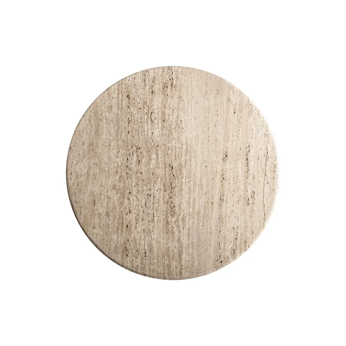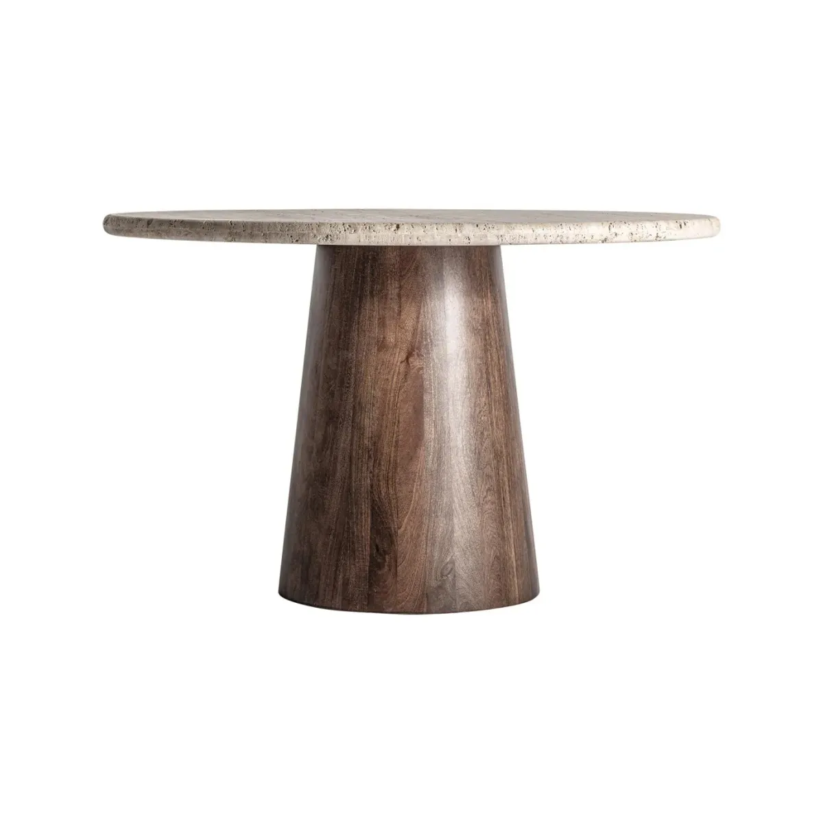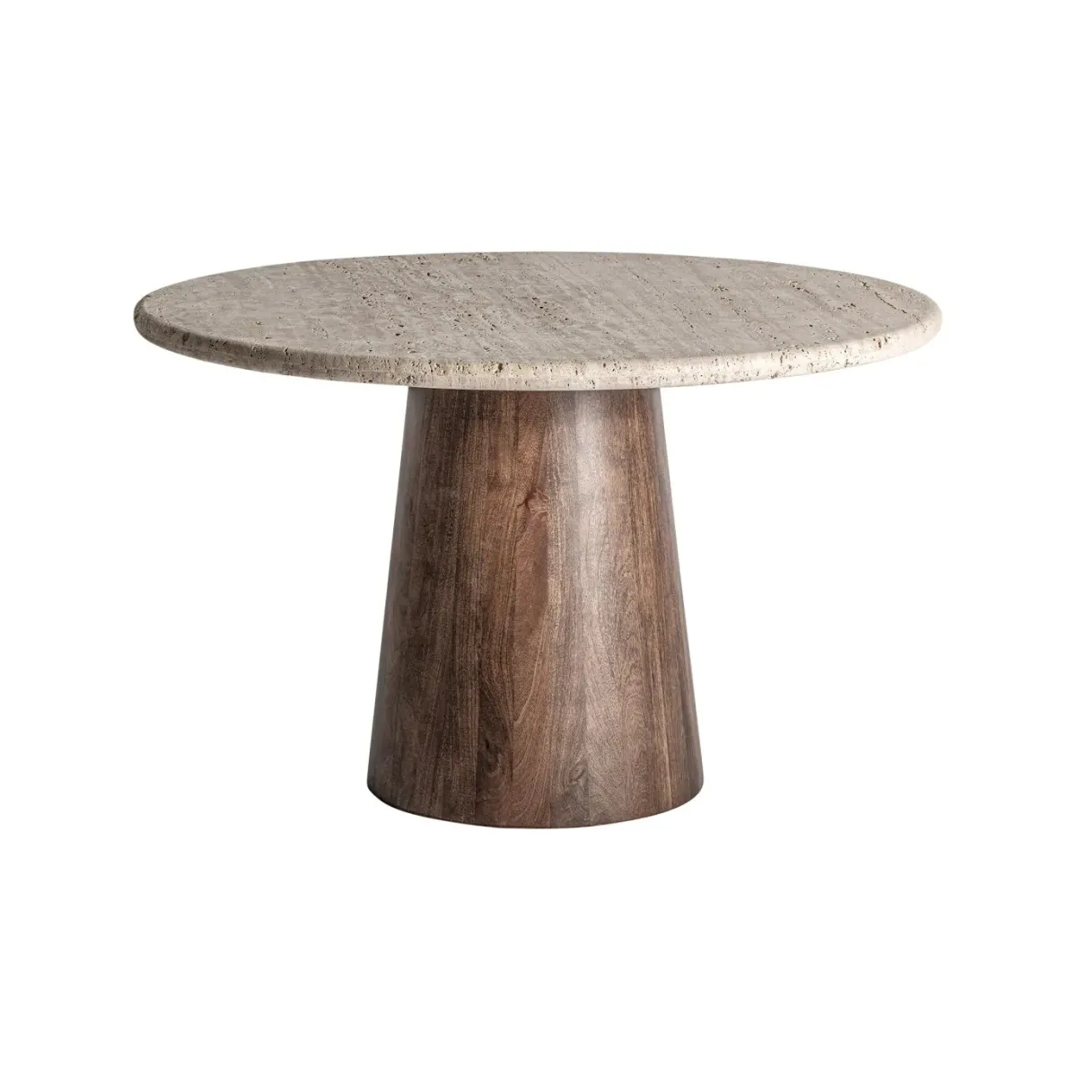 Mesa comedor Varzi de estilo art deco fabricado en travertino en color beige combinado con madera de mango en color marrón. Producto desmontable.