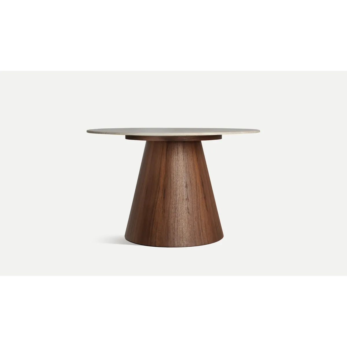 Mesa comedor Dune de estilo contemporáneo, fabricado en mármol sintético en color beige, combinado con chapa de nogal en color marrón y madera dm. Producto desmontable.