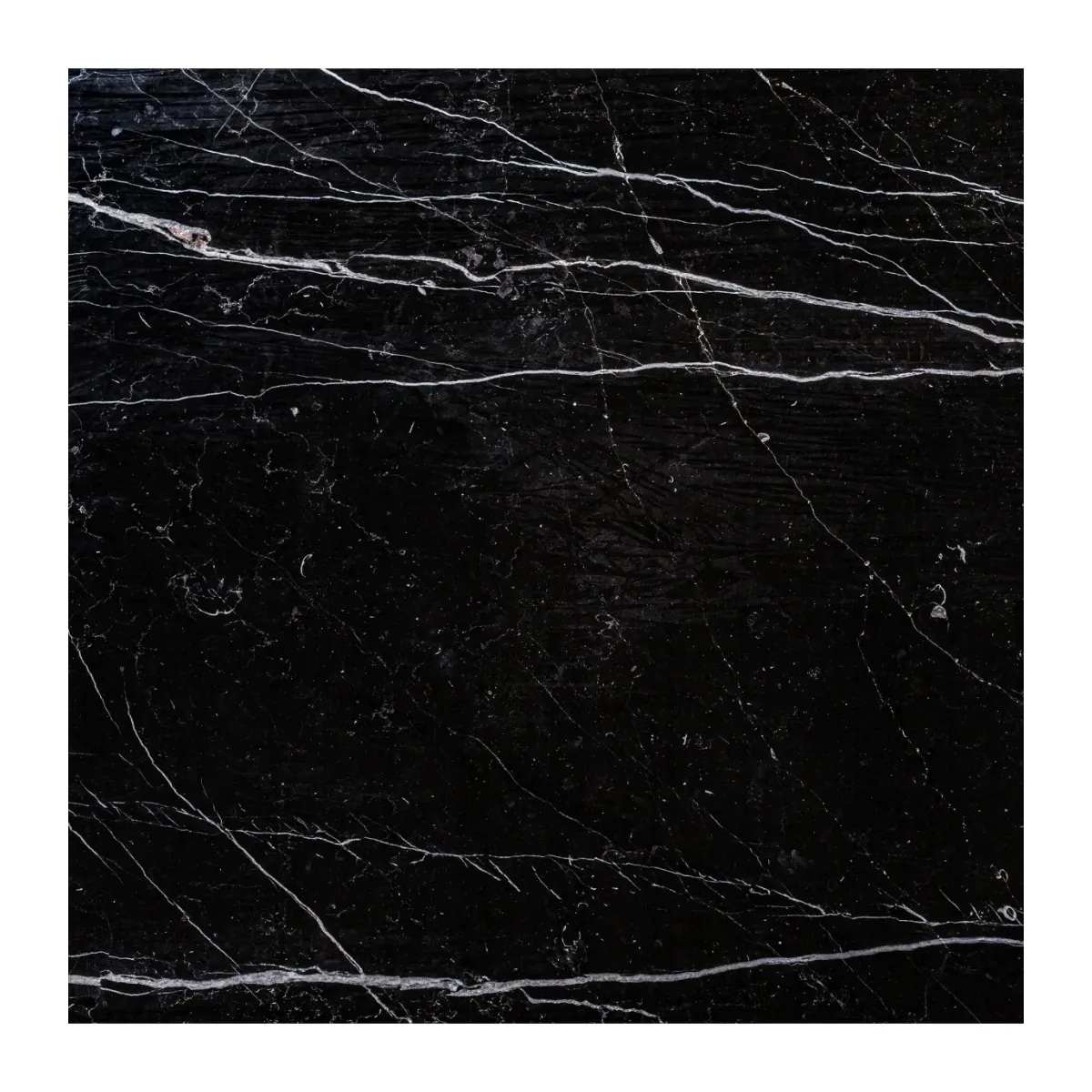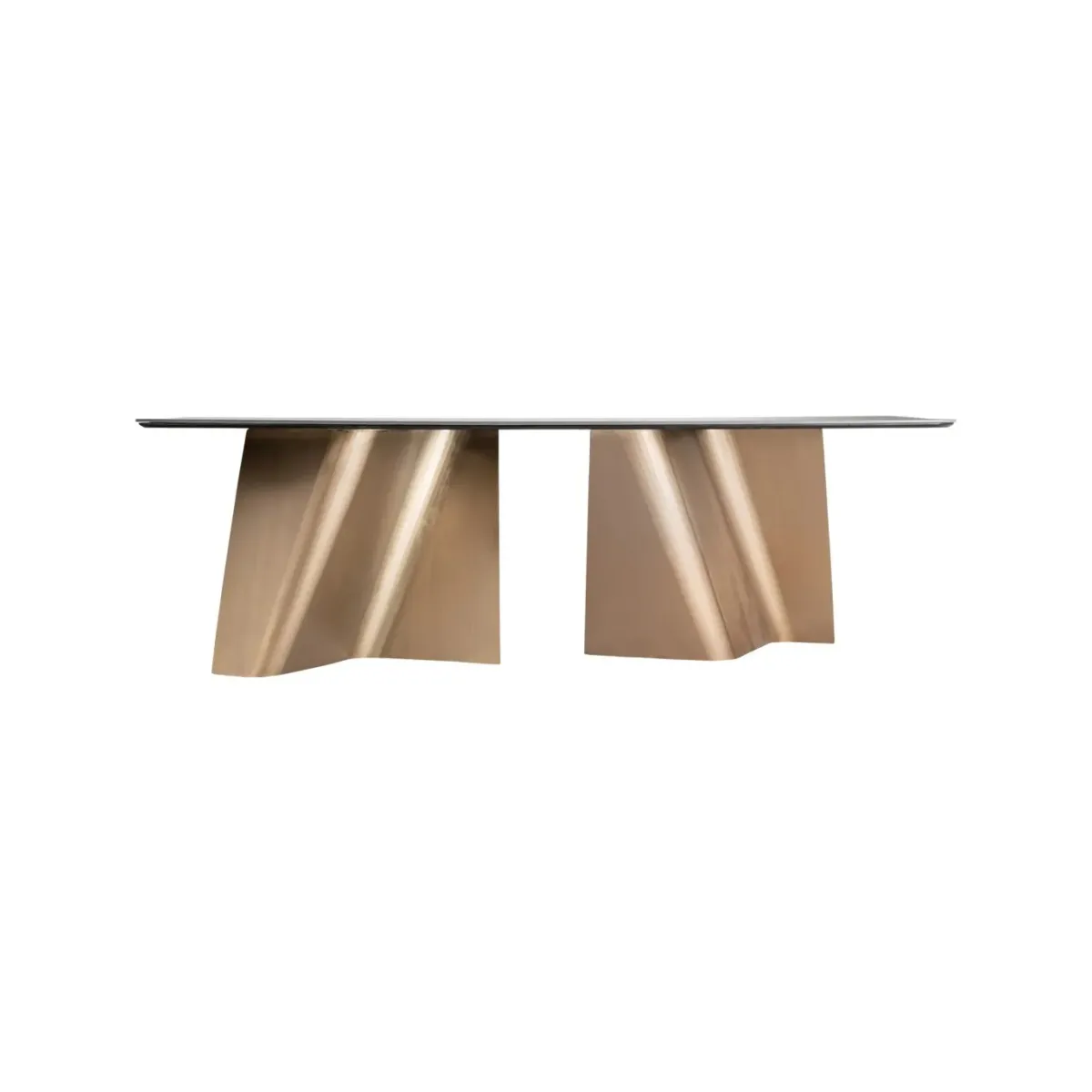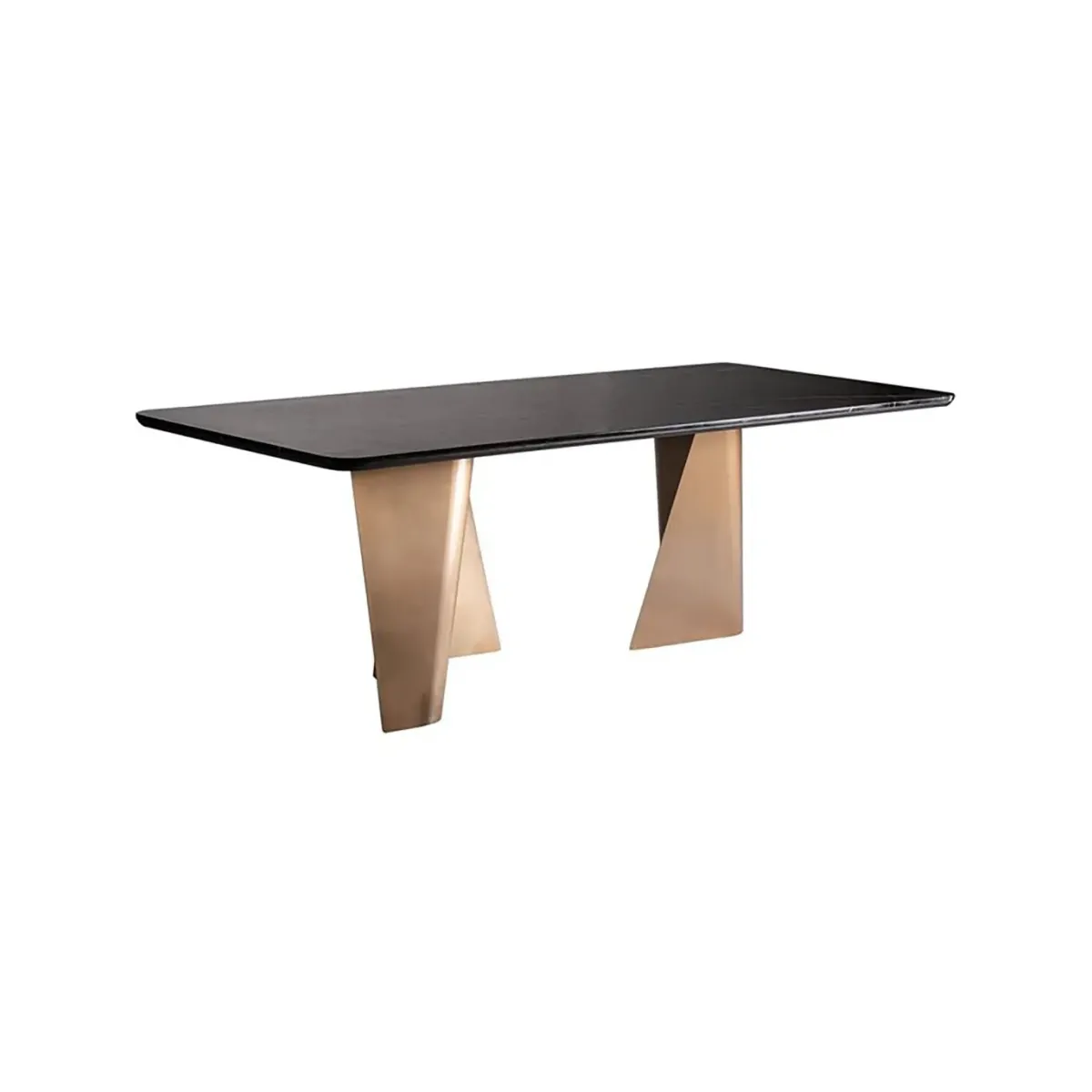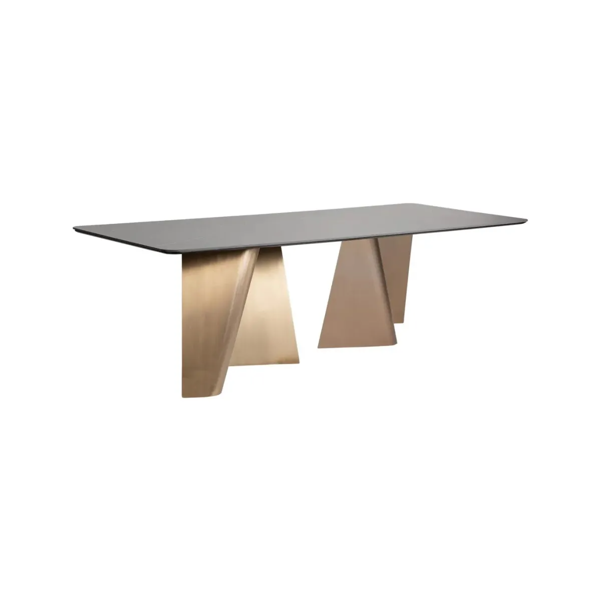 Mesa comedor tux, en color negro/oro, de estilo art deco. Fabricado en porcelánico, combinado con acero.